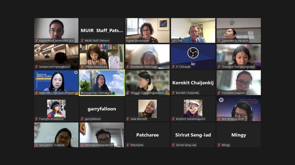 On Tuesday 1st March 2022, Assoc. Prof. Naeti Suksomboon, Vice President for Academic Affairs, provided opening remarks for the professional workshop on “Health Sciences: Train the Trainer Learning Design Workshops” and welcomed participants to the first session of the virtual workshop. The orientation session was delivered by Prof. Garry Falloon, Professor of STEM Education and Digital Learning, and Director of International Engagement at the School of Education, Macquarie University. This continuing workshop is the second series with a strong collaboration between Mahidol University and Macquarie University under the Center for International Education (MCIE). The workshop aims to elaborate on discipline-specific course design, tools, and assessments and concentrate on adult training principles to provide a background to the participants to become trainers themselves. The program consists of three elements, featuring online courses and consulting session in addition to a six-day virtual workshop via Zoom, across 6 days (on 1st, 8th, 15th, 22nd March and 5th April 2022), with 28 academics across Mahidol University participating.