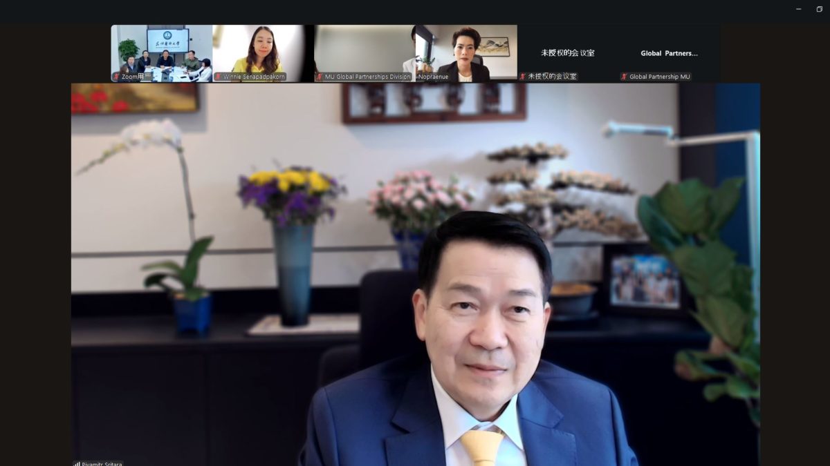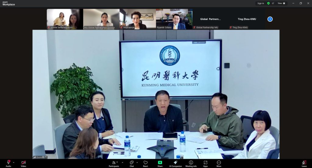 On October 8, 2025, Professor Dr. Piyamitr Sritara, MD, FRCP President of Mahidol University, together with Associate Professor Napraenue Sajjarax Dhirathiti, Vice President for Global Partnerships and University Council, attend the virtual meeting with the executive leadership of Kunming Medical University, People’s Republic of China.