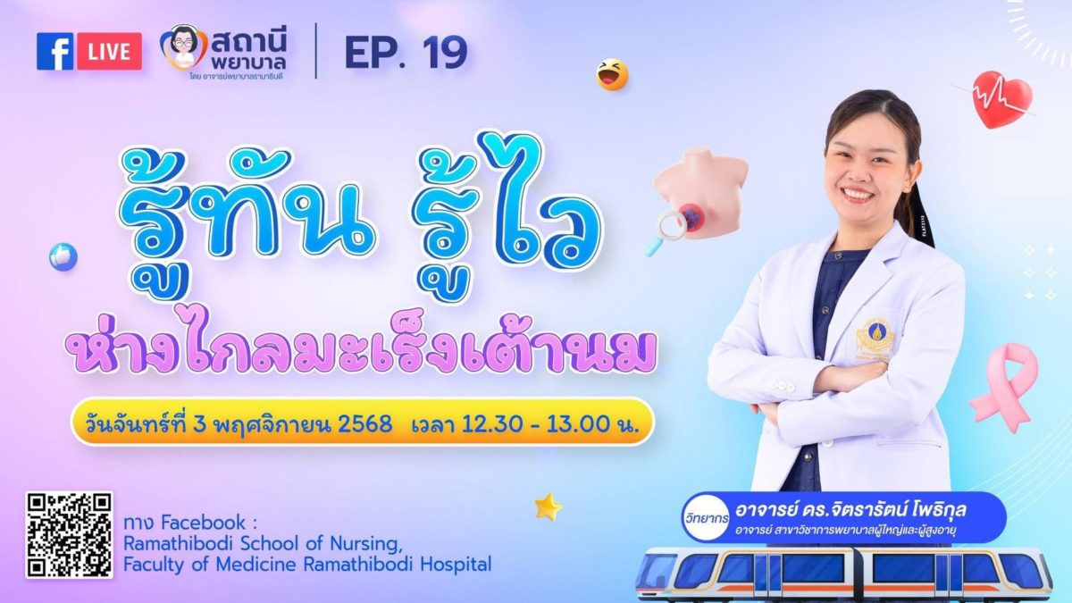 On November 3, 2025, Ramathibodi School of Nursing, Faculty of Medicine Ramathibodi Hospital, Mahidol University, hosted “Nurse Station” Episode 19: “Be Aware, Detect Early, Prevent Breast Cancer.” The episode was presented by Dr. Jittrarath Phothikul, an Instructor from the Division of Adult and Gerontological Nursing, Ramathibodi School of Nursing, Faculty of Medicine Ramathibodi Hospital, Mahidol University.