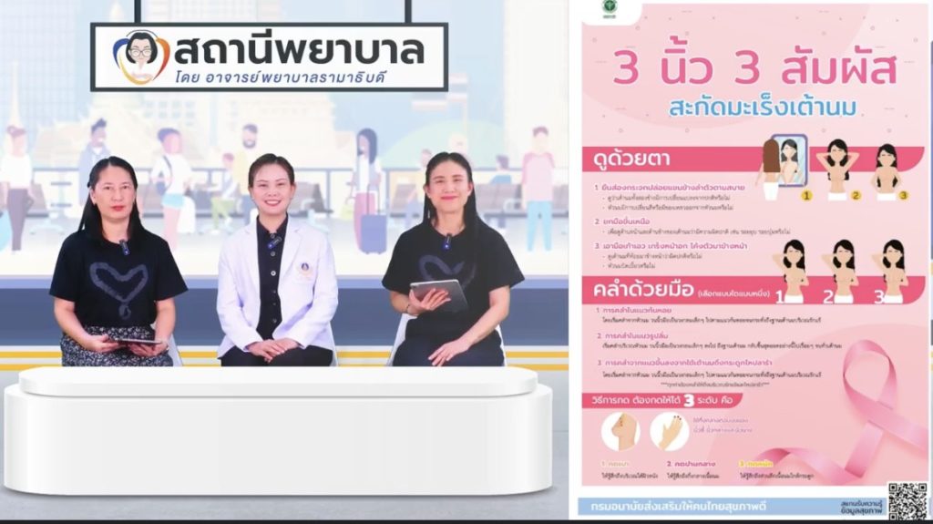 On November 3, 2025, Ramathibodi School of Nursing, Faculty of Medicine Ramathibodi Hospital, Mahidol University, hosted “Nurse Station” Episode 19: “Be Aware, Detect Early, Prevent Breast Cancer.” The episode was presented by Dr. Jittrarath Phothikul, an Instructor from the Division of Adult and Gerontological Nursing, Ramathibodi School of Nursing, Faculty of Medicine Ramathibodi Hospital, Mahidol University.