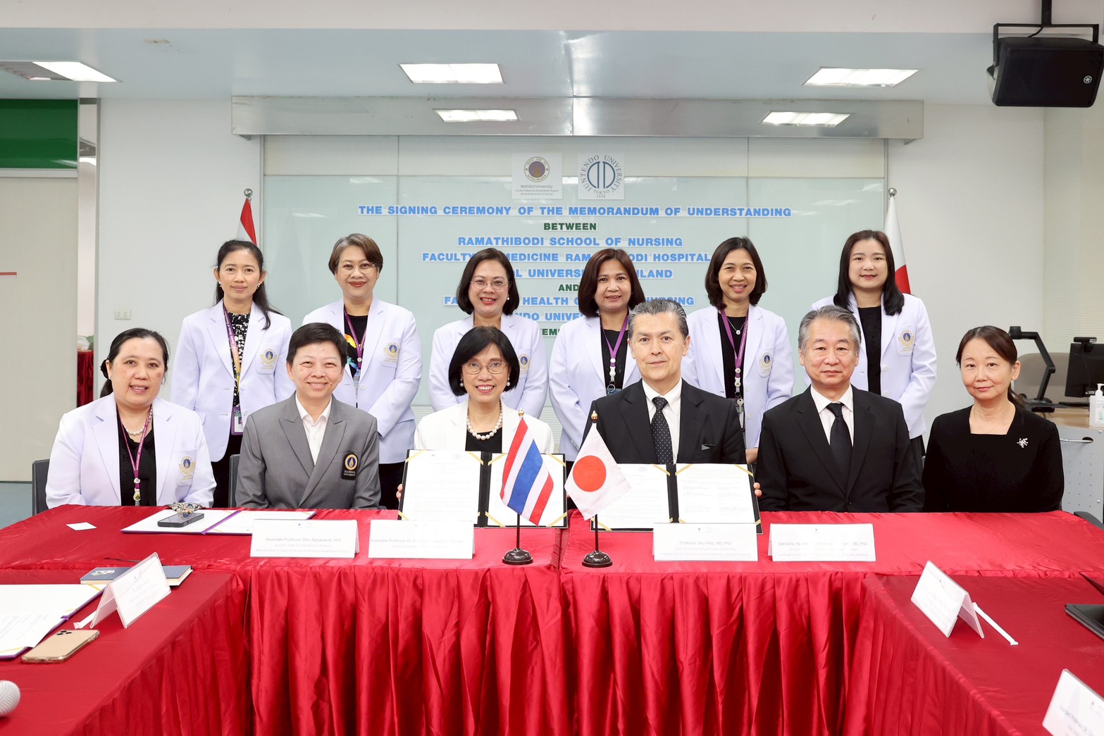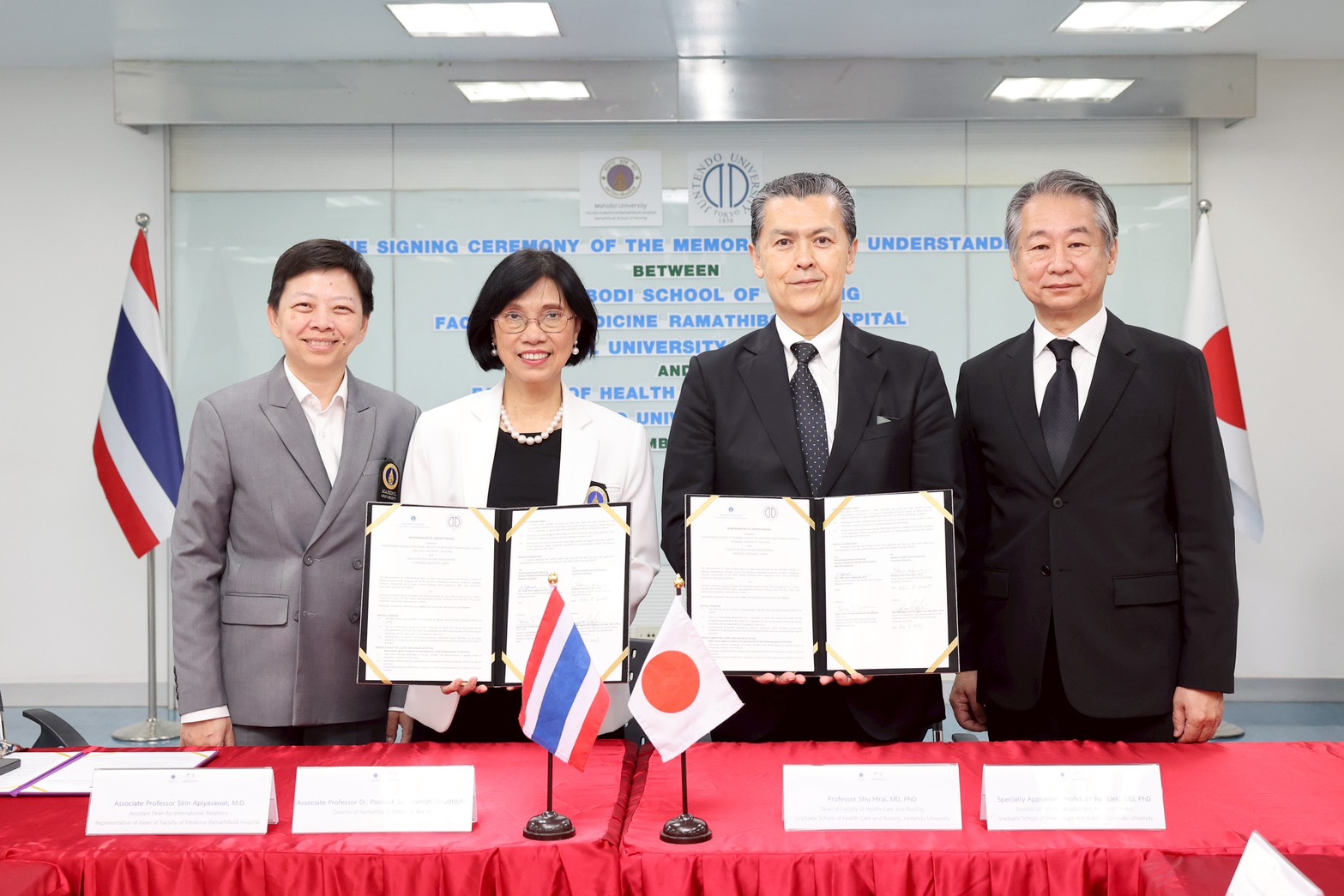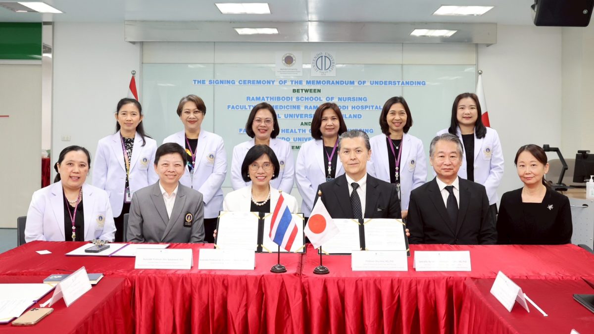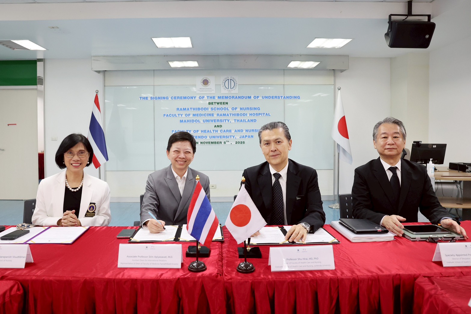On November 5, 2025, Associate Professor Dr. Poolsuk Janepanish Visudtibhan, Director of Ramathibodi School of Nursing, Faculty of Medicine Ramathibodi Hospital, Mahidol University, together with Professor Shu Hirai, MD, PhD, Dean, Faculty of Health Care and Nursing, Juntendo University, Japan, formally signed a Memorandum of Understanding (MOU) on academic collaboration. On this occasion, Associate Professor Sirin Apiyasawat, M.D., Assistant Dean for International Relations, representative of the Dean of Faculty of Medicine Ramathibodi Hospital, Mahidol University, presided over the ceremony. The signing ceremony was witnessed by administrators, faculty members, and staff from Ramathibodi School of Nursing, a representative from the International Relations Sector, Faculty of Medicine Ramathibodi Hospital, Mahidol University, and a representative from the Faculty of Health Care and Nursing, Juntendo University, Japan.