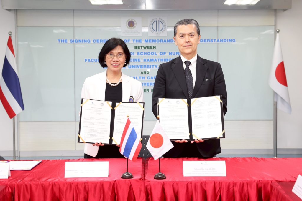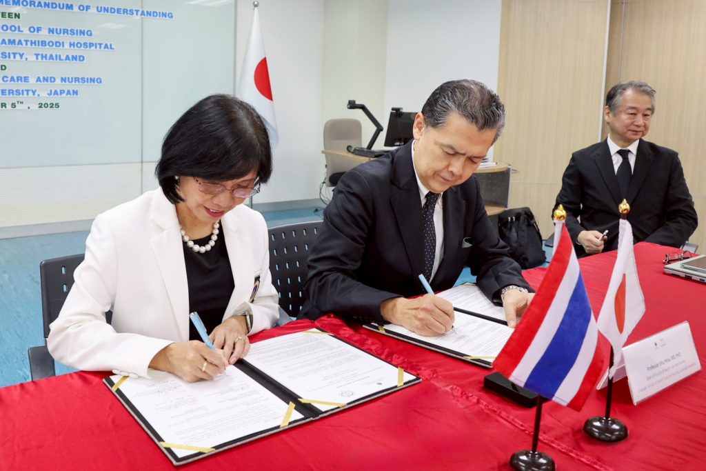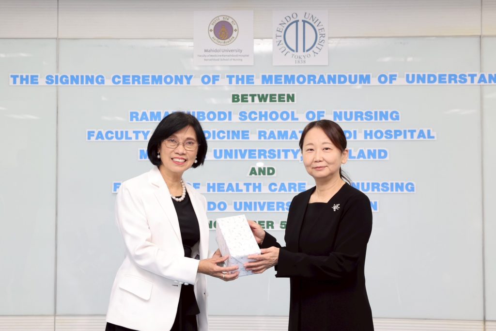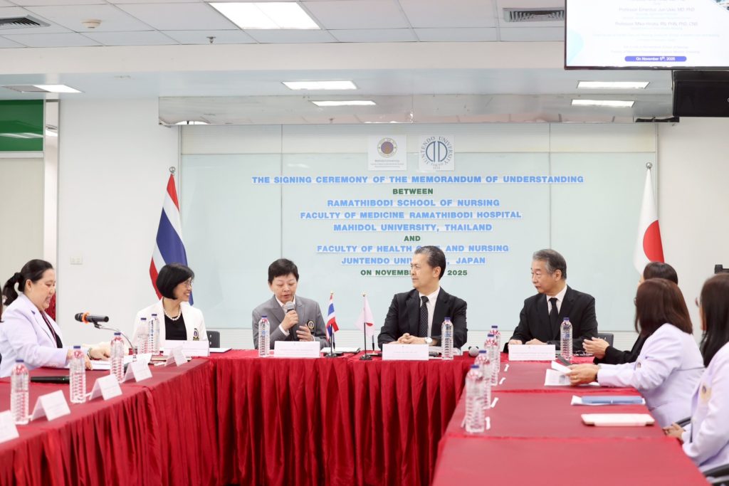 On November 5, 2025, Associate Professor Dr. Poolsuk Janepanish Visudtibhan, Director of Ramathibodi School of Nursing, Faculty of Medicine Ramathibodi Hospital, Mahidol University, together with Professor Shu Hirai, MD, PhD, Dean, Faculty of Health Care and Nursing, Juntendo University, Japan, formally signed a Memorandum of Understanding (MOU) on academic collaboration. On this occasion, Associate Professor Sirin Apiyasawat, M.D., Assistant Dean for International Relations, representative of the Dean of Faculty of Medicine Ramathibodi Hospital, Mahidol University, presided over the ceremony. The signing ceremony was witnessed by administrators, faculty members, and staff from Ramathibodi School of Nursing, a representative from the International Relations Sector, Faculty of Medicine Ramathibodi Hospital, Mahidol University, and a representative from the Faculty of Health Care and Nursing, Juntendo University, Japan.