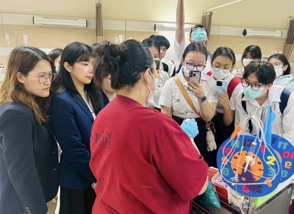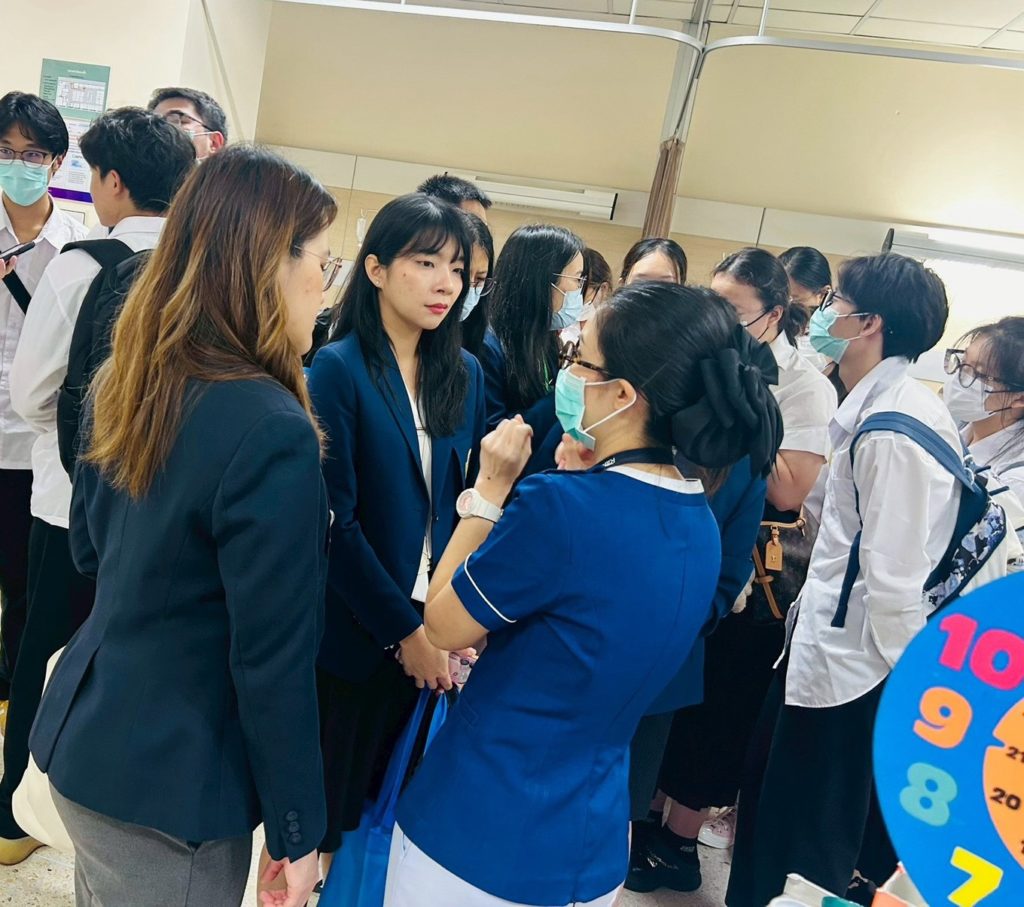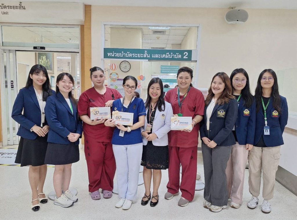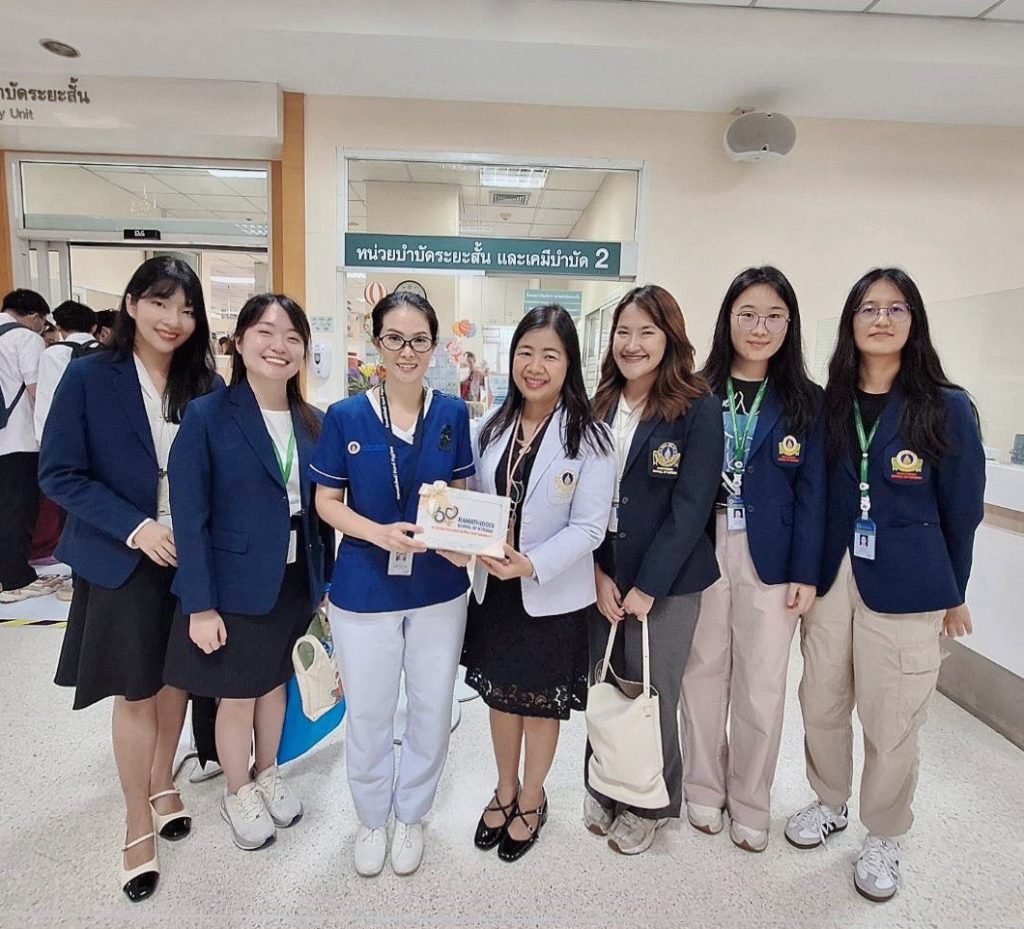The purpose of this study visit was to enable students to learn about ward and staff management, nursing leadership, the application of nursing innovations in service delivery, and the management of health services within a unit, based on field experience in a healthcare setting. The study visit was honored by Ms. Yaowarat Chantraporn (Head of the Short-Term Treatment and Chemotherapy Unit 2), Ms. Saowalak Saengchanchai, and Ms. Jirarat Choonui (staff nurses of the unit), who provided lectures and led the ward visit.