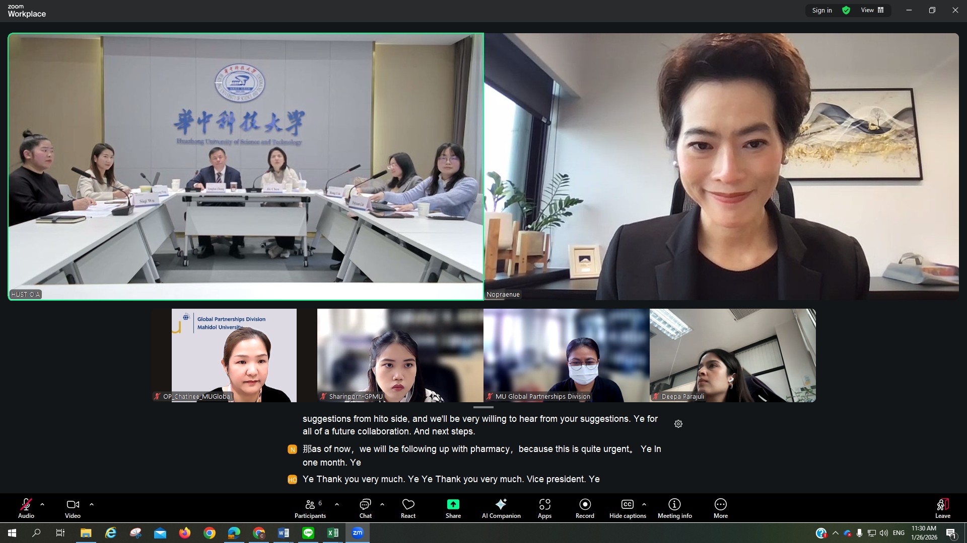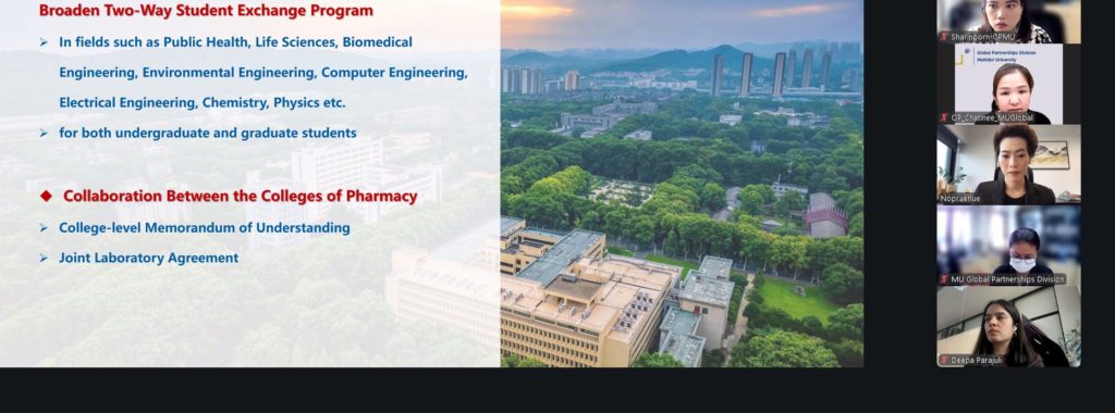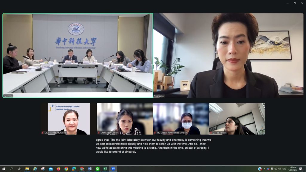 On 26 January 2026, Assoc. Prof. Nopraenue Sajjarax Dhirathiti, Ph.D. Vice President for Global Partnerships and University Council of Mahidol University, participated in an online meeting with the senior executives of Huazhong University of Science and Technology, People’s Republic of China. The delegation from Huazhong University of Science and Technology was led by Prof. Yonghui Zhang, Vice President for International Affairs.