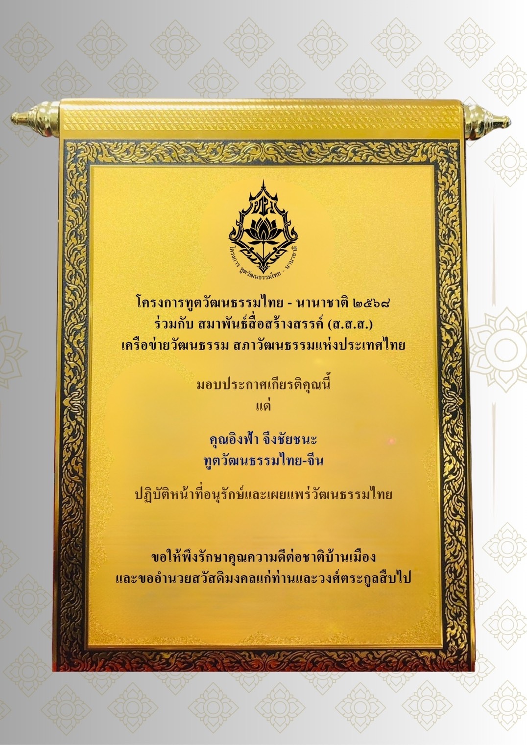 This prestigious honor was bestowed on January 25, 2026, by the Thai-International Cultural Ambassador Project in collaboration with the Creative Media Confederation and the Cultural Network of the Provincial Cultural Council of Thailand.