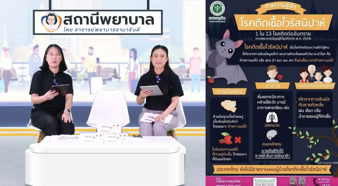 The sections “Talk to Nurses,” “Q&A,” and “Nursing (Not-So-Secret) Tips” focused on the topic “Get to Know Nipah Virus,” were led by Assistant Professor Dr. Piyawadee Thongyost, Assistant Director for Corporate Communication and Instructor from the Division of Adult and Gerontological Nursing, along with Dr. Siriporn Nirapun, Instructor from the Division of Pediatric Nursing, Ramathibodi School of Nursing.