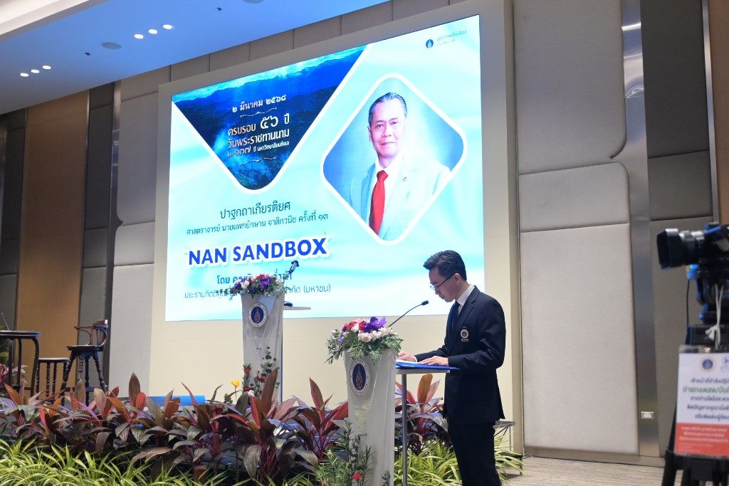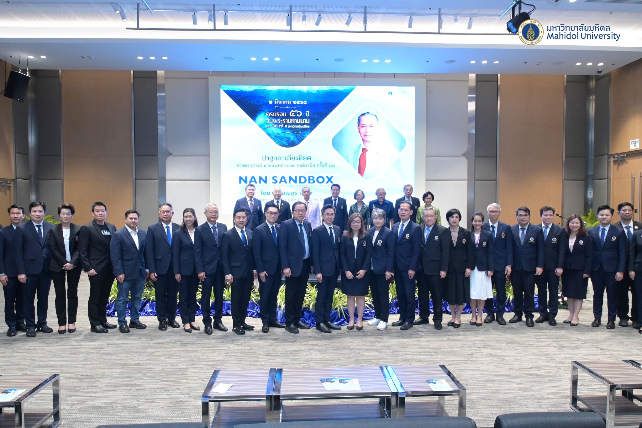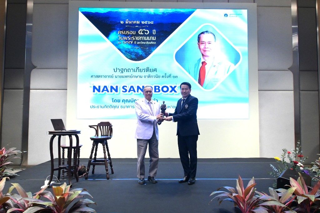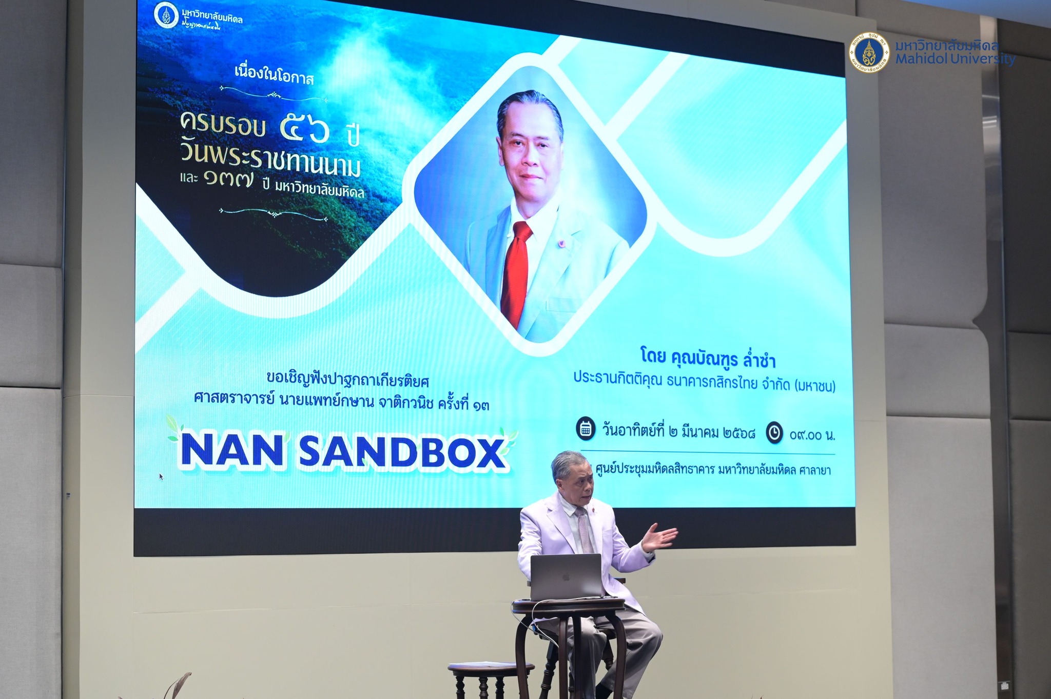 จากนั้นเป็นกิจกรรม ปาฐกถาเกียรติยศ ศาสตราจารย์ นายแพทย์กษาน จาติกวนิช ครั้งที่ 13 เรื่อง “Nan Sandbox” โดยได้รับเกียรติจาก คุณบัณฑูร ล่ำซำ ประธานกิตติคุณ ธนาคารกสิกรไทย จำกัด (มหาชน) เป็นผู้กล่าวปาฐกถา และเข้าร่วมพิธีเปิดนิทรรศการเนื่องในโอกาสครบรอบ 56 ปี วันพระราชทานนาม และ 137 ปี มหาวิทยาลัยมหิดล เรื่อง “ประชาชน พืชยา และป่าต้นน้ำ: Mahidol x Nan Sandbox เพื่อการพัฒนาอย่างยั่งยืน”