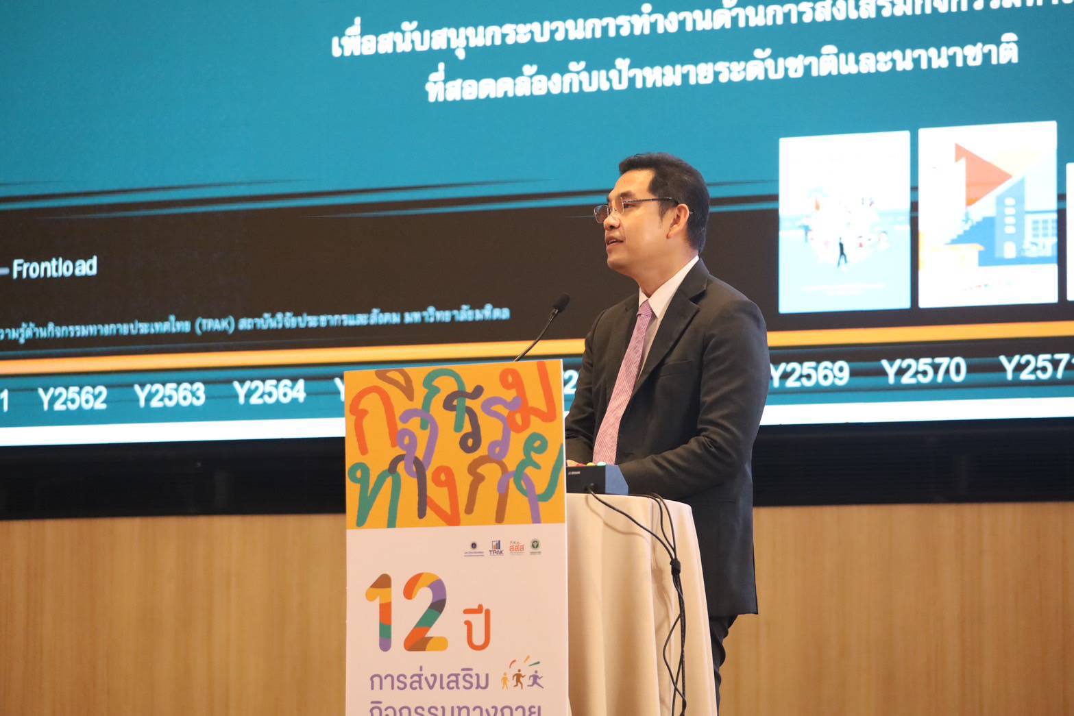 เมื่อวันที่ 12 พฤศจิกายน 2567 ศูนย์พัฒนาองค์ความรู้ด้านกิจกรรมทางกายประเทศไทย (TPAK) สถาบันวิจัยประชากรและสังคม มหาวิทยาลัยมหิดล ร่วมกับ สำนักงานกองทุนสนับสนุนการสร้างเสริมสุขภาพ (สสส.) กองกิจกรรมทางกายเพื่อสุขภาพ กรมอนามัย กระทรวงสาธารณสุข และภาคีเครือข่าย จัดงาน “12 ปี การส่งเสริมกิจกรรมทางกาย เพื่อวิถีชีวิตสุขภาวะของคนไทย” ณ โรงแรมแกรนด์ ริชมอนด์ สไตลิช คอนเวนชั่น โฮเทล จ.นนทบุรี