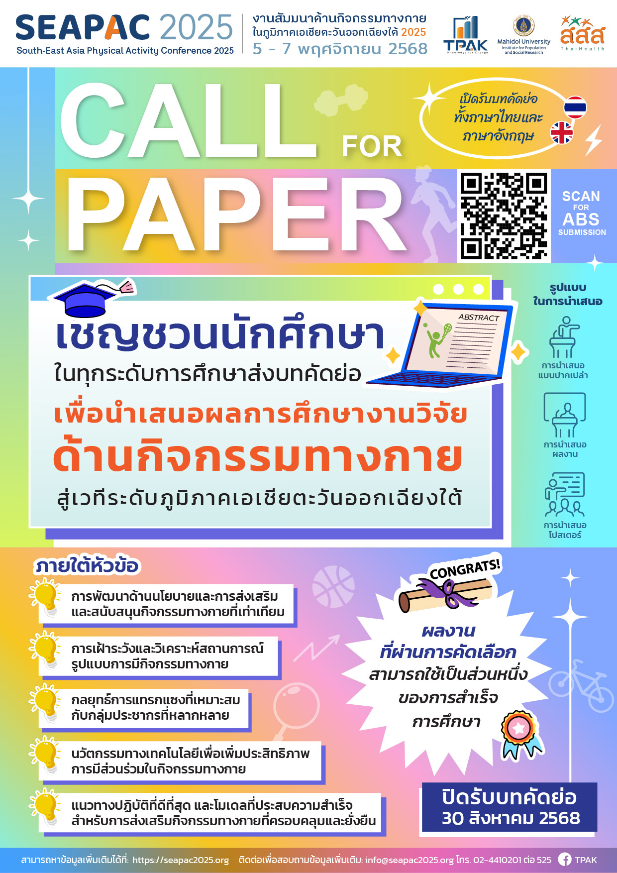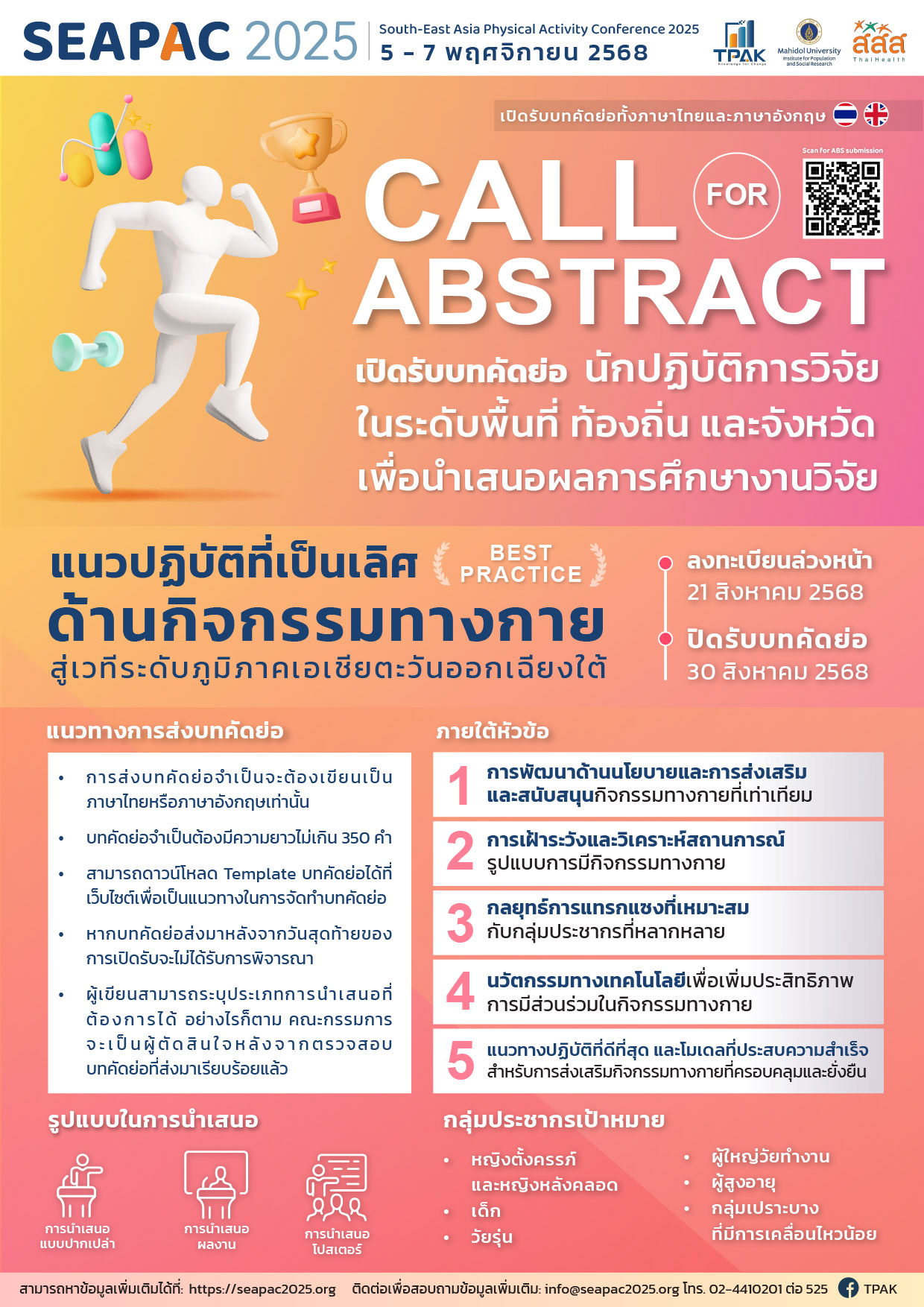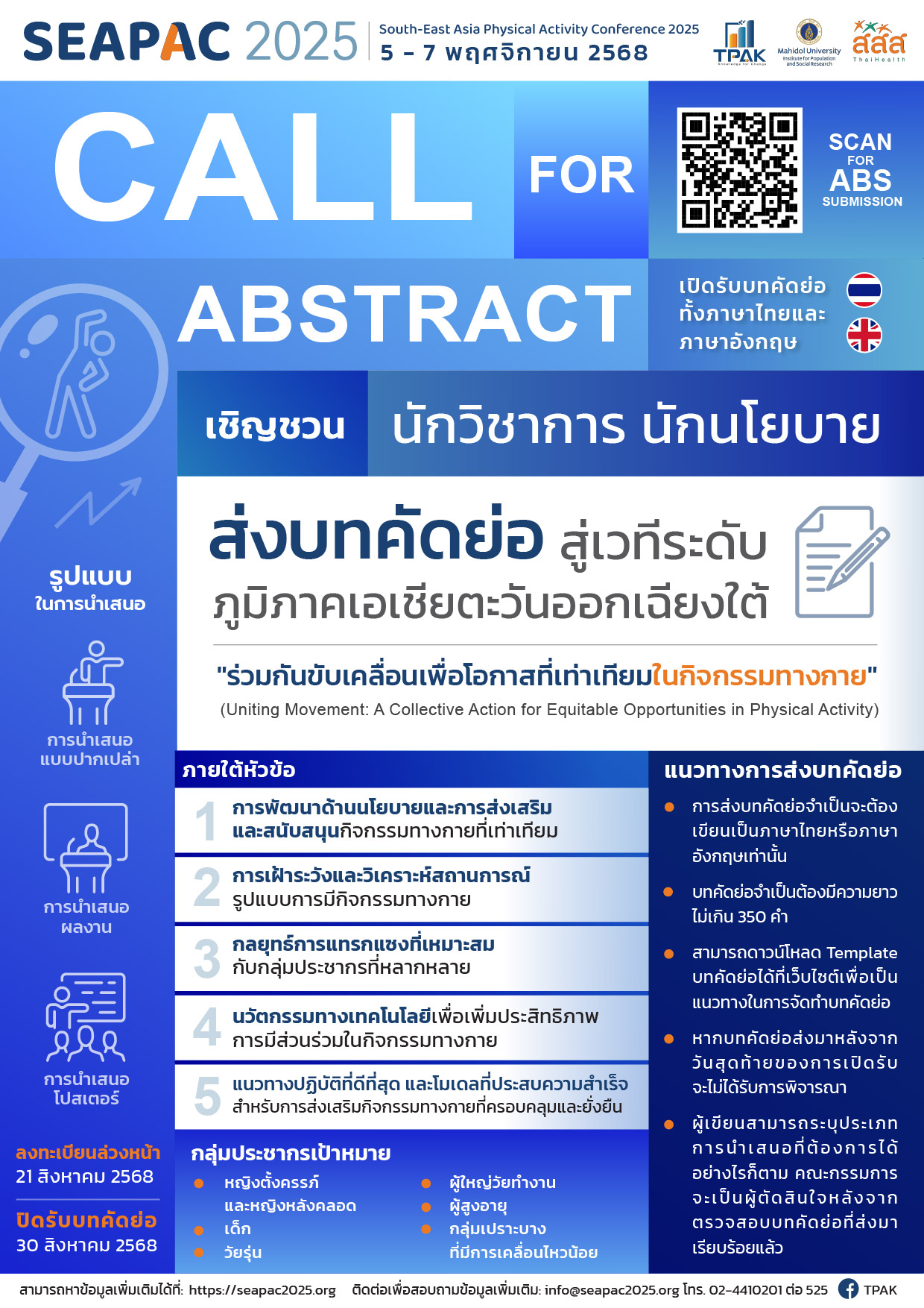สถาบันวิจัยประชากรและสังคม มหาวิทยาลัยมหิดล ขอเชิญชวนนักศึกษาทั้งในประเทศไทยและต่างประเทศ นักวิชาการ นักนโยบาย และนักวิจัยในระดับพื้นที่ ท้องถิ่น และจังหวัด ส่งผลงานเข้าร่วมนำเสนอในงานสัมมนาด้านกิจกรรมทางกายในงานภูมิภาคเอเชียตะวันออกเฉียงใต้ 2025 “South-East Asia Physical Activity Conference 2025” (SEAPAC 2025)