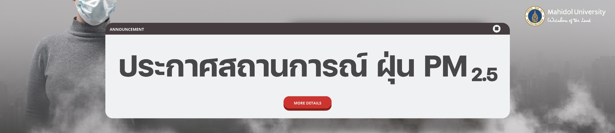 24 มกราคม 2568: ประกาศมหาวิทยาลัยมหิดล เรื่อง ขยายเวลาแนวทางการปฏิบัติงานในพื้นที่มหาวิทยาลัย เพื่อรองรับมาตรการแก้ไขปัญหาฝุ่นละออง PM2.5 ที่มีแนวโน้มค่าสูงในระดับอันตราย