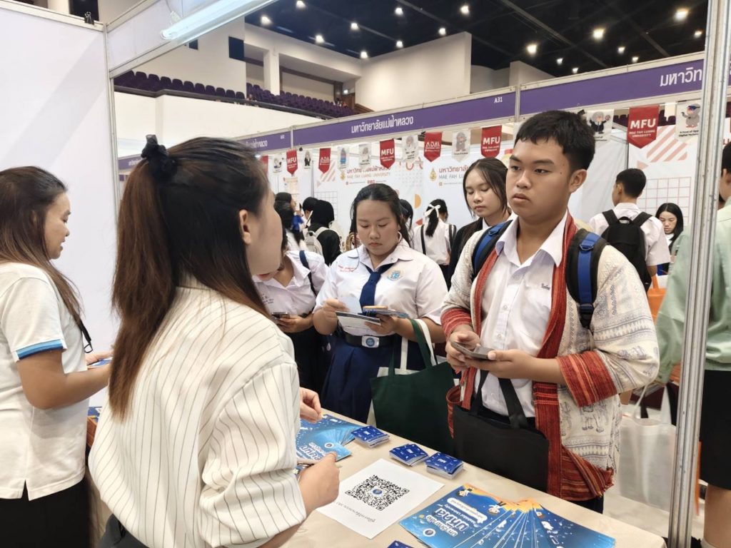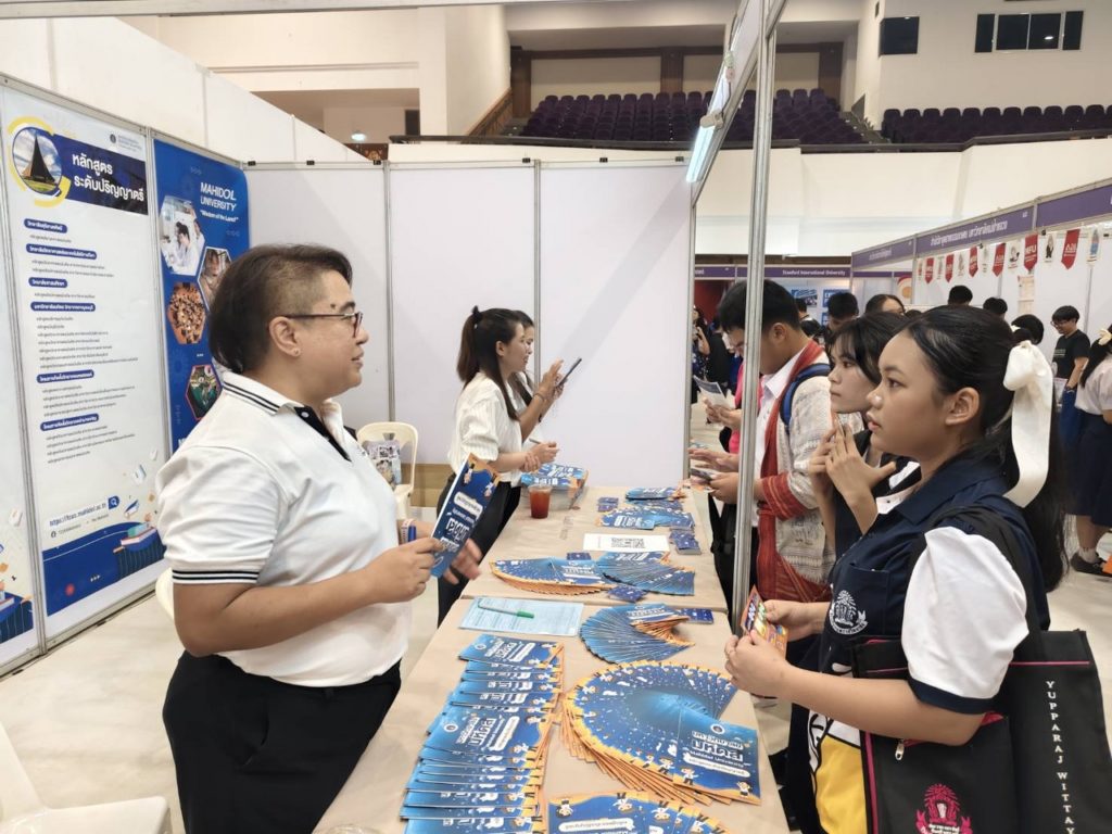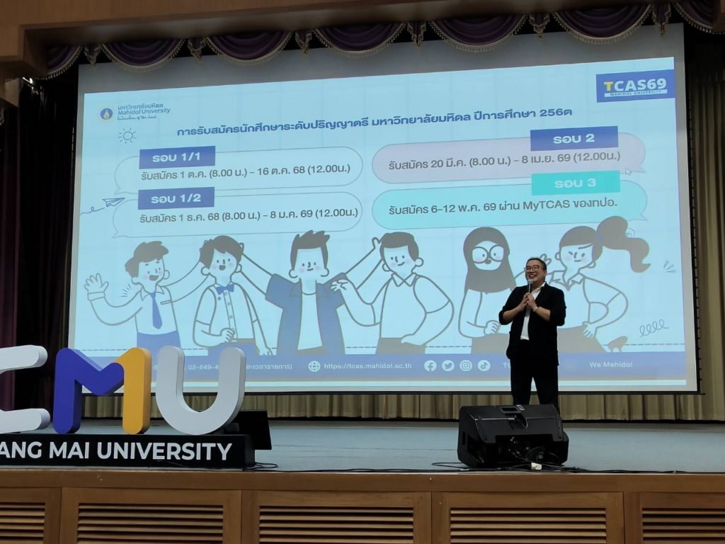 วันที่ 13-14 พฤศจิกายน 2568 มหาวิทยาลัยมหิดล เข้าร่วมจัดแสดงนิทรรศการศึกษาระดับปริญญาตรี ในงาน “ตลาดนัดหลักสูตรอุดมศึกษา” ครั้งที่ 27 ณ หอประชุมมหาวิทยาลัยเชียงใหม่ จังหวัดเชียงใหม่ โดยมีสถาบันการศึกษาทั้งภาครัฐและเอกชนกว่า 60 สถาบันทั่วประเทศ โดยมี ศาสตราจารย์ ดร. นายแพทย์พงษ์รักษ์ ศรีบัณฑิตมงคล อธิการบดีมหาวิทยาลัยเชียงใหม่ ประธานในพิธีเปิดฯ ซึ่งมีนักเรียน อาจารย์แนะแนว และผู้ปกครองในพื้นที่ภาคเหนือ เข้าร่วมงานกว่า 25,000 คน โอกาสนี้ อาจารย์ ดร.ชนกพร พัวพัฒนกุล ผู้อำนวยการศูนย์ส่งเสริมการเรียนรู้แบบบูรณาการชีวิต เจ้าหน้าที่กองบริหารการศึกษา และงานสื่อสารองค์กร กองบริหารงานทั่วไป ร่วมให้ข้อมูลเกี่ยวกับรายละเอียดจำนวนการรับในแต่ละรอบในหลักสูตรต่าง ๆ คุณสมบัติผู้สมัคร และเกณฑ์ในการคัดเลือกบุคคลเข้าศึกษาในสถาบันอุดมศึกษา (TCAS) ปีการศึกษา 2569 พร้อมบรรยายหัวข้อ “7 เรื่องทราบแล้วเปลี่ยน ที่ มหาวิทยาลัยมหิดล” เพื่อช่วยให้นักเรียนและผู้ปกครองสามารถวางแผนการศึกษาต่อได้อย่างเหมาะสม