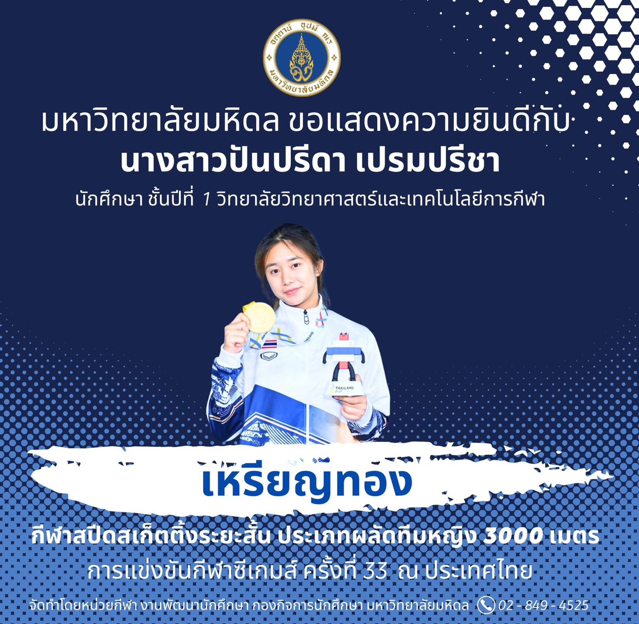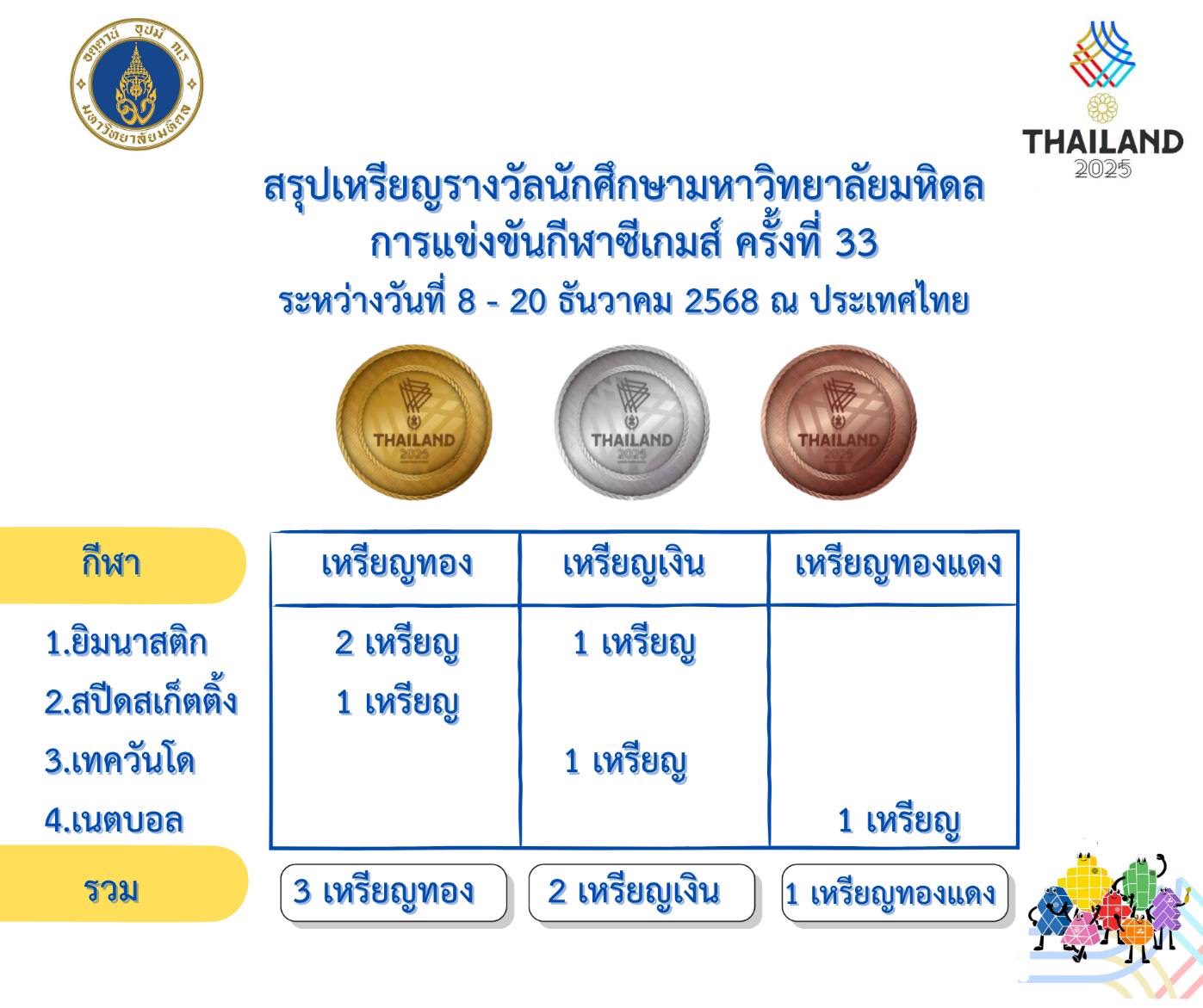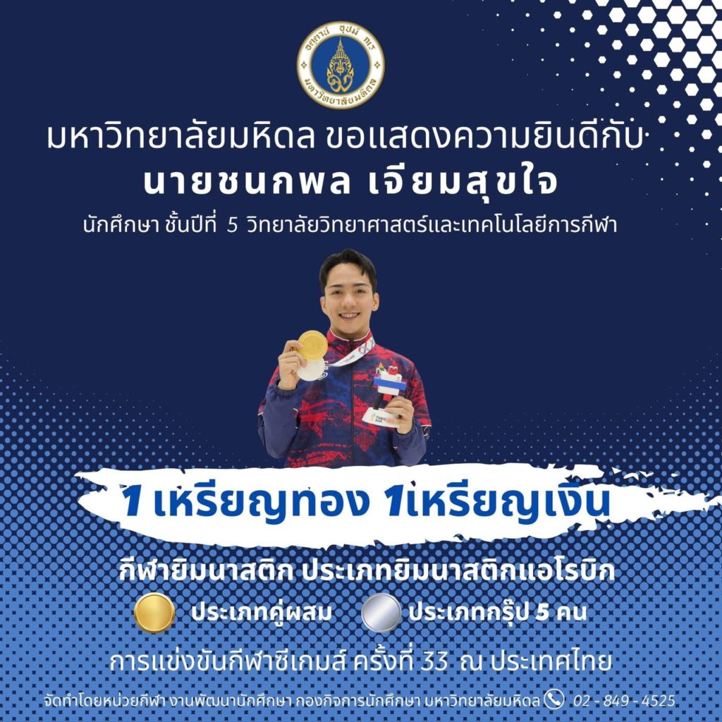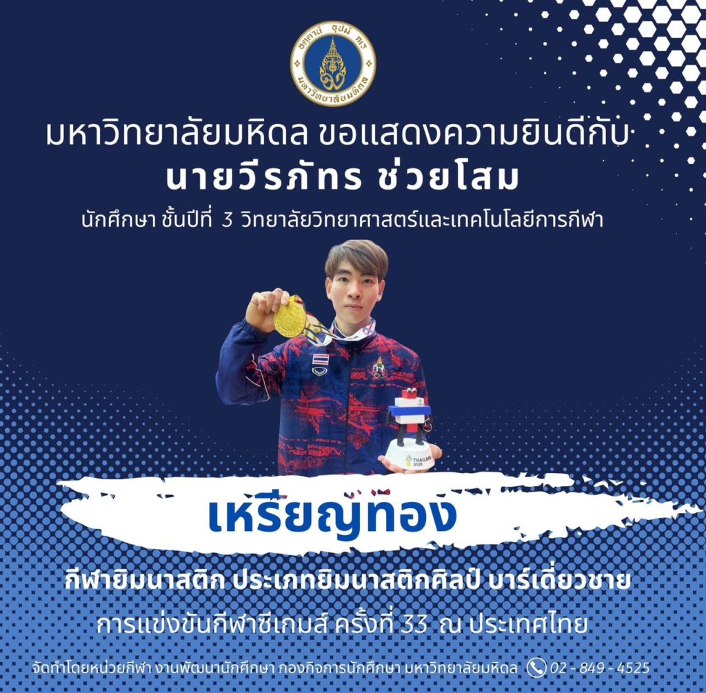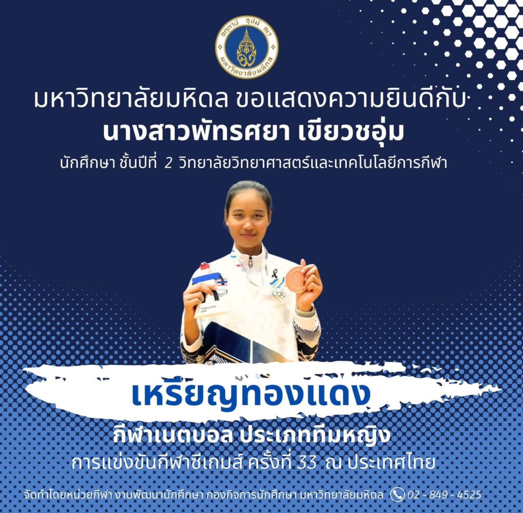มหาวิทยาลัยมหิดล ขอแสดงความยินดีแก่นักศึกษามหาวิทยาลัยมหิดล ที่ได้รับเหรียญรางวัลจากการเข้าร่วมการแข่งขันกีฬาซีเกมส์ ครั้งที่ 33 ระหว่างวันที่ 8 – 20 ธันวาคม 2568 ณ ประเทศไทย จำนวนทั้งสิ้น 6 เหรียญ จาก 4 ชนิดกีฬา ดังนี้