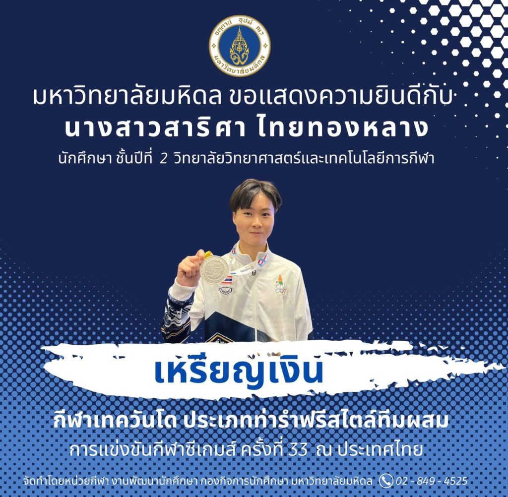 4.นางสาวสาริศา ไทยทองหลาง นักศึกษาชั้นปีที่ 2 วิทยาลัยวิทยาศาสตร์และเทคโนโลยีการกีฬา ได้รับ 1 เหรียญเงิน จากการแข่งขันกีฬาเทควันโด ประเภทท่ารำฟรีสไตล์ทีมผสม
