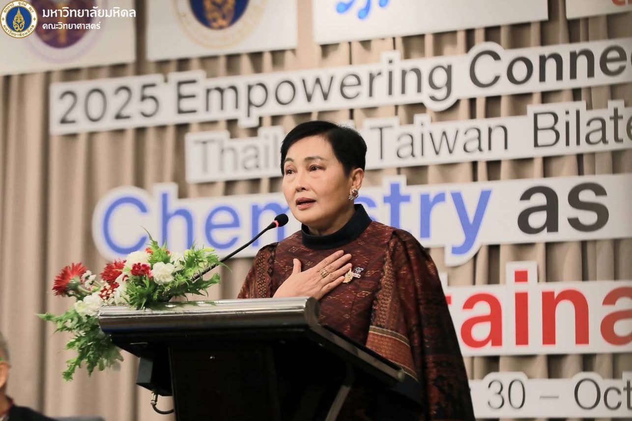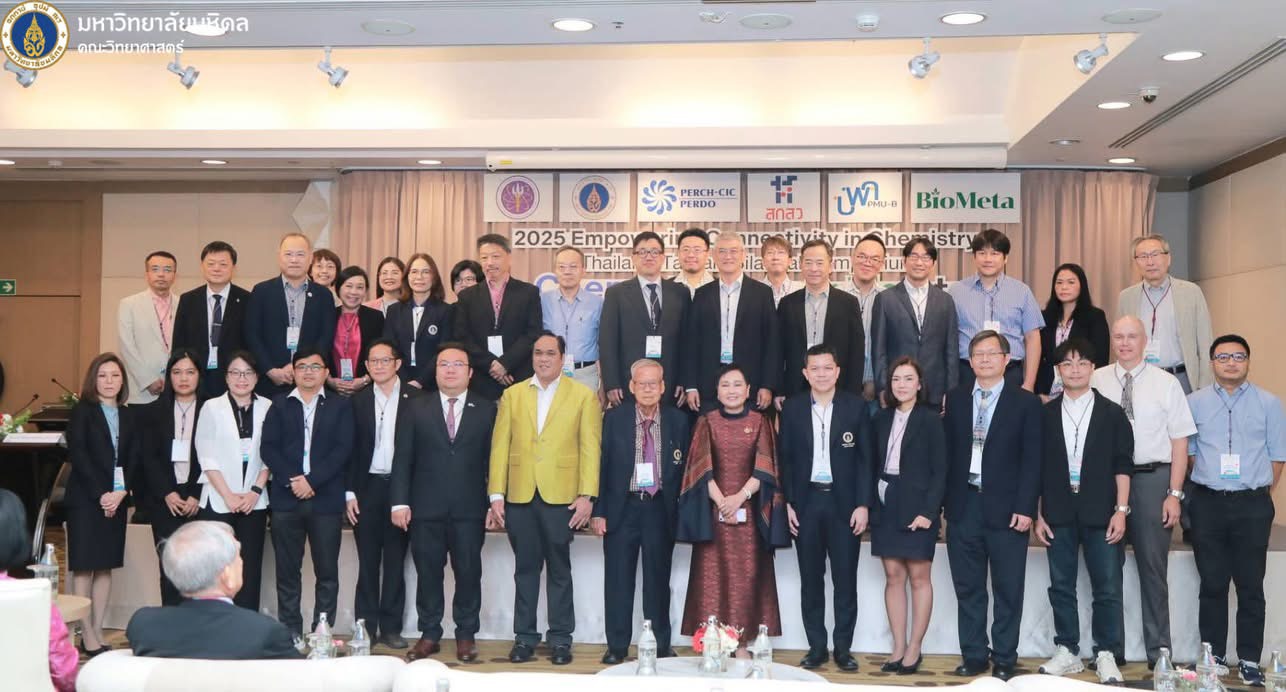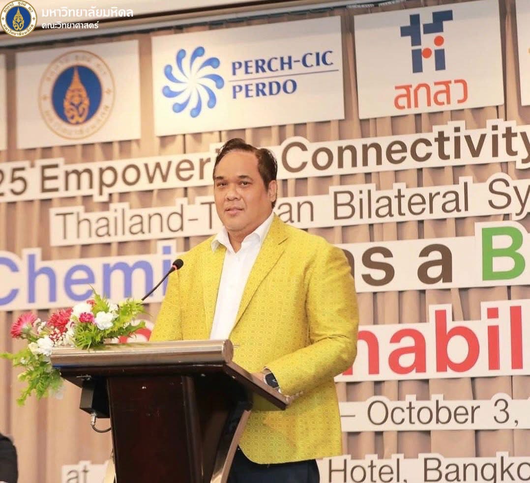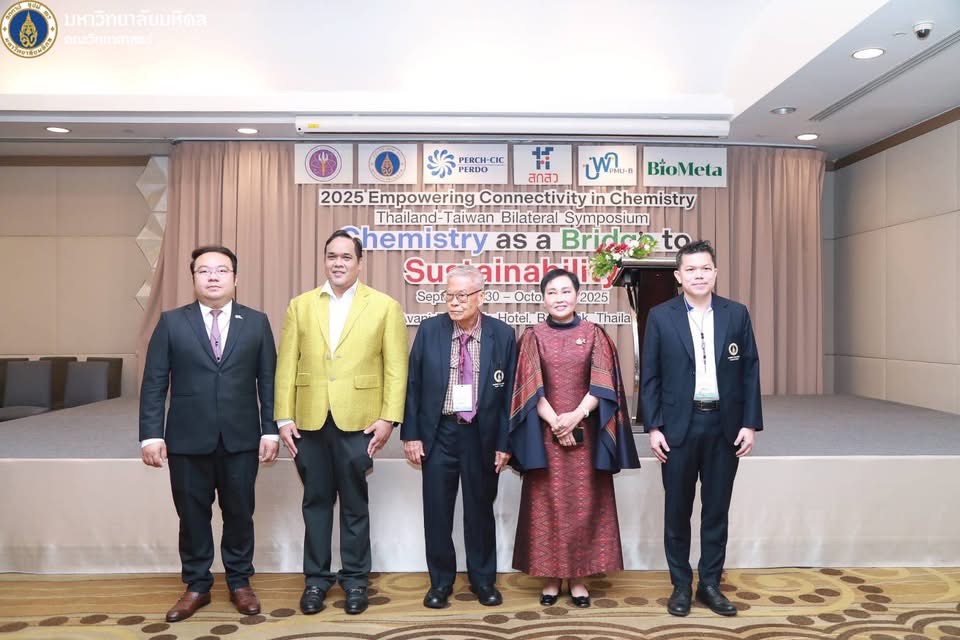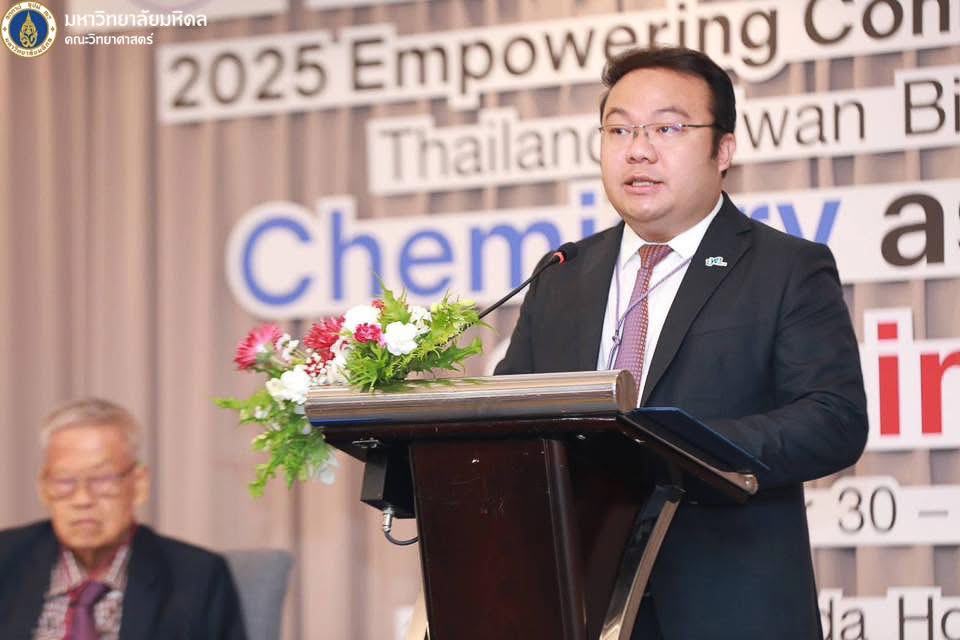วันที่ 1 ตุลาคม 2568 รองศาสตราจารย์ ดร.ประสิทธิ์ สุวรรณเลิศ คณบดีคณะวิทยาศาสตร์ มหาวิทยาลัยมหิดล เข้าร่วมการประชุมวิชาการนานาชาติ 2025 Empowering Connectivity in Chemistry – Thailand-Taiwan Bilateral Symposium “Chemistry as a Bridge to Sustainability” ซึ่งจัดโดย ศูนย์ความเป็นเลิศด้านนวัตกรรมทางเคมี (PERCH-CIC) ร่วมกับโครงการ “การผลิตกำลังคนคุณภาพสูงและการพัฒนาสถาบันอุดมศึกษาผ่านการสร้างความร่วมมือด้านนวัตกรรมทรัพยากรชีวภาพทางเคมีชีวภาพ เมตาโบโลมิกส์ของสารผลิตภัณฑ์ธรรมชาติ และวัสดุเพื่อความยั่งยืน” และโครงการ “การศึกษาโมเลกุลเป้าหมายและกลไกการออกฤทธิ์ของผลิตภัณฑ์ธรรมชาติจากต้นนางพญาหน้าขาว (Mallotus spodocarpus) สำหรับการพัฒนายาต้านมะเร็ง” โอกาสนี้ ดร.พันธุ์เพิ่มศักดิ์ อารุณี ผู้ช่วยปลัดกระทรวงการอุดมศึกษา วิทยาศาสตร์ วิจัยและนวัตกรรม (อว.) เป็นประธานเปิดงาน ซึ่งมีนักวิจัย คณาจารย์ และผู้เชี่ยวชาญจากสถาบันชั้นนำทั้งในและต่างประเทศกว่า 170 คน เข้าร่วมนำเสนอผลงานวิจัย ณ โรงแรมอวานี รัชดา กรุงเทพฯ