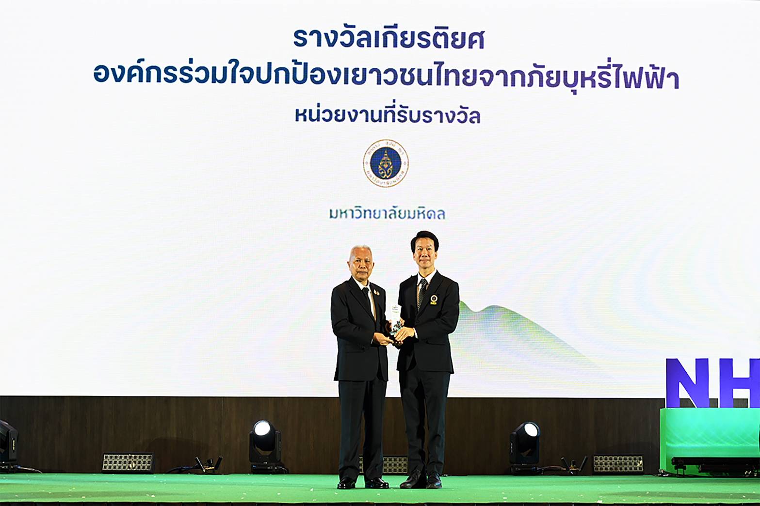วันที่ 27 พฤศจิกายน 2568 ผู้ช่วยศาสตราจารย์ ดร.อิทธิโชติ จักรไพวงศ์ รองอธิการบดีฝ่ายกายภาพและสิ่งแวดล้อม มหาวิทยาลัยมหิดล เข้ารับ “รางวัลเกียรติยศองค์กรร่วมใจปกป้องเยาวชนปกป้องเยาวชนไทยจากภัยบุหรี่ไฟฟ้า” ในฐานะองค์กรที่ขับเคลื่อนนโยบายสาธารณะแบบมีส่วนร่วม โดยมี นายโสภณ ซารัมย์ รองนายกรัฐมนตรี และประธานกรรมการสุขภาพแห่งชาติ เป็นประธานในพิธีมอบรางวัล ในงานสมัชชาสุขภาพแห่งชาติ ครั้งที่ 18 พ.ศ. 2568 “เศรษฐกิจยุคใหม่ สร้างสุขภาวะไทยยั่งยืน” จัดโดย สำนักงานคณะกรรมการสุขภาพแห่งชาติ ณ อาคารอิมแพ็ค ฟอรั่ม เมืองทองธานี จังหวัดนนทบุรี