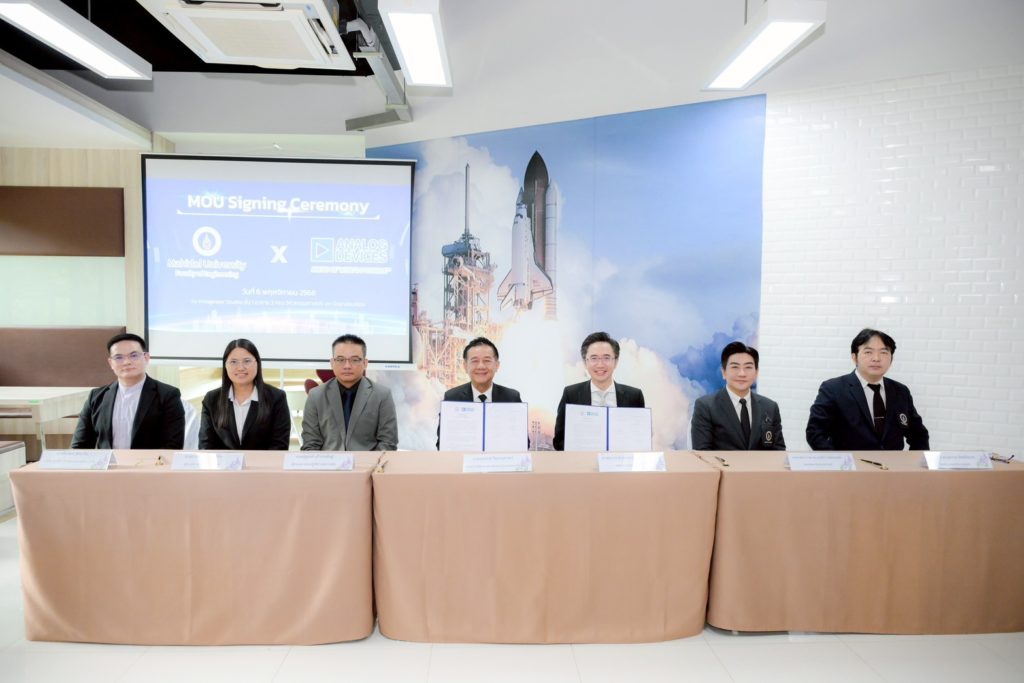 วันที่ 6 พฤศจิกายน 2568 คณะวิศวกรรมศาสตร์ มหาวิทยาลัยมหิดล จัดพิธีลงนามบันทึกข้อตกลงความร่วมมือทางวิชาการ ร่วมกับ บริษัท อนาล็อก ดีไวเซส (ประเทศไทย) จำกัด โดยได้รับเกียรติจาก ศาสตราจารย์ ดร.ยศชนัน วงศ์สวัสดิ์ รองอธิการบดีฝ่ายวิจัย มหาวิทยาลัยมหิดล ร่วมเป็นเกียรติในพิธีลงนาม ระหว่าง รองศาสตราจารย์ ดร.ธนภัทร์ วานิชานนท์ คณบดีคณะวิศวกรรมศาสตร์ มหาวิทยาลัยมหิดล กับ นายเสกสรรค์ จิตตะนุศาสตร์ กรรมการและผู้อำนวยการฝ่ายวิศวกรรมการทดสอบผลิตภัณฑ์ บริษัท อนาล็อก ดีไวเซส (ประเทศไทย) จำกัด พร้อมด้วย อาจารย์ ดร.สุพรรณ ทิพย์ทิพากร หัวหน้าภาควิชาวิศวกรรมไฟฟ้า คณะวิศวกรรมศาสตร์ มหาวิทยาลัยมหิดล คุณณัฐพงศ์ แก้วประดิษฐ์ ผู้อำนวยการฝ่ายปฏิบัติการและการผลิต และคุณสุนทรีย์ จันทร์เงิน ผู้อำนวยการฝ่ายทรัพยากรมนุษย์ บริษัท อนาล็อก ดีไวเซส (ประเทศไทย) จำกัด โดยมี คณะผู้บริหารจากทั้ง 2 หน่วยงานร่วมเป็นเกียรติในพิธี ณ ห้อง Innogineer Studio อาคาร 3 คณะวิศวกรรมศาสตร์ มหาวิทยาลัยมหิดล ศาลายา