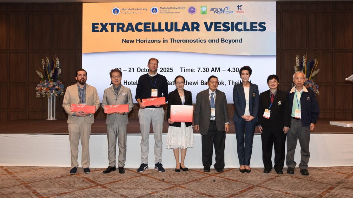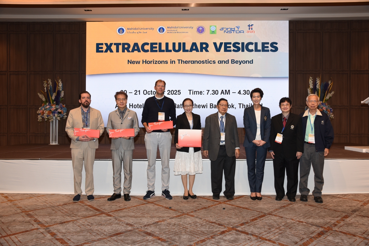 วันที่ 20 ตุลาคม 2568 สถาบันชีววิทยาศาสตร์โมเลกุล มหาวิทยาลัยมหิดล จัดประชุมวิชาการนานาชาติ “Extracellular Vesicles – New Horizons in Theranostics and Beyond (EV-NEXT)” โดยได้รับเกียรติจาก รองศาสตราจารย์ ดร.นภเรณู สัจจรักษ์ ธีระฐิติ รองอธิการบดีฝ่ายวิเทศสัมพันธ์และสภามหาวิทยาลัย มหาวิทยาลัยมหิดล เป็นประธานเปิดการประชุม และรองศาสตราจารย์ ดร.หม่อมหลวงเสาวรส สวัสดิวัฒน์ ผู้อำนวยการสถาบันชีววิทยาศาสตร์โมเลกุล กล่าวต้อนรับผู้เข้าร่วมงาน โดยมี แพทย์ นักวิทยาศาสตร์ นักเทคนิคการแพทย์ นักศึกษา และนักวิจัยรุ่นใหม่ (Young Scientists) จากมหาวิทยาลัย สถาบันวิจัย โรงพยาบาล ศูนย์วิจัยทางการแพทย์ ภาคอุตสาหกรรม และสตาร์ทอัพด้านเทคโนโลยีชีวภาพ เข้าร่วมแลกเปลี่ยนเรียนรู้เกี่ยวกับการประยุกต์ใช้ Extracellular Vesicles (EVs) เพื่อการวินิจฉัย การรักษา การพัฒนายา และชีววัตถุ เข้าร่วมการประชุมระหว่างวันที่ 20 – 21 ตุลาคม 2568 ณ โรงแรมเอเชีย กรุงเทพฯ