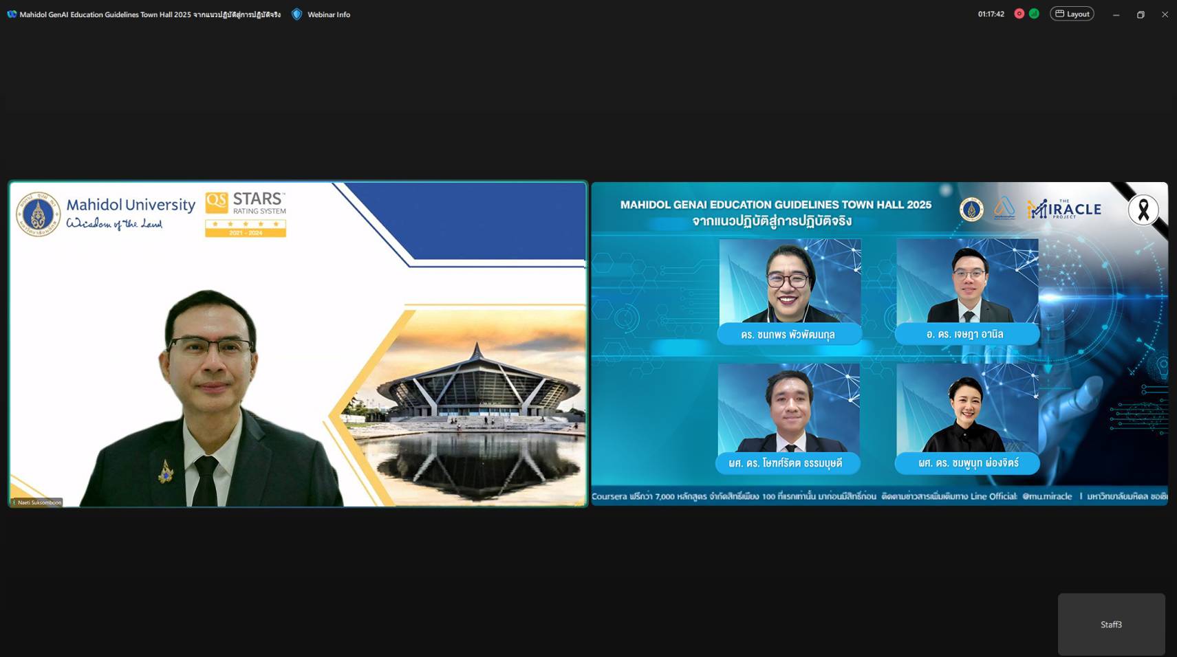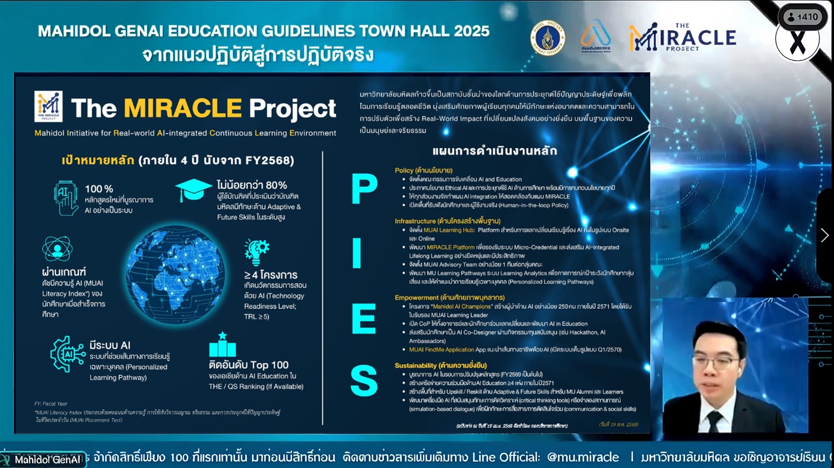 วันที่ 29 ตุลาคม 2568 มหาวิทยาลัยมหิดล จัดโครงการ Town Hall Meeting เรื่อง “การประยุกต์ใช้ตามแนวปฏิบัติ Generative AI ในบริบทการศึกษา มหาวิทยาลัยมหิดล (พ.ศ. 2568)” โดยมี ศาสตราจารย์ ดร. เภสัชกรเนติ สุขสมบูรณ์ รองอธิการบดีฝ่ายการศึกษา มหาวิทยาลัยมหิดล เป็นประธานกล่าวเปิดโครงการฯ ซึ่งจัดขึ้นเพื่อสื่อสารแนวทางการใช้เทคโนโลยีปัญญาประดิษฐ์แบบเจเนอเรทีฟ (Generative AI) ในการจัดการเรียนการสอน การประเมินผล และการดำเนินงานด้านการศึกษาให้เกิดความเข้าใจร่วมกันในระดับมหาวิทยาลัย ตลอดจนส่งเสริมการใช้เทคโนโลยีอย่างปลอดภัย โปร่งใส และมีธรรมาภิบาล