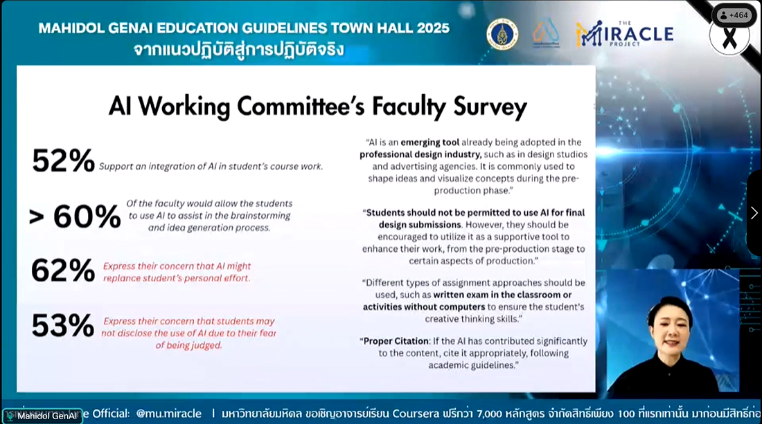 กิจกรรม Town Hall Meeting ครั้งนี้มุ่งเผยแพร่ “แนวปฏิบัติในการใช้เทคโนโลยีปัญญาประดิษฐ์แบบเจเนอเรทีฟ (Generative AI) ในบริบทของการศึกษา พ.ศ. 2568” สู่การปฏิบัติอย่างเป็นรูปธรรม เพื่อให้คณาจารย์และบุคลากรสามารถนำไปประยุกต์ใช้ในการเรียนการสอนได้อย่างเหมาะสม สอดคล้องกับหลักธรรมาภิบาลข้อมูล ความซื่อตรงทางวิชาการ และการบริหารความเสี่ยงอย่างรอบด้าน ประกอบด้วยการนำเสนอและแลกเปลี่ยนเรียนรู้ใน 4 หัวข้อสำคัญ ประกอบด้วย ภาพรวมและสาระสำคัญของแนวปฏิบัติฯ ฉบับมหิดล การระบุและบริหารจัดการความเสี่ยงจากการใช้ AI การนำเสนอกรณีศึกษาและการประยุกต์ใช้เครื่องมือ AI Assessment Scale (AIAS) เพื่อกำหนดขอบเขตการใช้งานของนักศึกษาใน 5 ระดับ และช่วงถาม–ตอบ เพื่อเปิดเวทีแลกเปลี่ยนความคิดเห็นและข้อเสนอแนะจากผู้เข้าร่วม โดยได้รับเกียรติจากวิทยากรผู้ทรงคุณวุฒิ ได้แก่ อาจารย์ ดร.เจษฎา อานิล ผู้ช่วยอธิการบดีฝ่ายการศึกษา มหาวิทยาลัยมหิดล ผู้ช่วยศาสตราจารย์ ดร.โษฑศ์รัตต ธรรมบุษดี ผู้ช่วยคณบดีด้านการเปลี่ยนแปลงทางดิจิทัลขององค์กร คณะวิศวกรรมศาสตร์ มหาวิทยาลัยมหิดล ผู้ช่วยศาสตราจารย์ ดร. ชมพูนุท ผ่องจิตร์ รองคณบดีฝ่ายการศึกษา วิทยาลัยนานาชาติ มหาวิทยาลัยมหิดล โดยมี อาจารย์ ดร.ชนกพร พัวพัฒนกุล ผู้อำนวยการศูนย์ส่งเสริมการเรียนรู้แบบบูรณาการชีวิต (CLiL – Center for Life-integrated Learning) มหาวิทยาลัยมหิดล ทำหน้าที่ผู้ดำเนินรายการ