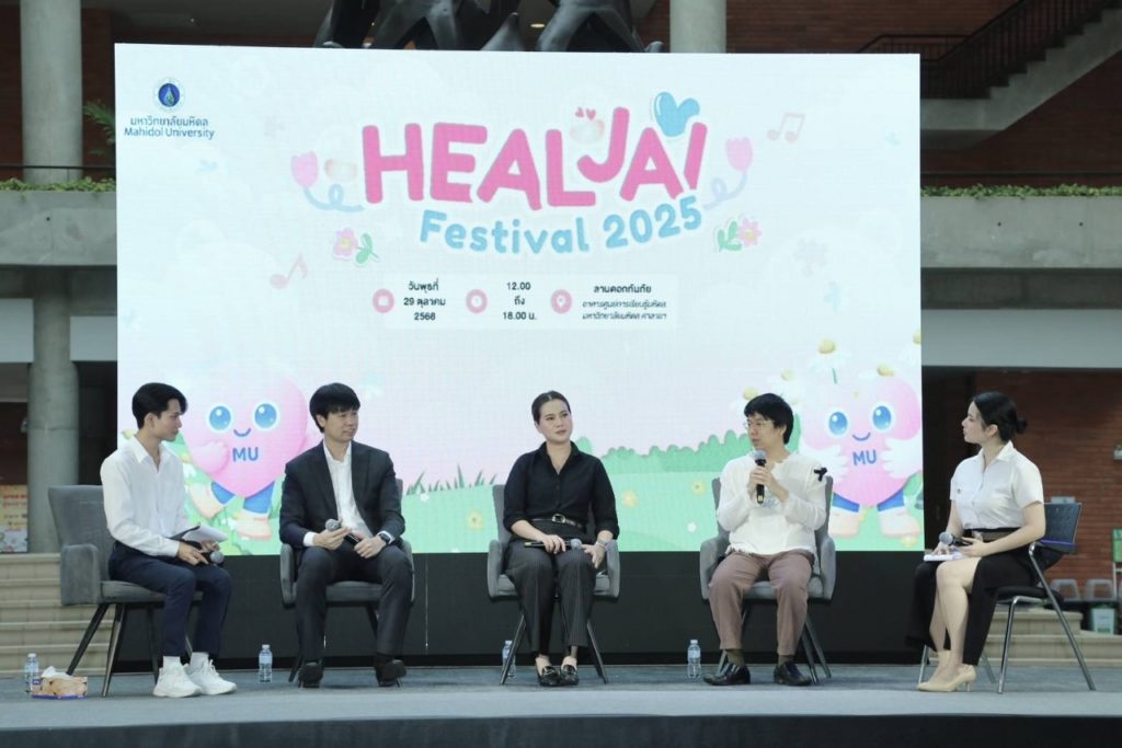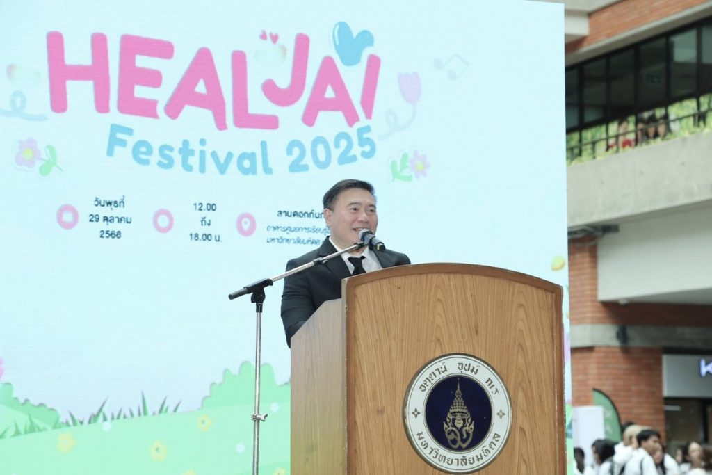 วันที่ 29 ตุลาคม 2568 มหาวิทยาลัยมหิดล โดย กองกิจการนักศึกษา และ ศูนย์จิตตปัญญาศึกษา ร่วมกับ Happy Growth และ ณ สมดุลย์ และภาคีเครือข่าย จัดกิจกรรมโครงการสร้างเสริมสุขภาวะทางใจและปัญญา ครั้งที่ 2 (Heal Jai Festival) เพื่อให้นักศึกษา และบุคลากรได้เรียนรู้เทคนิคการดูแลตัวเองทั้งกายและใจ ให้พร้อมรับมือกับความเครียดและความท้าทายในชีวิตประจำวัน กับหลากหลายกิจกรรม “ฮีลใจ” ที่จะช่วยเสริมสร้างสุขภาวะทางใจและปัญญา ผ่านการบูรณาการศาสตร์ต่าง ๆ อย่างเป็นระบบ เชื่อมโยงกับภาคีเครือข่ายให้เกิดการดูแลสุขภาวะอย่างเป็นองค์รวม โดยมี รองศาสตราจารย์ ดร.สิทธิวัฒน์ เลิศศิริ รองอธิการบดี มหาวิทยาลัยมหิดล เป็นประธานในพิธีเปิด รองศาสตราจารย์ เรืออากาศโท ทันตแพทย์ชัชชัย คุณาวิศรุต รองอธิการบดีฝ่ายกิจการนักศึกษาและศิษย์เก่าสัมพันธ์ มหาวิทยาลัยมหิดล กล่าวรายงานวัตถุประสงค์ โอกาสนี้ ศาสตราจารย์ ดร. เภสัชกรสมภพ ประธานธุรารักษ์ รองอธิการบดีฝ่ายแผนกลยุทธ์ พัฒนาคุณภาพและพันธกิจเพื่อสังคม มหาวิทยาลัยมหิดล พร้อมด้วย รองศาสตราจารย์ นายแพทย์เชิดชัย นพมณีจำรัสเลิศ รองอธิการบดีฝ่ายสารสนเทศและดิจิทัลทรานส์ฟอร์เมชัน มหาวิทยาลัยมหิดล คุณนรา เปาอินทร์ รองอธิการบดีฝ่ายบริหารบุคลากรและพัฒนาองค์กร มหาวิทยาลัยมหิดล ผู้ช่วยอธิการบดีฝ่ายต่าง ๆ และผู้บริหารส่วนงานภายในมหาวิทยาลัยมหิดล เข้าร่วมเป็นเกียรติในงาน ซึ่งมีนักศึกษา อาจารย์ และบุคลากรมหาวิทยาลัยมหิดล และผู้สนใจเข้าร่วมงาน ณ ศูนย์การเรียนรู้มหิดล มหาวิทยาลัยมหิดล ศาลายา