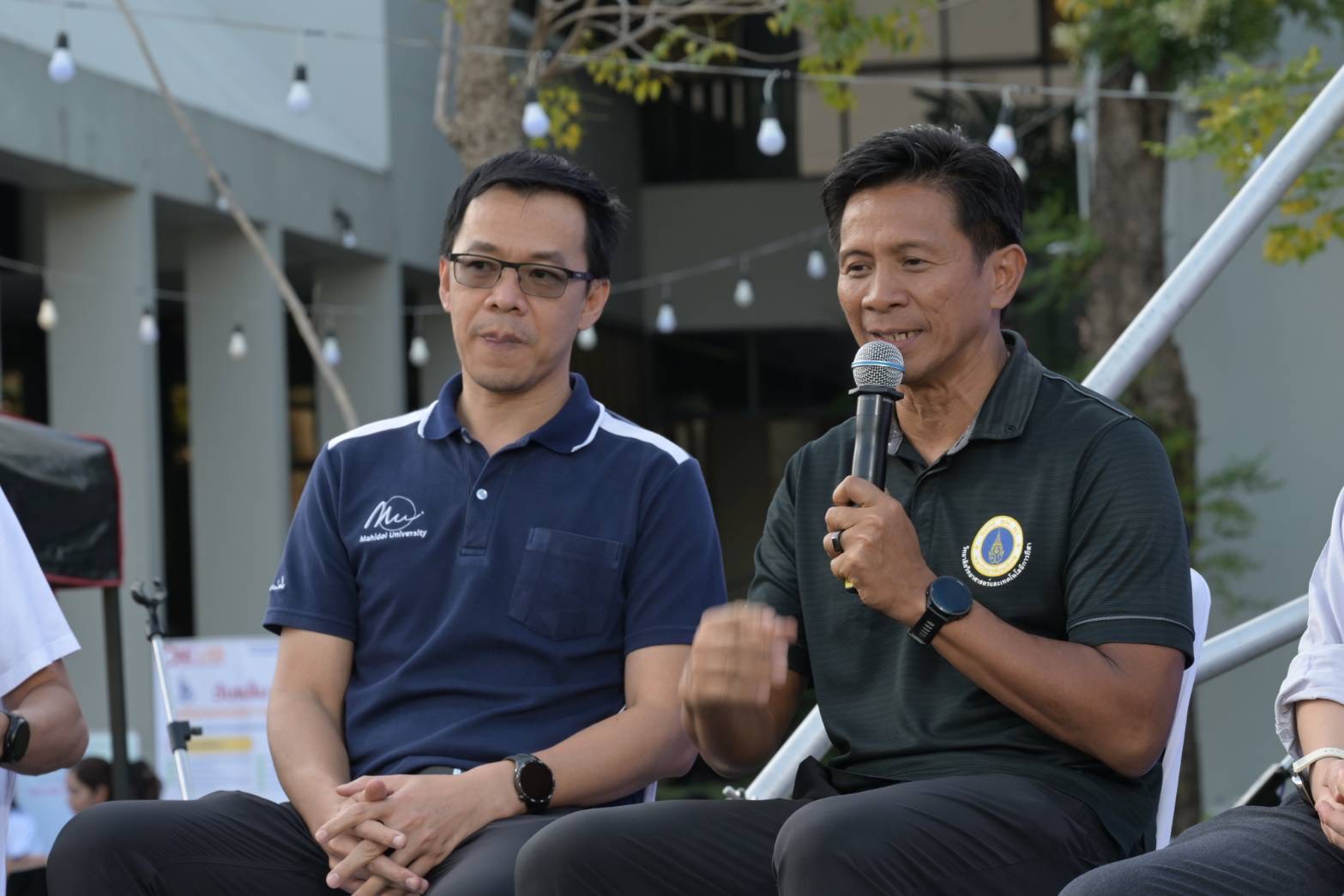 ภายในงานมีการเสวนา “ตั้งวงคุยที่ลานหญ้า” ภายใต้หัวข้อ “กลับมามีชีวิตกับผืนดิน (Healing Sound, Healing Flow)” โดยมี ศาสตราจารย์ นายแพทย์ปิยะมิตร ศรีธรา อธิการบดีมหาวิทยาลัยมหิดล คุณนรา เปาอินทร์ รองอธิการบดีฝ่ายบริหารบุคลากรและพัฒนาองค์กร รองศาสตราจารย์ ดร.ชลัท ศานติวรางคณา ผู้อำนวยการสถาบันโภชนาการ และดร.ปิยวัฒน์ หลุยลาภประเสริฐ คณบดีวิทยาลัยดุริยางคศิลป์ ร่วมแลกเปลี่ยนมุมมองด้านนโยบายและการดำเนินงานเพื่อส่งเสริมสุขภาวะของบุคลากรและนักศึกษา โอกาสนี้ อาจารย์ ดร.ชลชัย อานามนารถ รองคณบดีฝ่ายสื่อสารองค์กร วิทยาลัยวิทยาศาสตร์และเทคโนโลยีการกีฬา รองศาสตราจารย์ ดร. กภ.คมศักดิ์ สินสุรินทร์ รองคณบดีฝ่ายวิจัยและนวัตกรรม คณะกายภาพบำบัด อาจารย์ นายแพทย์กานต์ จำรูญโรจน์ ผู้ช่วยคณบดีฝ่ายการศึกษา คณะแพทยศาสตร์โรงพยาบาลรามาธิบดี และอาจารย์ ดร.ปฏิพัทธ์ อนุรักษ์ธรรม ผู้ช่วยผู้อำนวยการฝ่ายบริการวิชาการและขับเคลื่อนสังคม ศูนย์จิตตปัญญาศึกษา ร่วมแลกเปลี่ยนมุมมองด้านนโยบายและการดำเนินงานเพื่อส่งเสริมสุขภาวะของบุคลากรและนักศึกษา นำกิจกรรมยืดเหยียดและผ่อนคลายร่างกาย สร้างบรรยากาศการดูแลสุขภาพอย่างเป็นมิตรและเข้าถึงได้