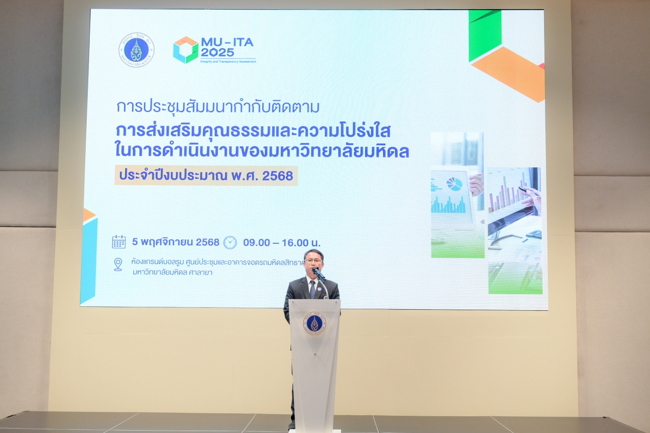 วันที่ 5 พฤศจิกายน 2568 รองศาสตราจารย์ ดร.สิทธิวัฒน์ เลิศศิริ รองอธิการบดี มหาวิทยาลัยมหิดล เป็นประธานกล่าวเปิดการประชุมสัมมนากำกับติดตามการส่งเสริมคุณธรรม และความโปร่งใสในการดำเนินงานของมหาวิทยาลัยมหิดล ประจำปีงบประมาณ พ.ศ. 2568 โดยมี นายอวยชัย อิสรวิริยะสกุล ผู้อำนวยการกองกฎหมาย กล่าวรายงานวัตถุประสงค์ โอกาสนี้ นายภิญโญยศ ม่วงสมมุข เจ้าหน้าที่งานป้องกันการทุจริตชำนาญการ คณะกรรมการป้องกันและปราบปรามการทุจริตแห่งชาติ (ป.ป.ช.) เป็นวิทยากรบรรยายพิเศษ เรื่อง แนวทางการพัฒนาองค์กรโดยใช้การประเมินคุณธรรมและความโปร่งใสในการดำเนินงานของหน่วยงานภาครัฐ (Integrity and transparency Assessment: ITA) โดยมี ผู้บริหารมหาวิทยาลัยมหิดล ผู้บริหารส่วนงาน หัวหน้าส่วนงาน บุคลากรและผู้เกี่ยวข้อง เข้าร่วมการประชุม ณ ห้องแกรนด์บอลรูม ศูนย์ประชุมและอาคารจอดรถมหิดลสิทธาคาร มหาวิทยาลัยมหิดล ศาลายา