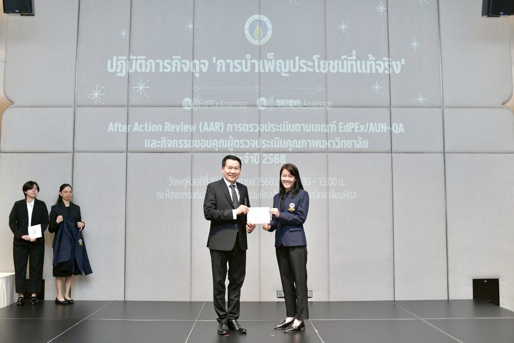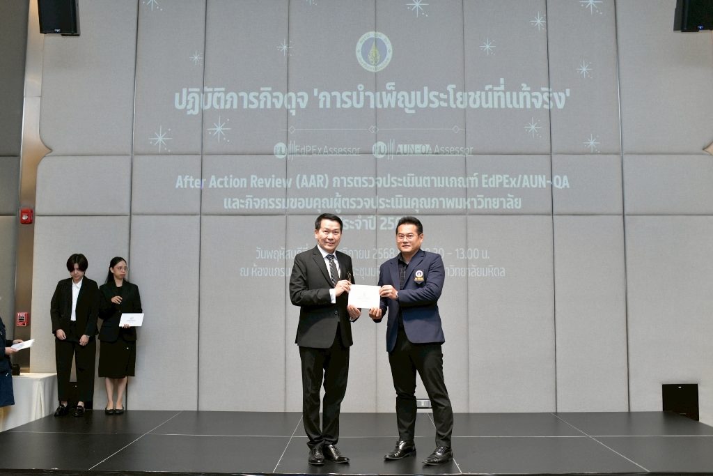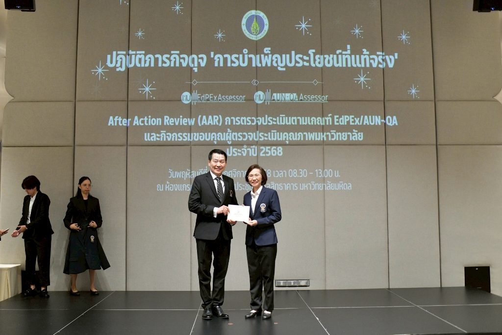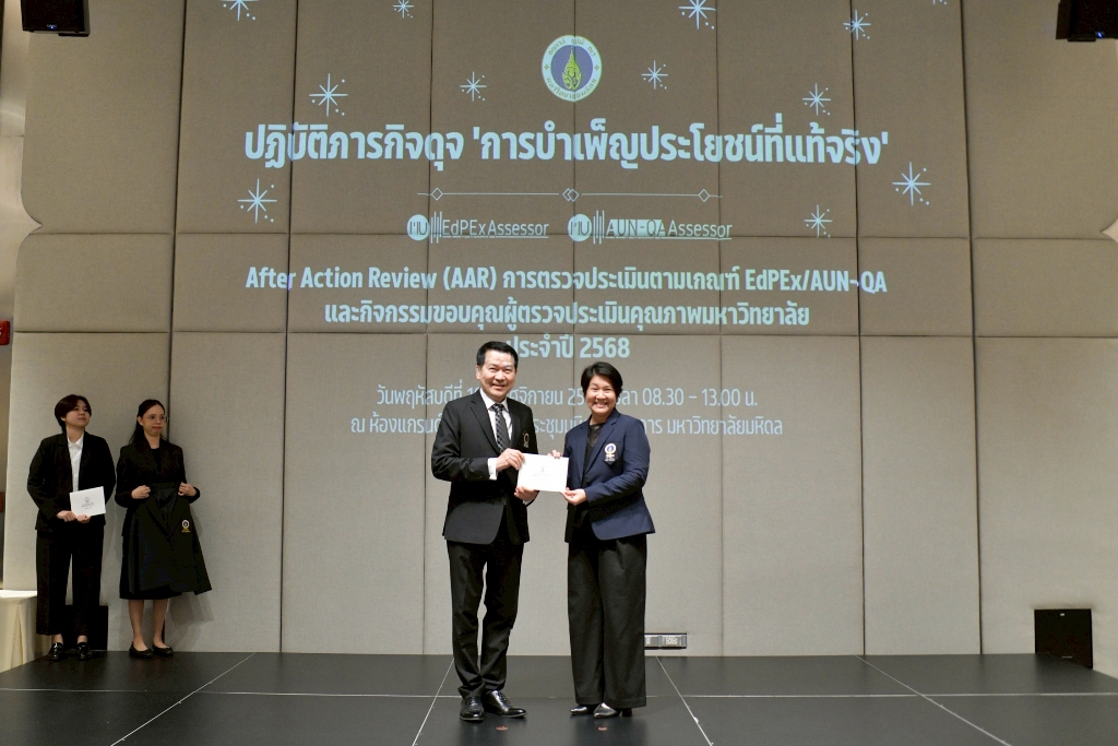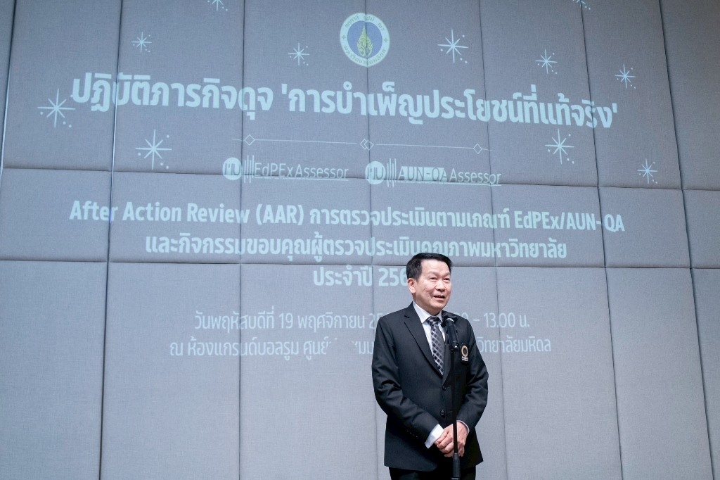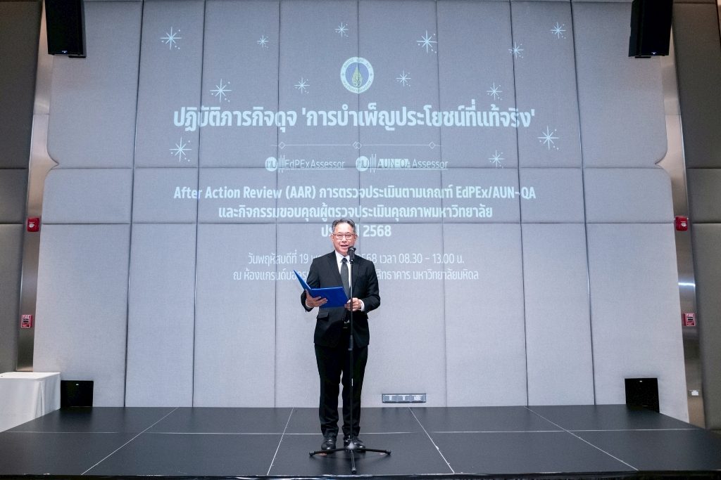 วันที่ 19 พฤศจิกายน 2568 ศาสตราจารย์ นายแพทย์ปิยะมิตร ศรีธรา อธิการบดีมหาวิทยาลัยมหิดล เป็นประธานเปิดงาน และกล่าวขอบคุณคณะผู้ตรวจประเมินมหาวิทยาลัยมหิดล ในงานเสวนาผู้ตรวจประเมิน “After Action Review (AAR) การตรวจประเมินตามเกณฑ์ EdPEx/AUN-QA และกิจกรรมขอบคุณผู้ตรวจประเมินคุณภาพมหาวิทยาลัย ประจำปี 2568” โดยมี ศาสตราจารย์ ดร. เภสัชกรสมภพ ประธานธุรารักษ์ รองอธิการบดีฝ่ายแผนกลยุทธ์ พัฒนาคุณภาพและพันธกิจเพื่อสังคม พร้อมด้วย คุณศิริลักษณ์ เกี่ยวข้อง รองอธิการบดีฝ่ายโครงการจัดตั้งวิทยาเขตอำนาจเจริญ มหาวิทยาลัยมหิดล และอาจารย์ ดร.เลิศยศ ตรีรัตนไพบูลย์ ผู้ช่วยอธิการบดีฝ่ายพัฒนาคุณภาพ มหาวิทยาลัยมหิดล และรองศาสตราจารย์ชวลิต วงษ์เอก AUN-QA Expert and Assessor เข้าร่วมแสดงความขอบคุณผู้ตรวจประเมินตามระบบคุณภาพ MUQD ที่มีบทบาทสำคัญในการขับเคลื่อนมาตรฐานคุณภาพของมหาวิทยาลัยให้สอดคล้องกับแนวคิด “Forward together – for quality and real-world impact” ณ ห้องแกรนด์บอลรูม ศูนย์ประชุมและอาคารจอดรถมหิดลสิทธาคาร มหาวิทยาลัยมหิดล