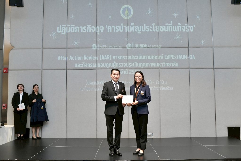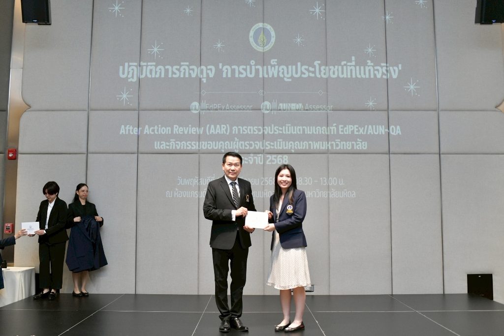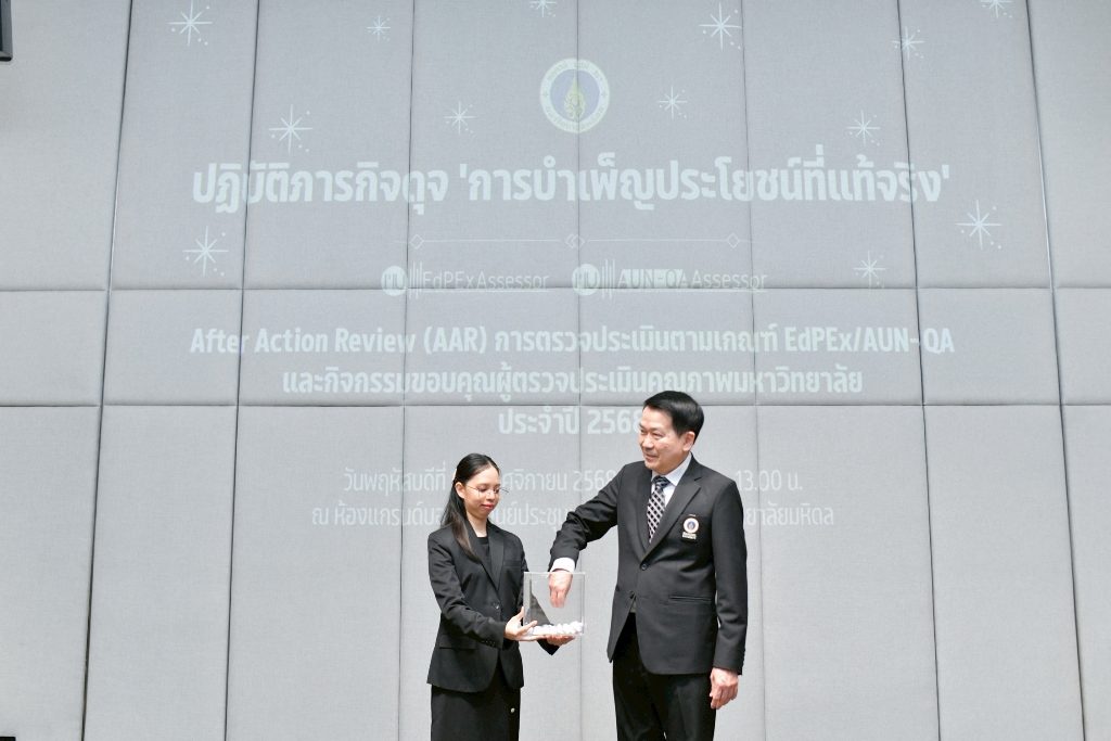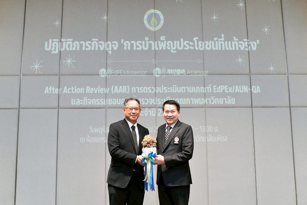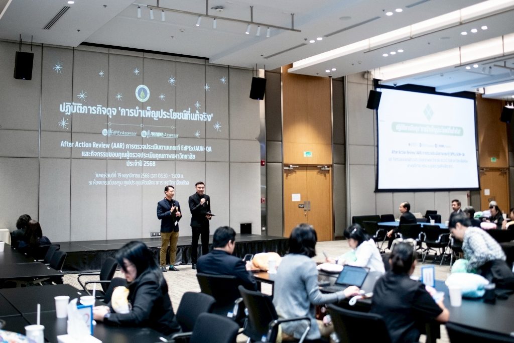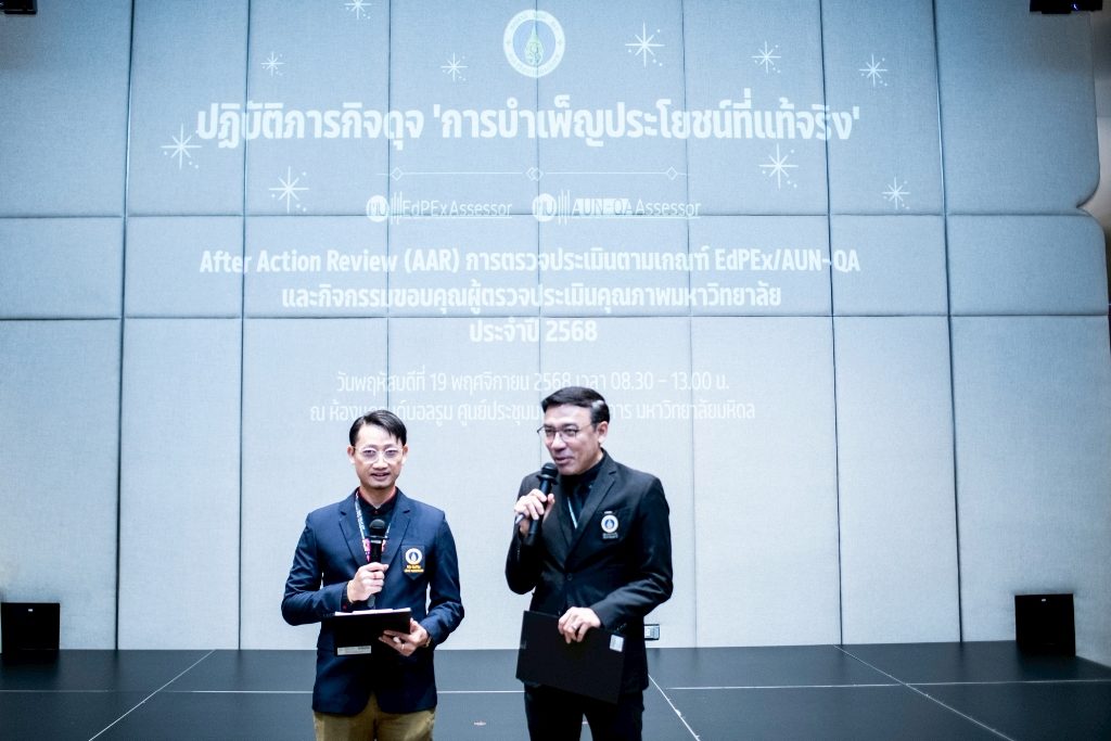 ภายในงานประกอบด้วยการแลกเปลี่ยนข้อคิดเห็น ข้อดี ข้อจำกัด โอกาสพัฒนา และบทเรียนที่ได้รับจากการตรวจประเมินตามเกณฑ์ EdPEx และ AUN-QA ประจำปี 2568 รวมถึงการนำเสนอผลการดำเนินงานและกิจกรรมแลกเปลี่ยนเรียนรู้ระหว่างผู้ตรวจประเมินและคณะผู้บริหาร รวมถึงการนำเสนอผลการดำเนินงานของหน่วยงานต่าง ๆ ที่ผ่านการตรวจประเมิน ซึ่งช่วยให้เกิดการสะท้อนบทเรียน (Lessons Learned) และระบุแนวทางปรับปรุงเพื่อยกระดับการดำเนินงานของมหาวิทยาลัยในอนาคต และการมอบของที่ระลึกเพื่อแสดงความขอบคุณผู้ตรวจประเมินจาก EdPEx และ AUN-QA ที่ได้ทุ่มเทกำลังกาย ใจ จนทำให้กระบวนการตรวจประเมินเกิดผลสัมฤทธิ์ที่ดี โดยได้รับเกียรติจาก ผู้ช่วยศาสตราจารย์ ดร. เภสัชกรจตุรงค์ ประเทืองเดชกุล หัวหน้าภาควิชาจุลชีววิทยา คณะเภสัชศาสตร์ มหาวิทยาลัยมหิดล และอาจารย์ ดร. น.สพ.ไพฑูรย์ ศรีมนตรี รองคณบดีฝ่ายบริหาร คณะสัตวแพทยศาสตร์ มหาวิทยาลัยมหิดล เป็นผู้ดำเนินรายการ