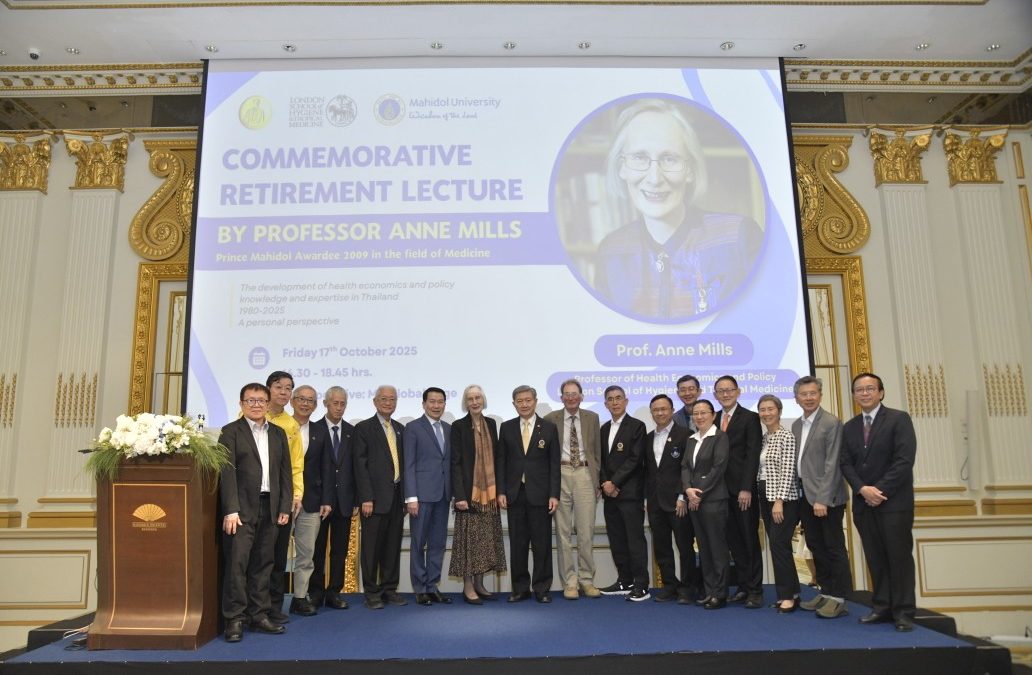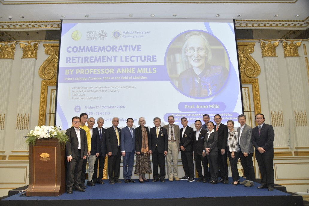 วันที่ 17 ตุลาคม 2568 ศาสตราจารย์คลินิกเกียรติคุณ นายแพทย์ปิยะสกล สกลสัตยาทร นายกสภามหาวิทยาลัยมหิดล กล่าวต้อนรับผู้เข้าร่วมงาน โดยมี ศาสตราจารย์ นายแพทย์ปิยะมิตร ศรีธรา อธิการบดีมหาวิทยาลัยมหิดล เป็นประธานในการกล่าวเปิด งานปาฐกถาพิเศษ “Commemorative Retirement Lecture by Professor Anne Mills” โอกาสนี้ได้รับเกียรติจาก Professor Anne Mills, Professor of Health Economics and Policy, London School of Hygiene and Tropical Medicine สหราชอาณาจักร ในฐานะผู้ได้รับรางวัลสมเด็จเจ้าฟ้ามหิดล ปี 2552 สาขาการแพทย์ ปาฐกถาพิเศษในหัวข้อ The development of health economics and policy knowledge and expertise in Thailand 1980 – 2025 โดยมี คณะผู้บริหารมหาวิทยาลัยมหิดล ผู้บริหารส่วนงาน คณาจารย์ นักวิจัย เข้าร่วมเป็นเกียรติในงาน ณ ห้องท่าจีน โรงแรมแมนดาริน โอเรียนเต็ล กรุงเทพฯ