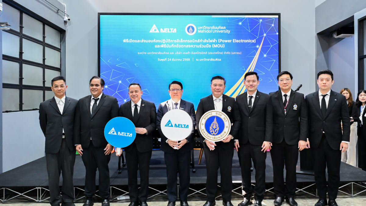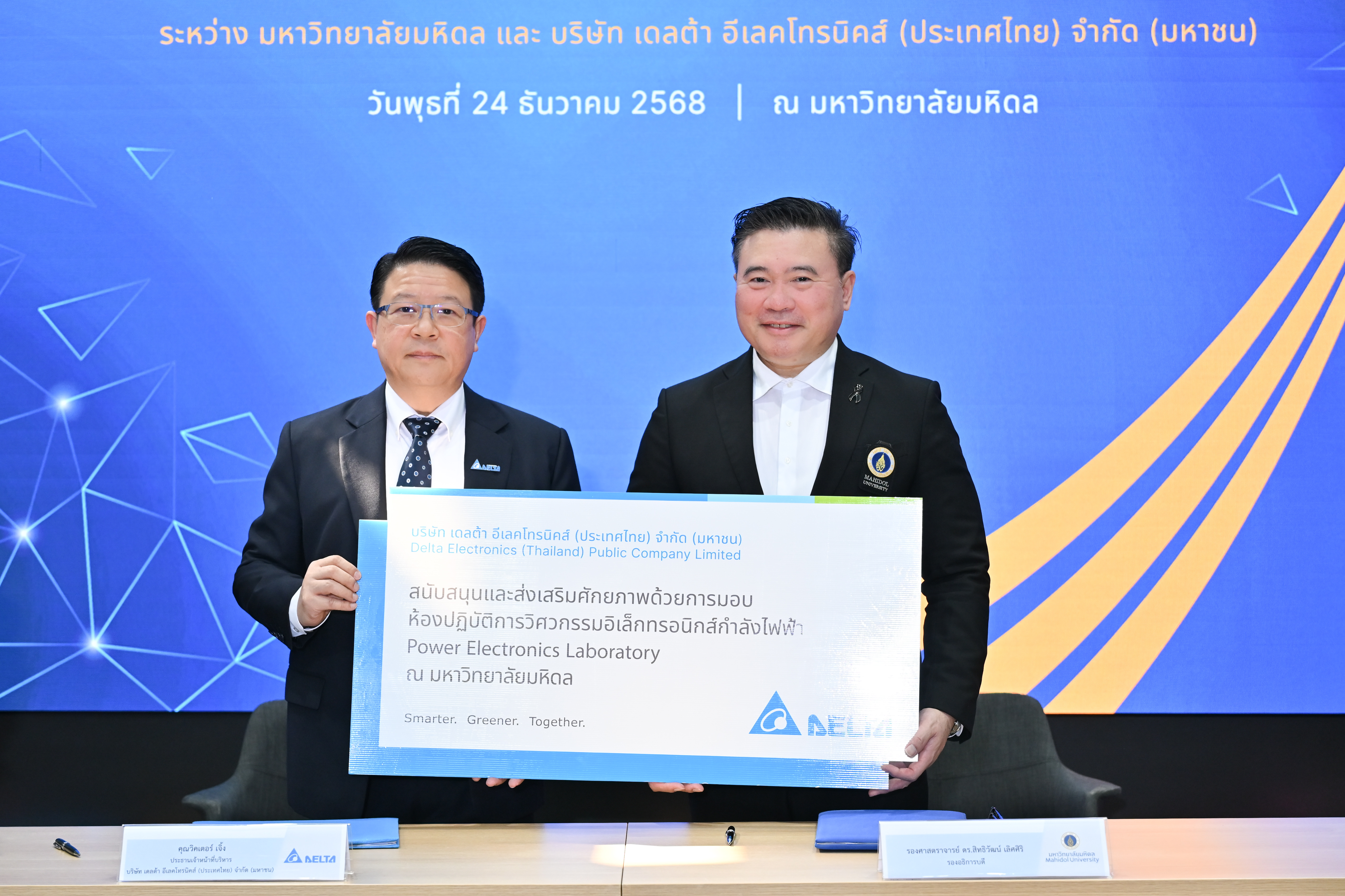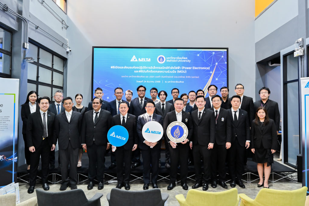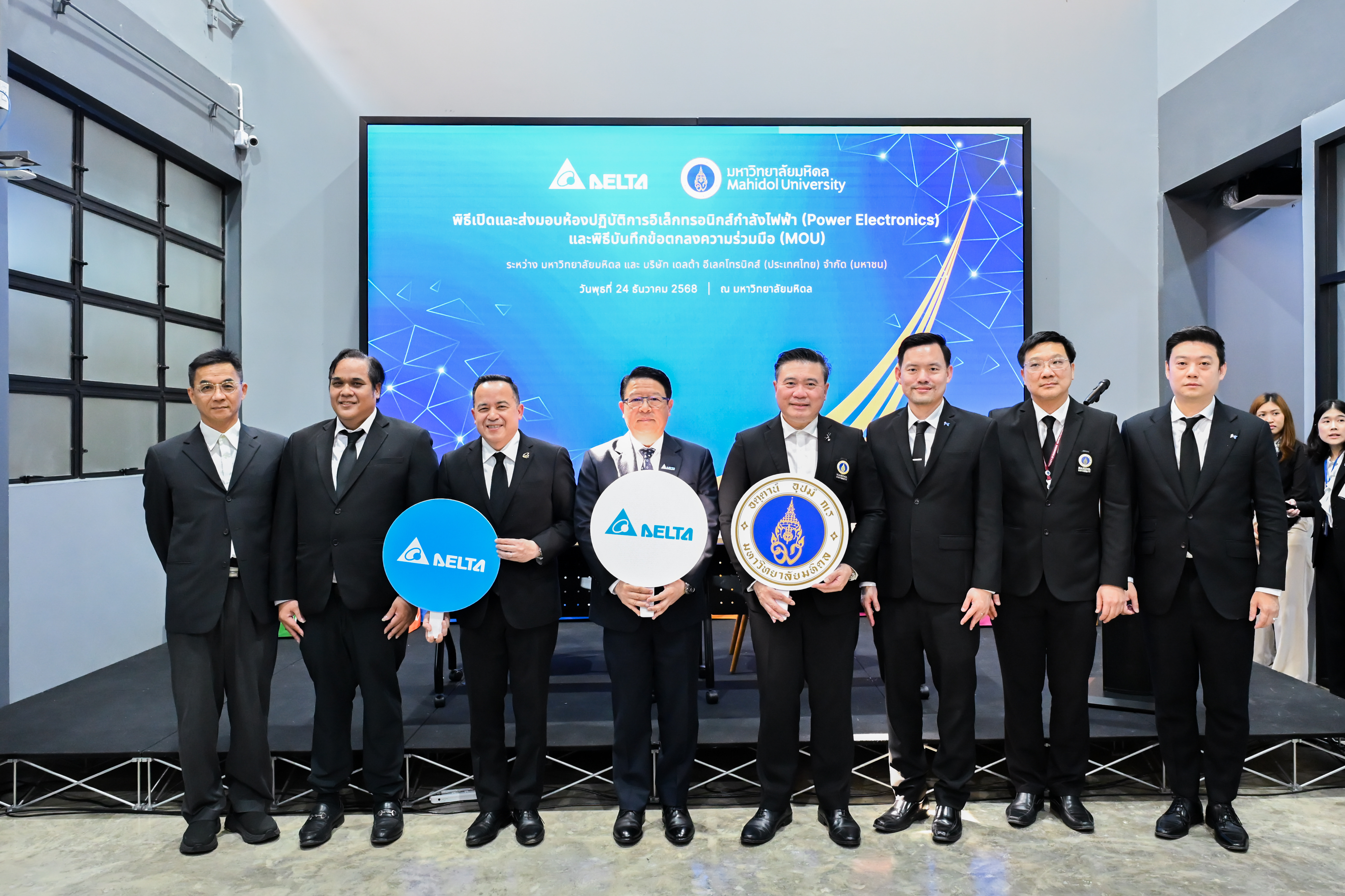 วันที่ 24 ธันวาคม 2568 มหาวิทยาลัยมหิดล ร่วมกับ บริษัท เดลต้า อีเลคโทรนิคส์ (ประเทศไทย) จำกัด (มหาชน) จัดพิธีเปิดและส่งมอบห้องปฏิบัติการอิเล็กทรอนิกส์กำลังไฟฟ้า (Power Electronics) พร้อมลงนามบันทึกข้อตกลงความร่วมมือ (MOU) เพื่อเสริมสร้างความเข้มแข็งด้านการเรียนการสอน การวิจัย และการพัฒนานวัตกรรมทางวิศวกรรมศาสตร์ โอกาสนี้ รองศาสตราจารย์ ดร.สิทธิวัฒน์ เลิศศิริ รองอธิการบดีมหาวิทยาลัยมหิดล กล่าวต้อนรับ พร้อมลงนามความร่วมมือกับ คุณวิคเตอร์ เจิ้ง ประธานเจ้าหน้าที่บริหาร บริษัท เดลต้า อีเลคโทรนิคส์ (ประเทศไทย) จำกัด (มหาชน) โดยมี รองศาสตราจารย์ ดร.วิริยะ เตชะรุ่งโรจน์ ผู้อำนวยการสถาบันบริหารจัดการเทคโนโลยีและนวัตกรรม มหาวิทยาลัยมหิดล และผู้ช่วยศาสตราจารย์ ดร.รณชัย ศิโรเวฐนุกูล รักษาการแทนรองคณบดีฝ่ายการจัดการทุนมนุษย์และสารสนเทศ คณะวิศวกรรมศาสตร์ มหาวิทยาลัยมหิดล ร่วมกล่าวถึงความสำคัญของความร่วมมือระหว่าง มหาวิทยาลัยมหิดล กับ บริษัท เดลต้า อีเลคโทรนิคส์ (ประเทศไทย) จำกัด (มหาชน) ณ MaSHARES Co-working Space @MB มหาวิทยาลัยมหิดล ศาลายา