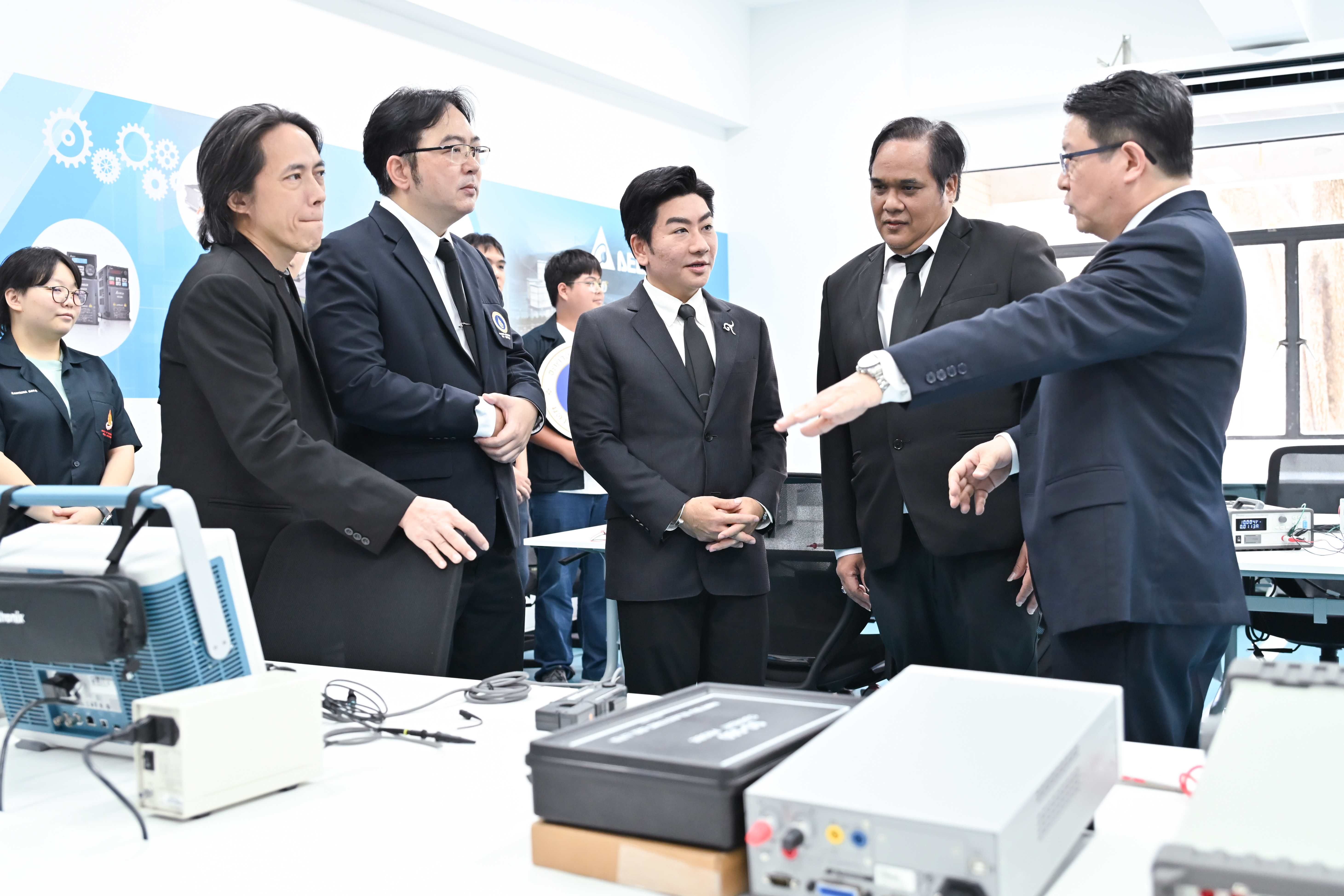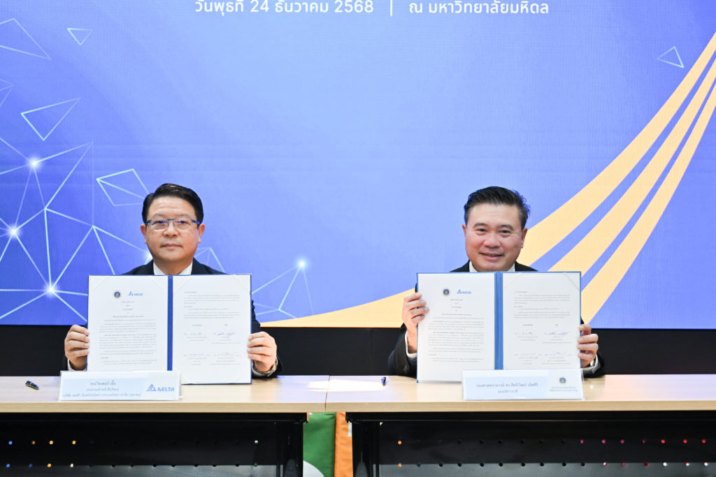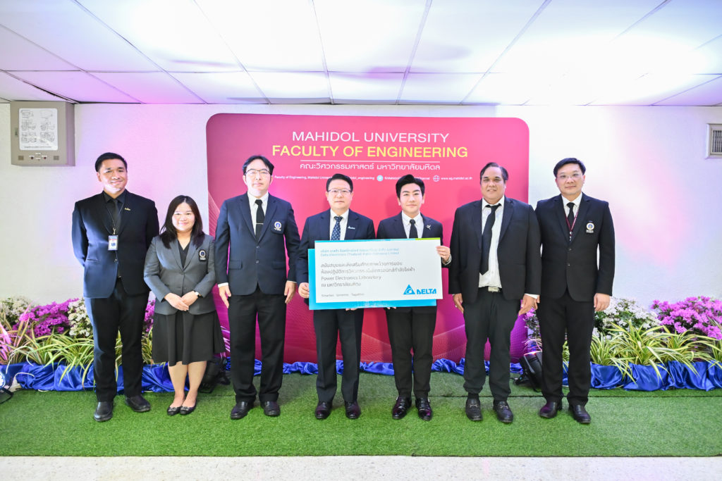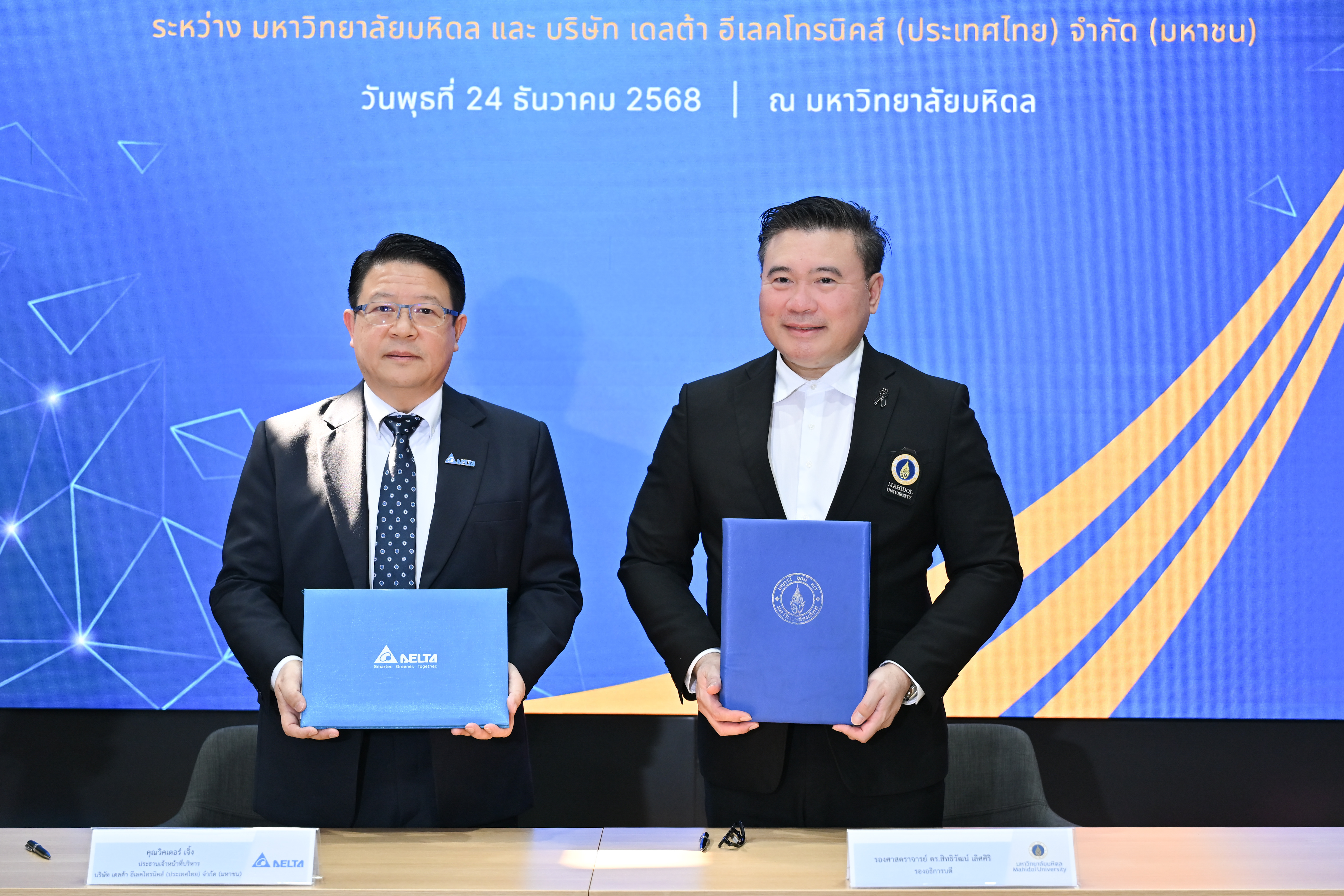 วันที่ 24 ธันวาคม 2568 มหาวิทยาลัยมหิดล ร่วมกับ บริษัท เดลต้า อีเลคโทรนิคส์ (ประเทศไทย) จำกัด (มหาชน) จัดพิธีเปิดและส่งมอบห้องปฏิบัติการอิเล็กทรอนิกส์กำลังไฟฟ้า (Power Electronics) พร้อมลงนามบันทึกข้อตกลงความร่วมมือ (MOU) เพื่อเสริมสร้างความเข้มแข็งด้านการเรียนการสอน การวิจัย และการพัฒนานวัตกรรมทางวิศวกรรมศาสตร์ โอกาสนี้ รองศาสตราจารย์ ดร.สิทธิวัฒน์ เลิศศิริ รองอธิการบดีมหาวิทยาลัยมหิดล กล่าวต้อนรับ พร้อมลงนามความร่วมมือกับ คุณวิคเตอร์ เจิ้ง ประธานเจ้าหน้าที่บริหาร บริษัท เดลต้า อีเลคโทรนิคส์ (ประเทศไทย) จำกัด (มหาชน) โดยมี รองศาสตราจารย์ ดร.วิริยะ เตชะรุ่งโรจน์ ผู้อำนวยการสถาบันบริหารจัดการเทคโนโลยีและนวัตกรรม มหาวิทยาลัยมหิดล และผู้ช่วยศาสตราจารย์ ดร.รณชัย ศิโรเวฐนุกูล รักษาการแทนรองคณบดีฝ่ายการจัดการทุนมนุษย์และสารสนเทศ คณะวิศวกรรมศาสตร์ มหาวิทยาลัยมหิดล ร่วมกล่าวถึงความสำคัญของความร่วมมือระหว่าง มหาวิทยาลัยมหิดล กับ บริษัท เดลต้า อีเลคโทรนิคส์ (ประเทศไทย) จำกัด (มหาชน) ณ MaSHARES Co-working Space @MB มหาวิทยาลัยมหิดล ศาลายา