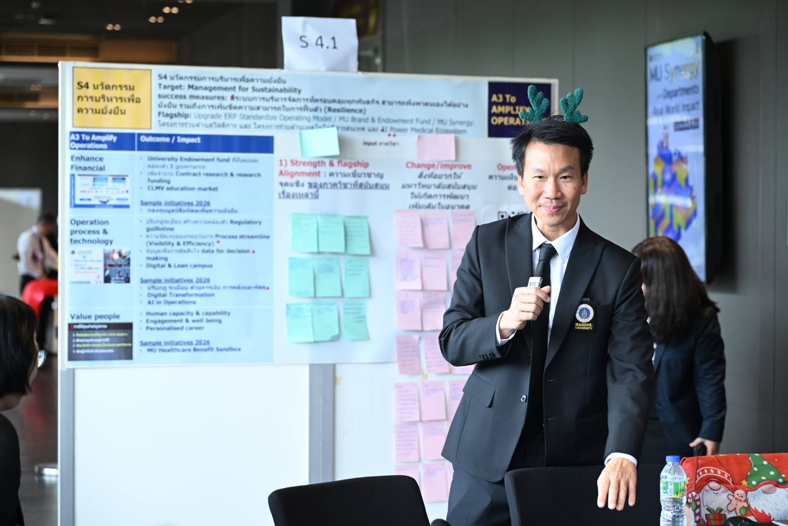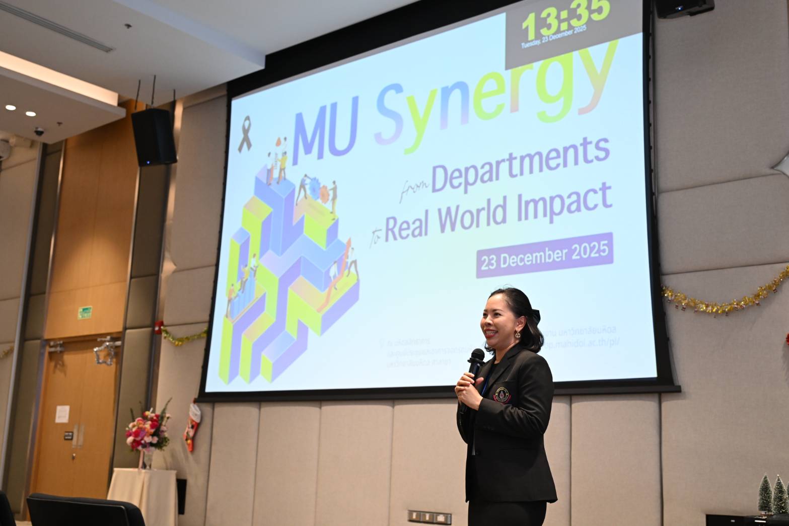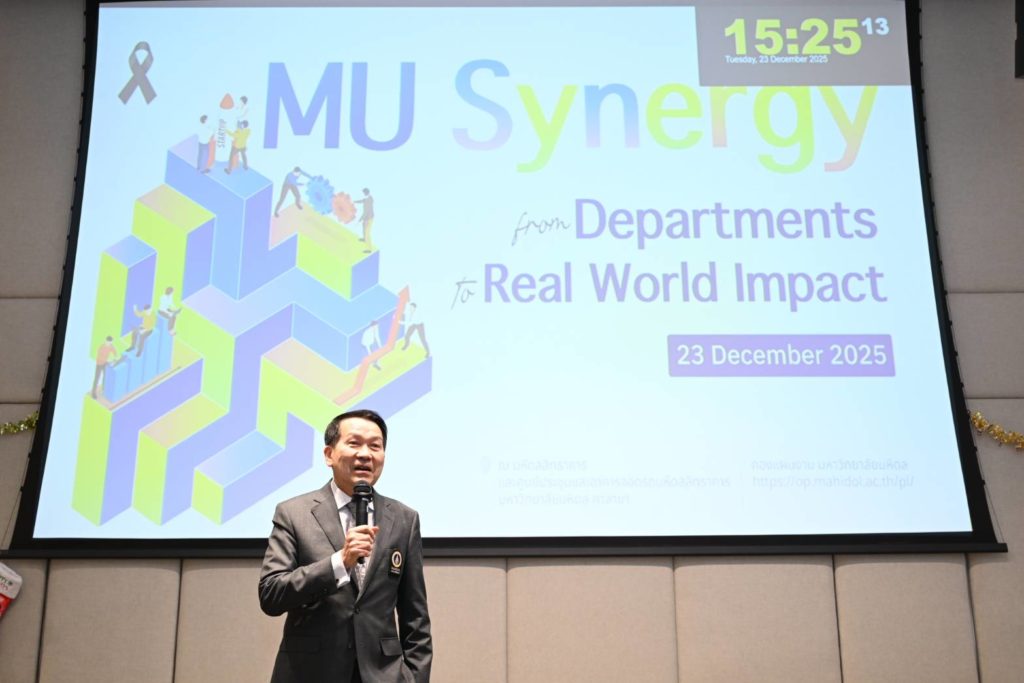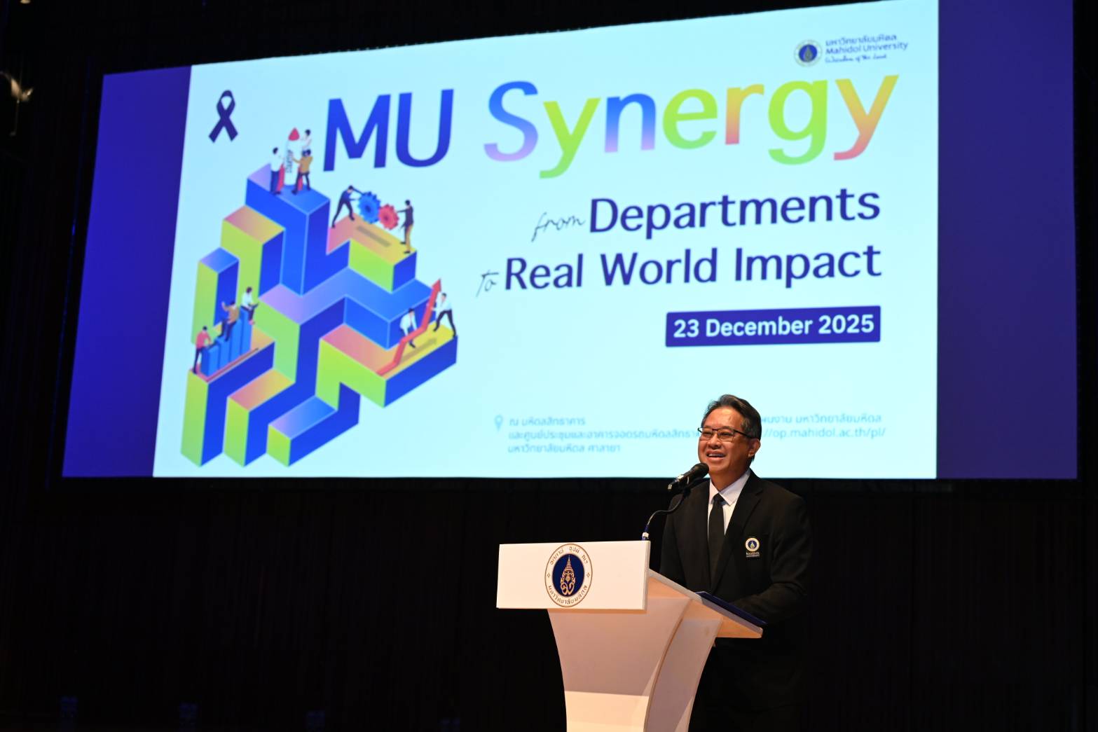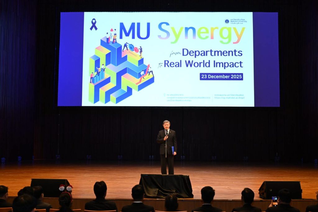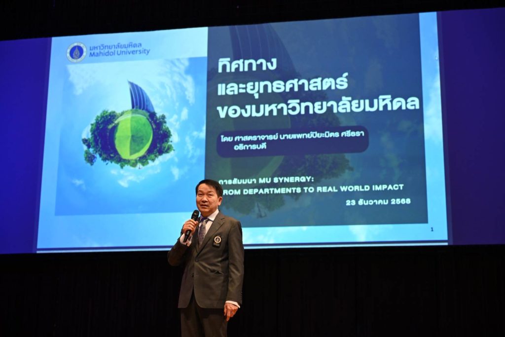 วันที่ 23 ธันวาคม 2568 มหาวิทยาลัยมหิดล จัดการสัมมนาเชิงยุทธศาสตร์เรื่อง “MU Synergy: from Departments to Real World Impact” โดยได้รับเกียรติจาก ศาสตราจารย์คลินิกเกียรติคุณ นายแพทย์ปิยะสกล สกลสัตยาทร นายกสภามหาวิทยาลัยมหิดล เป็นประธานกล่าวเปิดการสัมมนา จากนั้น การสื่อสารทิศทางยุทธศาสตร์มหาวิทยาลัย ภายใต้กรอบแนวคิด 4S, 3A และโครงการขับเคลื่อนระดับมหาวิทยาลัย (Flagship Projects) ประจำปีงบประมาณ พ.ศ. 2569 นำโดย ศาสตราจารย์ นายแพทย์ปิยะมิตร ศรีธรา อธิการบดีมหาวิทยาลัยมหิดล พร้อมด้วย ศาสตราจารย์ นพ. ม.ล.ชาครีย์ กิติยากร รองอธิการบดีฝ่ายวิจัย ศาสตราจารย์ ดร. เภสัชกรเนติ สุขสมบูรณ์ รองอธิการบดีฝ่ายการศึกษา รองศาสตราจารย์ ร.ท. ทันตแพทย์ชัชชัย คุณาวิศรุต รองอธิการบดีฝ่ายกิจการนักศึกษาและศิษย์เก่าสัมพันธ์ ศาสตราจารย์ ดร. เภสัชกรสมภพ ประธานธุรารักษ์ รองอธิการบดีฝ่ายแผนกลยุทธ์ พัฒนาคุณภาพและพันธกิจเพื่อสังคม และดร.ศรายุธ แสงจันทร์ รองอธิการบดีฝ่ายการคลัง ร่วมนำเสนอแนวทางการขับเคลื่อนยุทธศาสตร์ตามพันธกิจหลักของมหาวิทยาลัย ครอบคลุมทุกมิติสำคัญของการพัฒนาองค์กร ทั้งด้านการวิจัย ด้านการศึกษาและกิจการนักศึกษา ด้านบริการและพันธกิจเพื่อสังคม และด้านการบริหารจัดการ ให้เกิดความชัดเจนและสามารถนำไปสู่การปฏิบัติได้จริงในระดับส่วนงาน ณ มหิดลสิทธาคาร และศูนย์ประชุมและอาคารจอดรถมหิดลสิทธาคาร มหาวิทยาลัยมหิดล ศาลายา