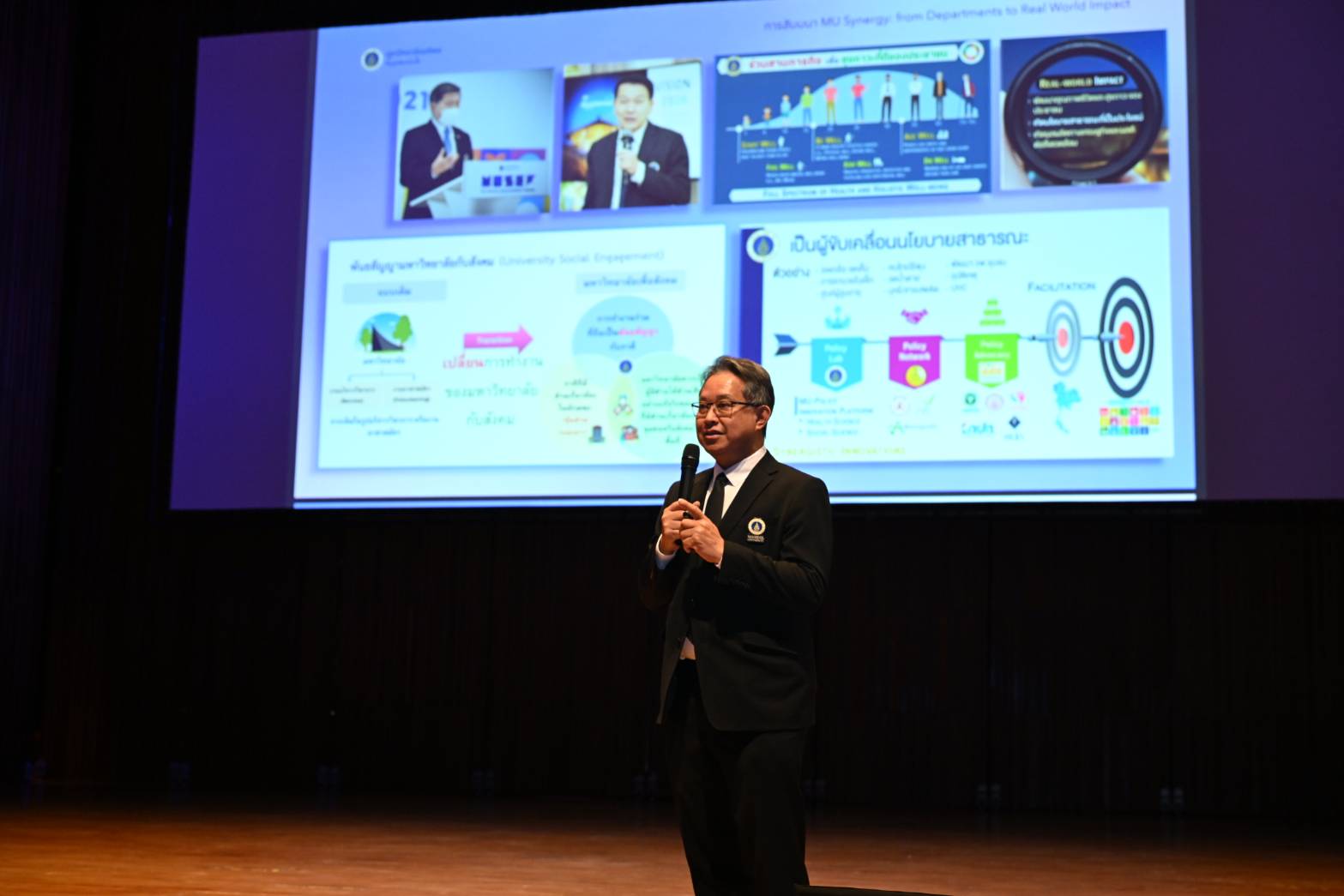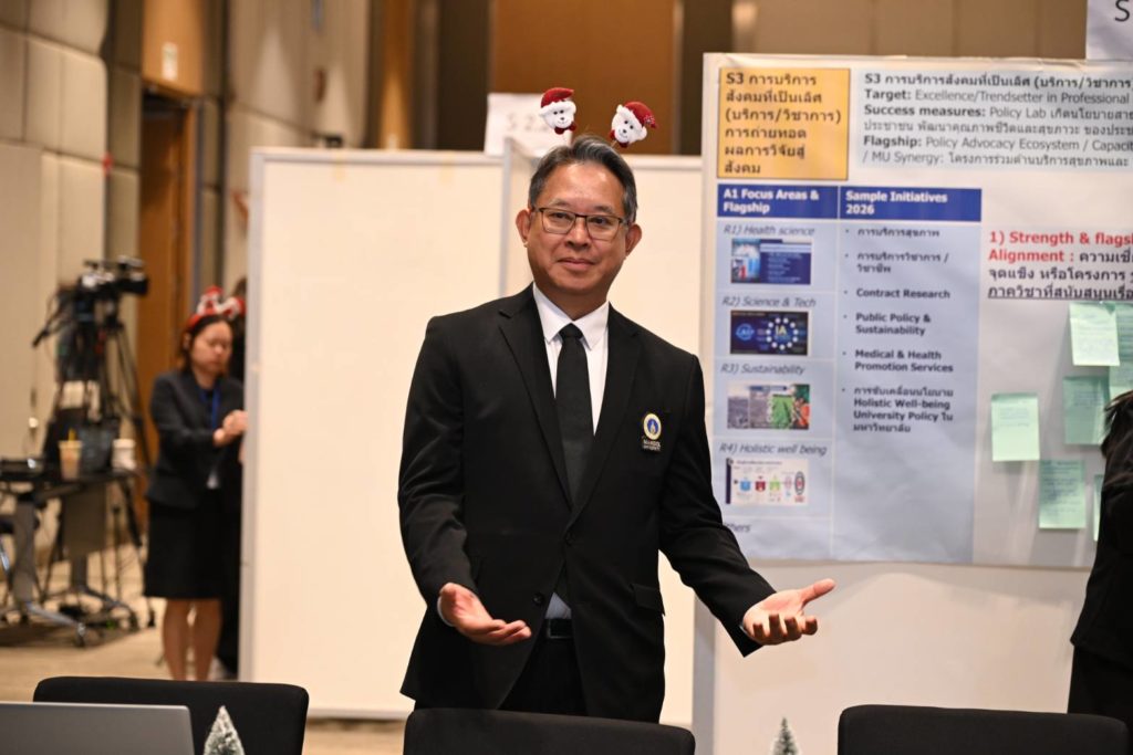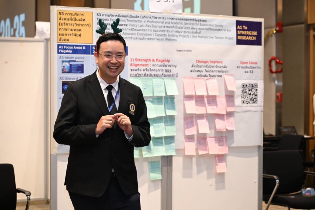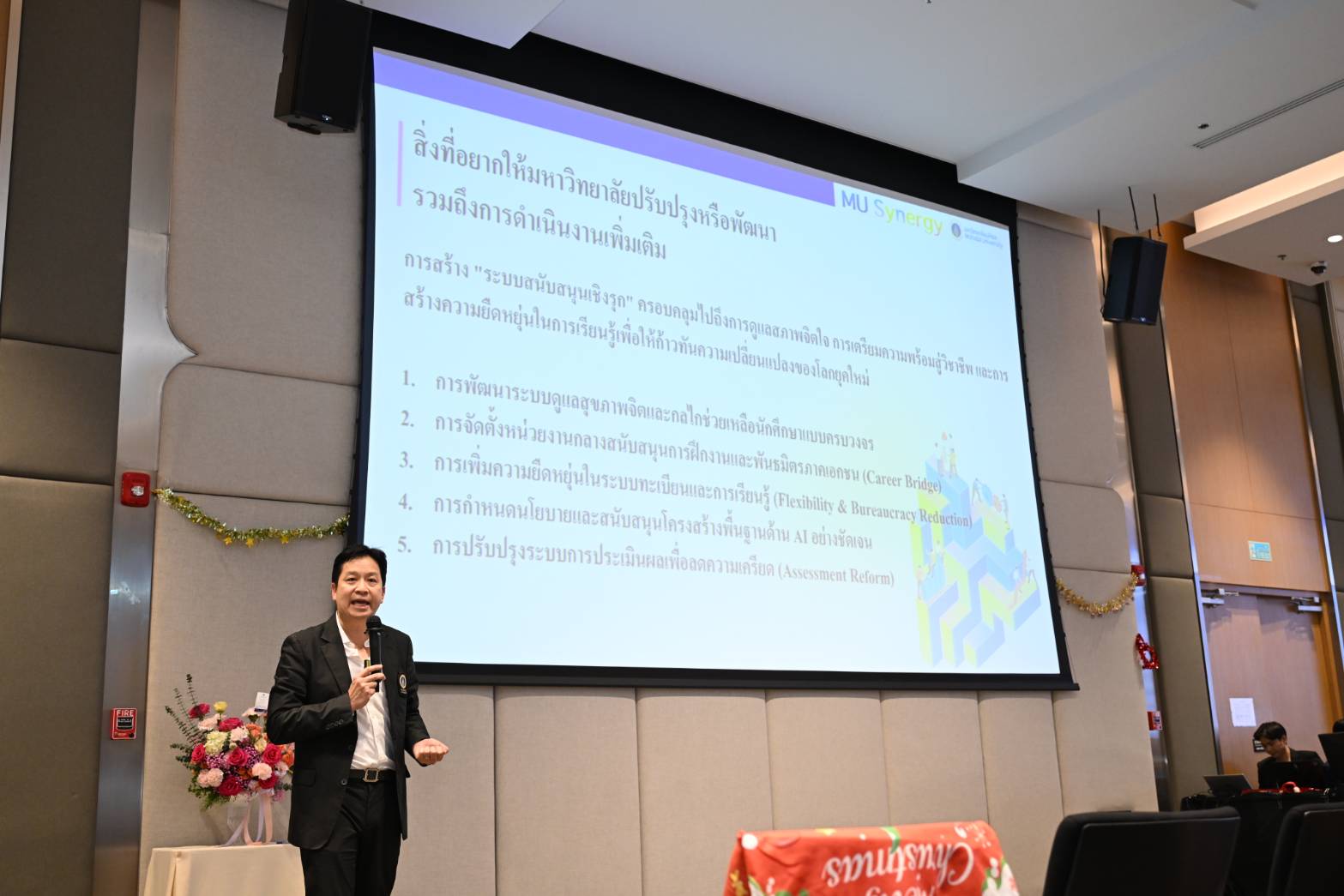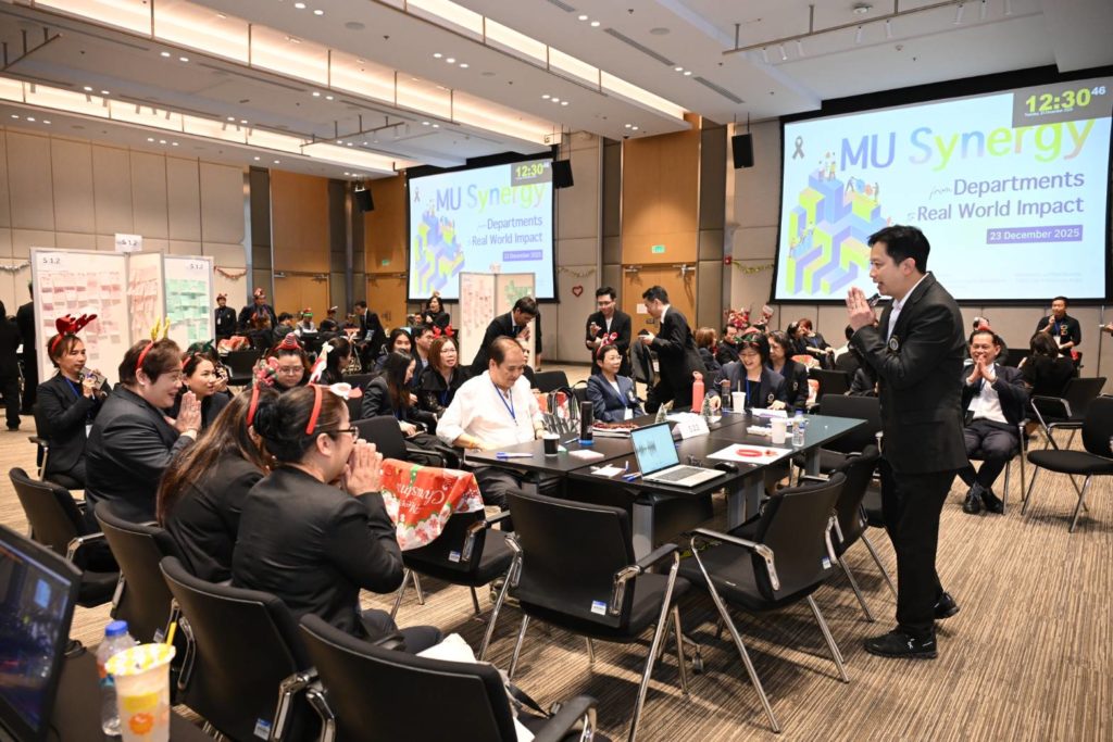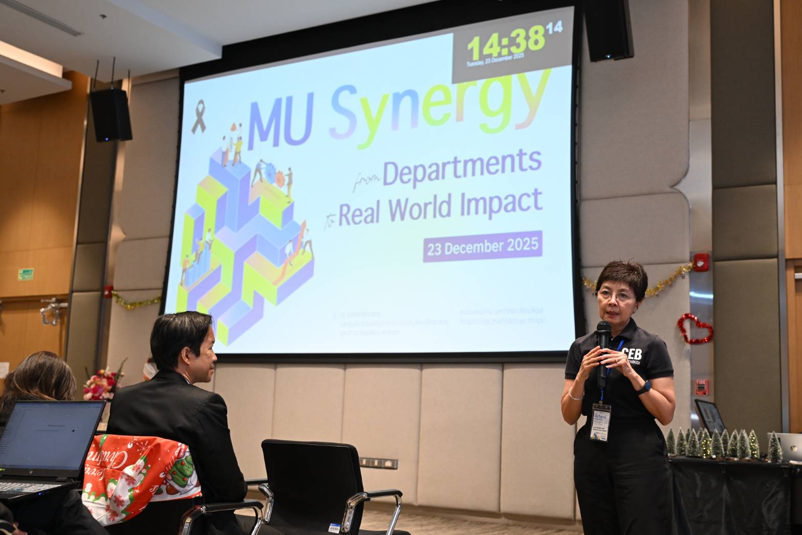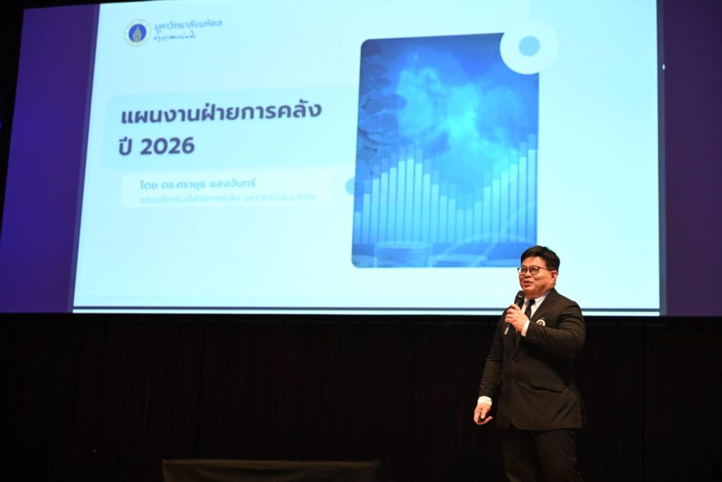 วันที่ 23 ธันวาคม 2568 มหาวิทยาลัยมหิดล จัดการสัมมนาเชิงยุทธศาสตร์เรื่อง “MU Synergy: from Departments to Real World Impact” โดยได้รับเกียรติจาก ศาสตราจารย์คลินิกเกียรติคุณ นายแพทย์ปิยะสกล สกลสัตยาทร นายกสภามหาวิทยาลัยมหิดล เป็นประธานกล่าวเปิดการสัมมนา จากนั้น การสื่อสารทิศทางยุทธศาสตร์มหาวิทยาลัย ภายใต้กรอบแนวคิด 4S, 3A และโครงการขับเคลื่อนระดับมหาวิทยาลัย (Flagship Projects) ประจำปีงบประมาณ พ.ศ. 2569 นำโดย ศาสตราจารย์ นายแพทย์ปิยะมิตร ศรีธรา อธิการบดีมหาวิทยาลัยมหิดล พร้อมด้วย ศาสตราจารย์ นพ. ม.ล.ชาครีย์ กิติยากร รองอธิการบดีฝ่ายวิจัย ศาสตราจารย์ ดร. เภสัชกรเนติ สุขสมบูรณ์ รองอธิการบดีฝ่ายการศึกษา รองศาสตราจารย์ ร.ท. ทันตแพทย์ชัชชัย คุณาวิศรุต รองอธิการบดีฝ่ายกิจการนักศึกษาและศิษย์เก่าสัมพันธ์ ศาสตราจารย์ ดร. เภสัชกรสมภพ ประธานธุรารักษ์ รองอธิการบดีฝ่ายแผนกลยุทธ์ พัฒนาคุณภาพและพันธกิจเพื่อสังคม และดร.ศรายุธ แสงจันทร์ รองอธิการบดีฝ่ายการคลัง ร่วมนำเสนอแนวทางการขับเคลื่อนยุทธศาสตร์ตามพันธกิจหลักของมหาวิทยาลัย ครอบคลุมทุกมิติสำคัญของการพัฒนาองค์กร ทั้งด้านการวิจัย ด้านการศึกษาและกิจการนักศึกษา ด้านบริการและพันธกิจเพื่อสังคม และด้านการบริหารจัดการ ให้เกิดความชัดเจนและสามารถนำไปสู่การปฏิบัติได้จริงในระดับส่วนงาน ณ มหิดลสิทธาคาร และศูนย์ประชุมและอาคารจอดรถมหิดลสิทธาคาร มหาวิทยาลัยมหิดล ศาลายา