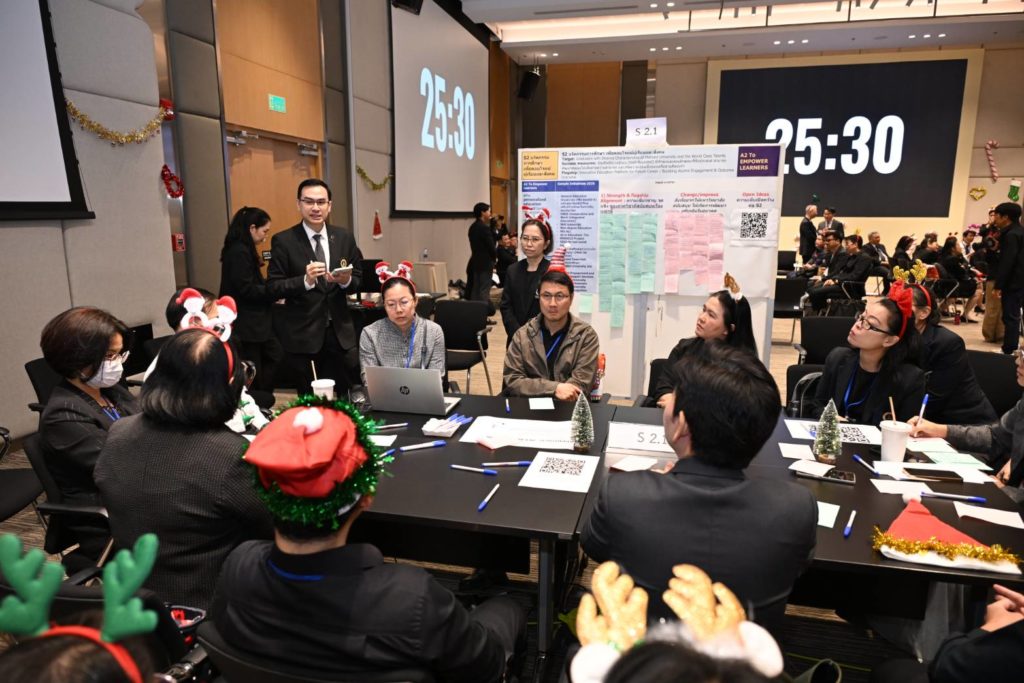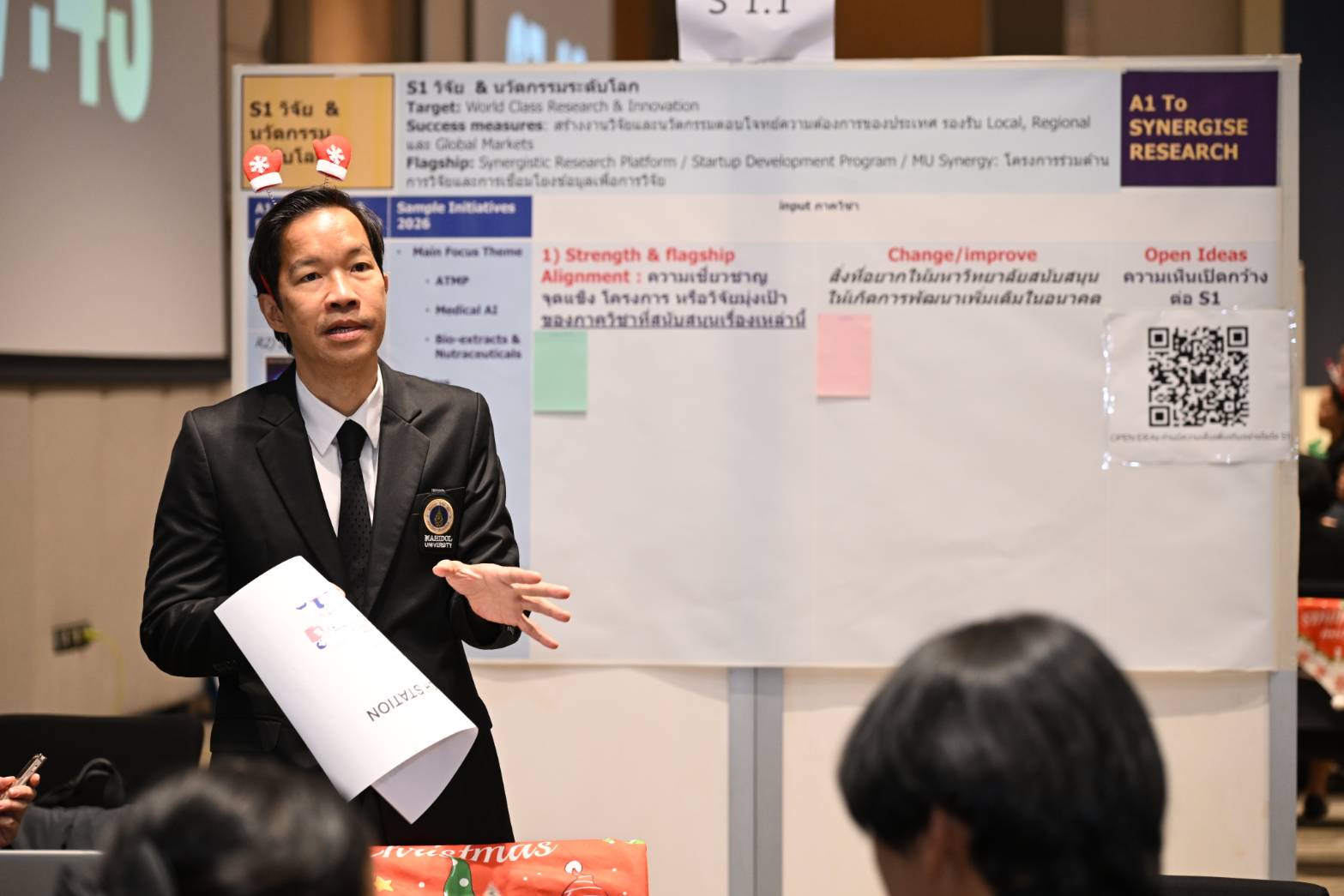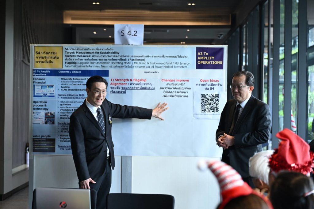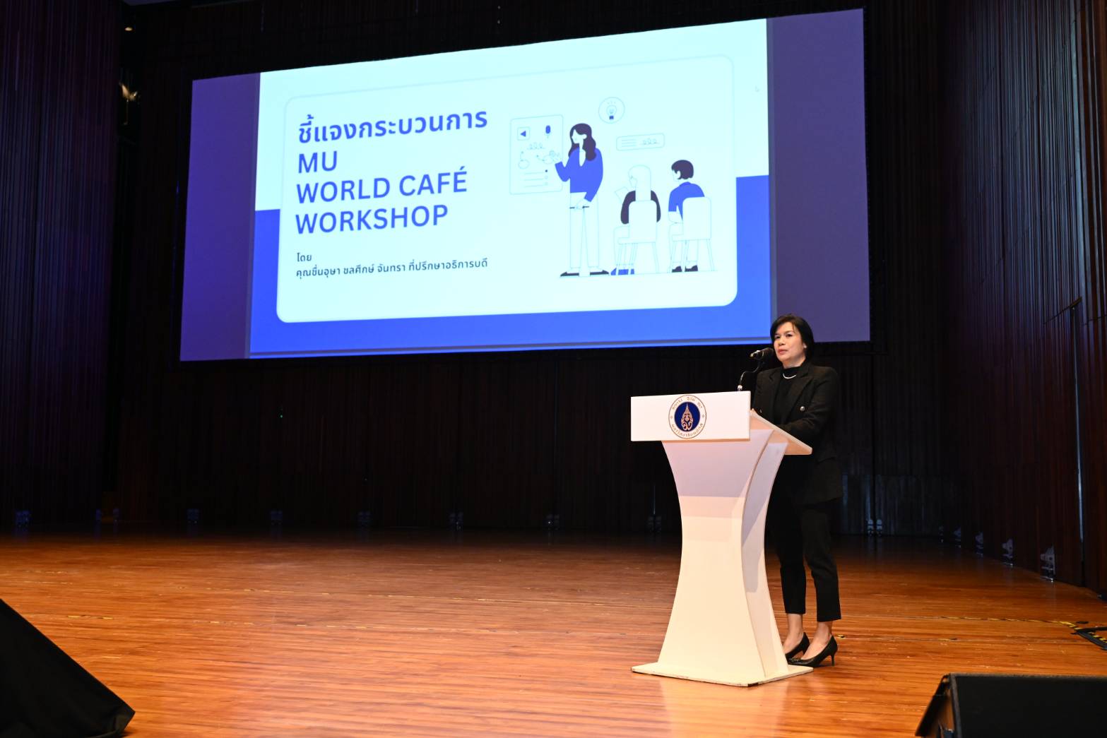 ภายในงานมีการชี้แจงกระบวนการ MU World Café Workshop ซึ่งเป็นกลไกสำคัญในการเปิดพื้นที่แลกเปลี่ยนความคิดเห็นอย่างสร้างสรรค์ โดย คุณชื่นอุษา ชลศึกษ์ จันทรา ที่ปรึกษาอธิการบดีมหาวิทยาลัยมหิดล จากนั้นเป็นการแบ่งกลุ่มระดมความคิดเห็นในรูปแบบ World Café Workshop โดยแบ่งออกเป็น 4 สถานี ตามกรอบแนวคิด 4S และ Focus Areas เพื่อให้ผู้บริหาร หัวหน้าภาค และผู้แทนส่วนงาน ได้ร่วมกันสะท้อนมุมมอง แลกเปลี่ยนประสบการณ์ และนำเสนอข้อเสนอเชิงยุทธศาสตร์อย่างเป็นระบบ โดยในภาคบ่ายเป็นการสรุปผลลัพธ์และทิศทางกลยุทธ์ตามมิติ S1–S4 (Synthesizing Success: Key Outputs and Insights from S1–S4) โดยตัวแทนภาควิชาและรองอธิการบดีตามพันธกิจหลัก พร้อมการบรรยายสร้างแรงบันดาลใจในหัวข้อ “YOUR VOICE Does Matter” โดย คุณชื่นอุษา ชลศึกษ์ จันทรา และหัวข้อ “YOU ARE THE SOLID LINK – หัวหน้าภาคคือหัวใจของการผลักดันความสำเร็จ” โดย ศาสตราจารย์ ดร. เภสัชกรสมภพ ประธานธุรารักษ์ ซึ่งสะท้อนบทบาทสำคัญของหัวหน้าภาคในการเชื่อมโยงยุทธศาสตร์สู่การปฏิบัติจริง