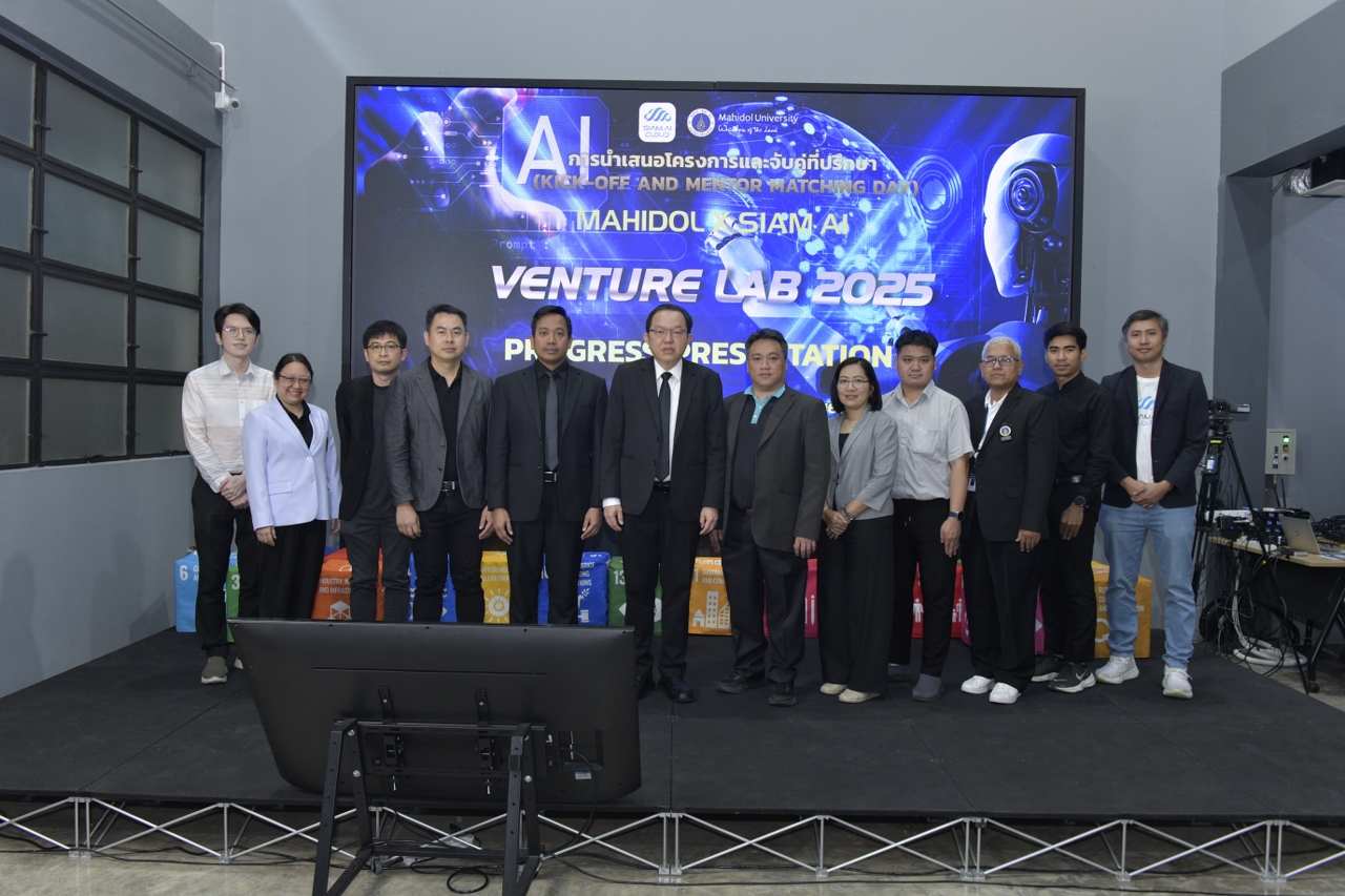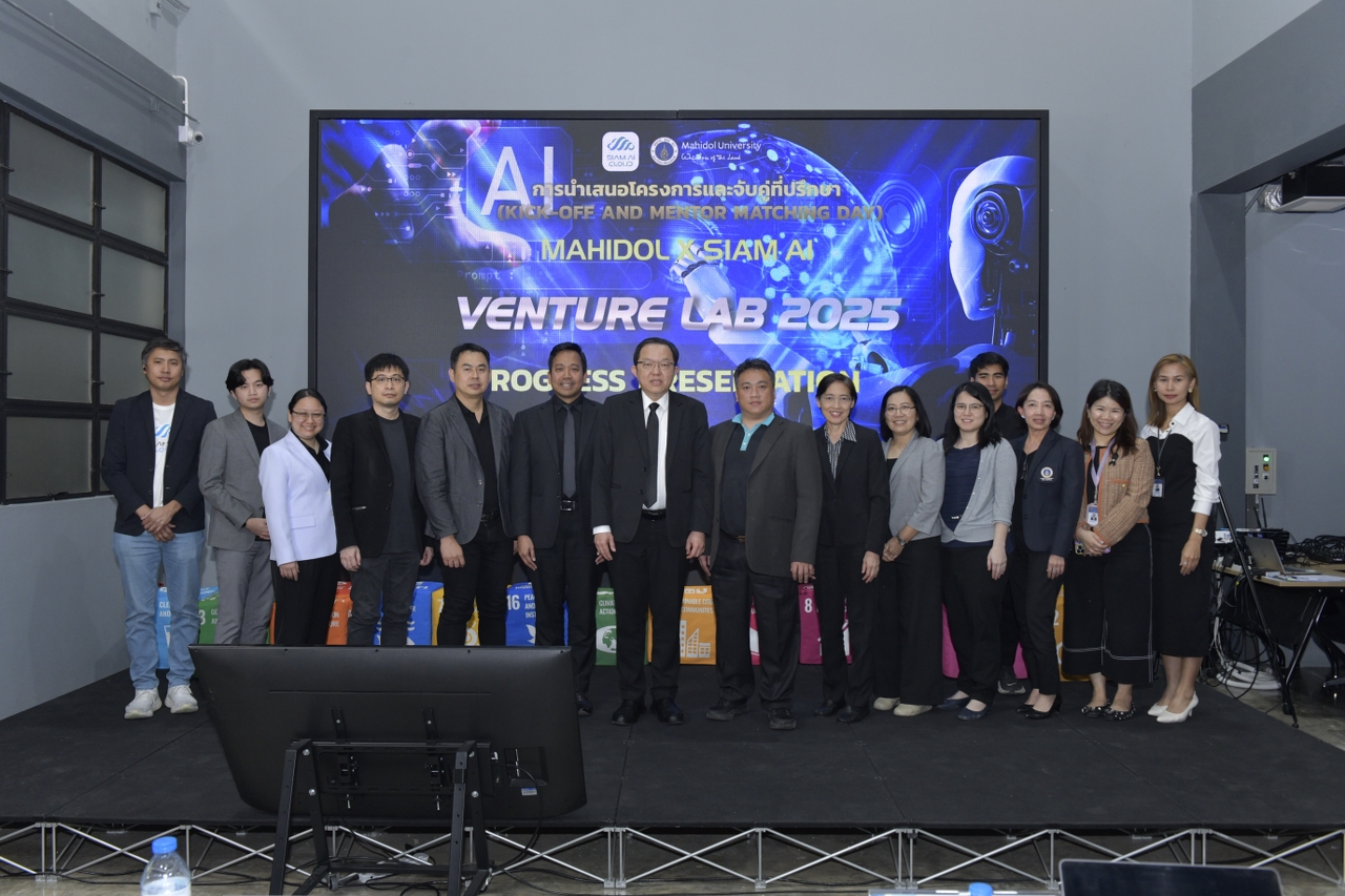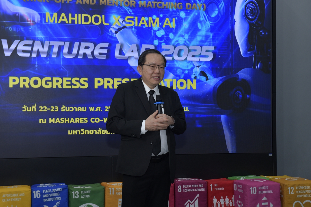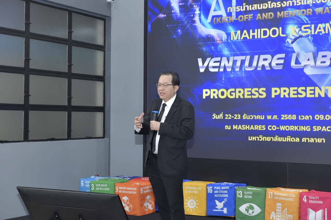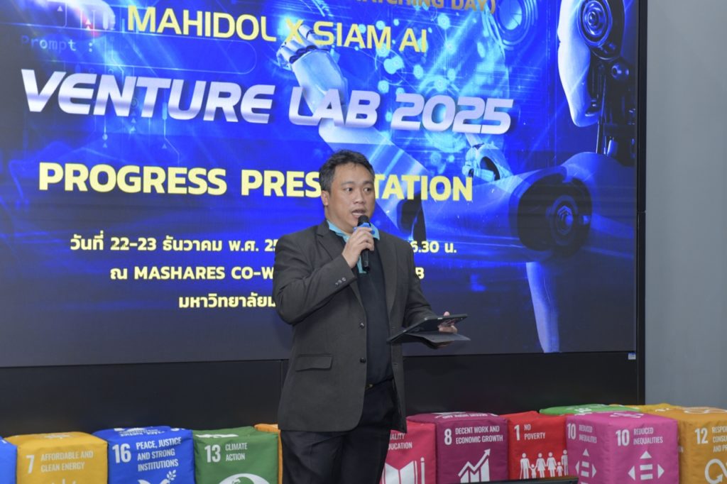 กิจกรรม “Progress Presentation” โครงการ Mahidol x Siam AI Venture Lab 2025 Phase 2: Mentorship & Acceleration Program” ในรอบของการนำเสนอความก้าวหน้าของโครงการ และ Workshop จัดขึ้นระหว่างวันที่ 22-23 ธันวาคม 2568 โดย กองเทคโนโลยีสารสนเทศ มหาวิทยาลัยมหิดล และจะมีการประกาศผลโครงการที่ได้รับคัดเลือกในวันที่ 26 มกราคม 2569 เพื่อนำนวัตกรรมด้านปัญญาประดิษฐ์ (AI) ทางการแพทย์และสุขภาพของมหาวิทยาลัย ไปต่อยอดสู่การเป็นธุรกิจสตาร์ทอัพต่อไป