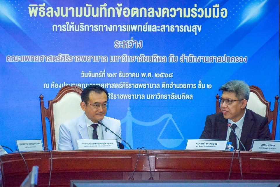 วันที่ 29 ธันวาคม 2568 ศาสตราจารย์ นายแพทย์อภิชาติ อัศวมงคลกุล คณบดีคณะแพทยศาสตร์ศิริราชพยาบาล มหาวิทยาลัยมหิดล พร้อมด้วย นายเจตน์ สถาวรศีลพร เลขาธิการสำนักงานศาลปกครอง ร่วมลงนามบันทึกข้อตกลงความร่วมมือทางวิชาการ ด้านการให้บริการทางการแพทย์และสาธารณสุข โดยมี ผู้บริหารทั้งสองฝ่ายร่วมเป็นสักขีพยาน ณ ห้องประชุมคณะแพทยศาสตร์ศิริราชพยาบาล ตึกอำนวยการ ชั้น 2 คณะแพทยศาสตร์ศิริราชพยาบาล มหาวิทยาลัยมหิดล