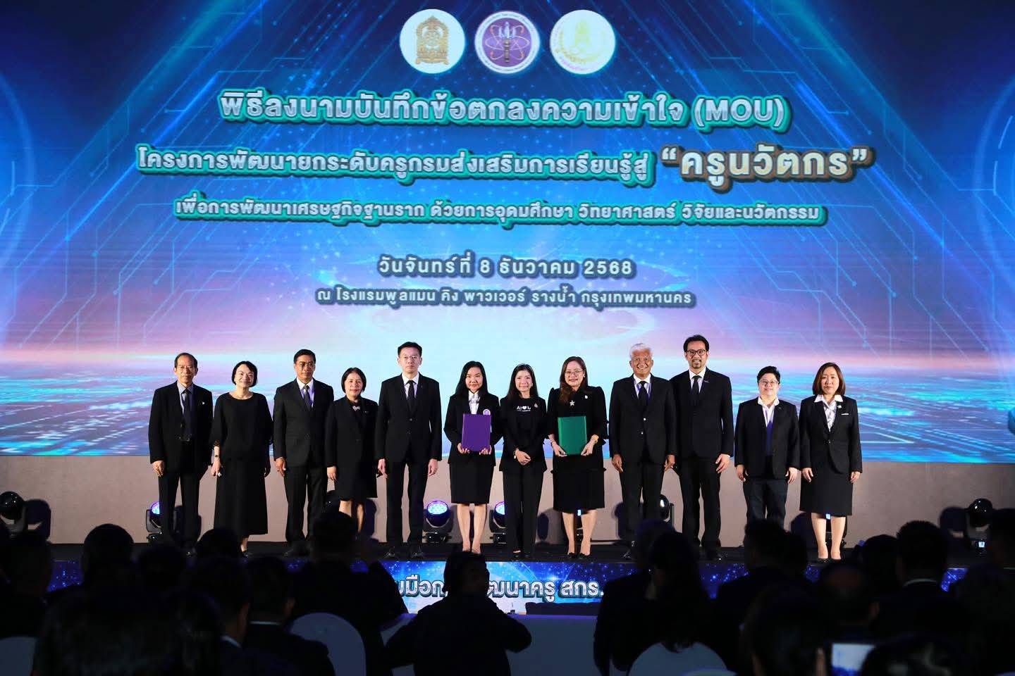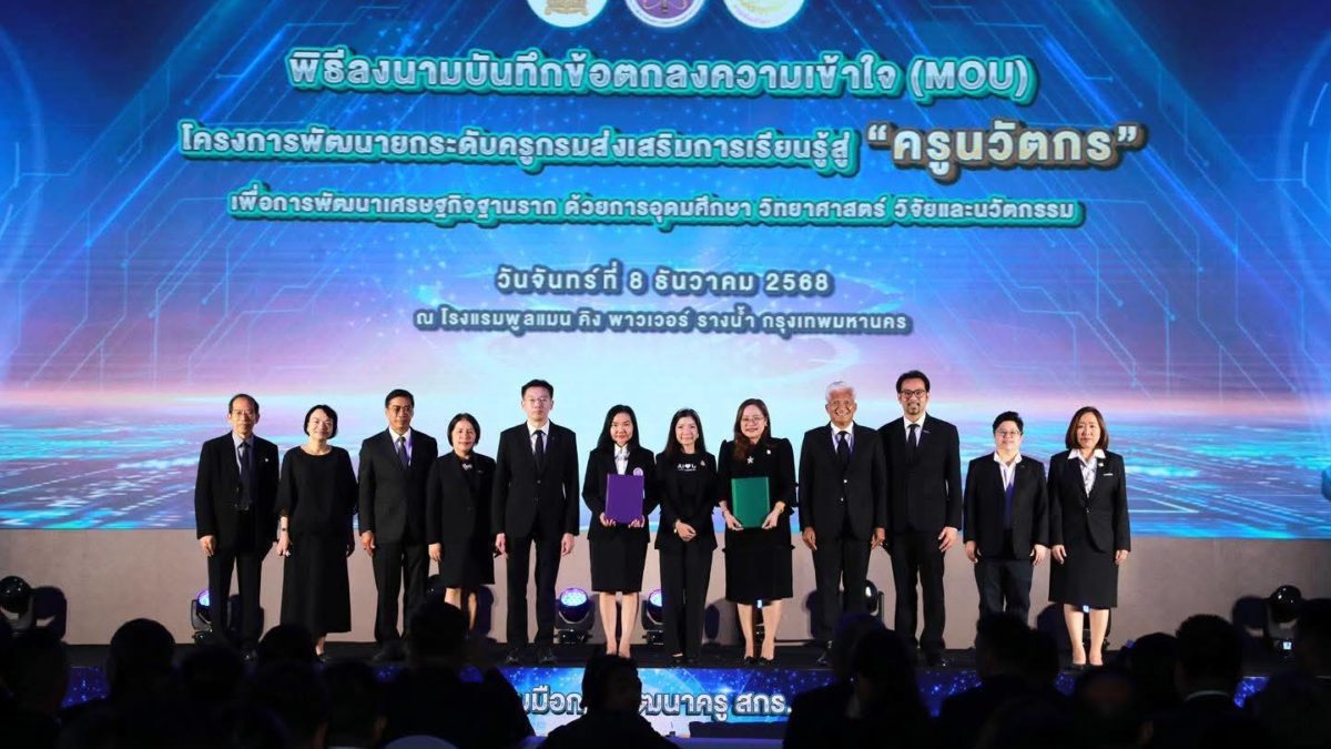 วันที่ 8 ธันวาคม 2568 ผู้ช่วยศาสตราจารย์ ดร.ธัชวีร์ ลีละวัฒน์ รองอธิการบดีฝ่ายวิทยาเขตกาญจนบุรี มหาวิทยาลัยมหิดล เข้าร่วมพิธีลงนามบันทึกข้อตกลงความเข้าใจ (MOU) โครงการพัฒนายกระดับครูกรมส่งเสริมการเรียนรู้สู่ครูนวัตกร เพื่อการพัฒนาเศรษฐกิจฐานรากด้วย อววน. สำหรับ “โครงการพัฒนายกระดับครูกรมส่งเสริมการเรียนรู้สู่ครูนวัตกร” มีเป้าหมายหลักเพื่อบูรณาการทรัพยากรและสร้างเครือข่ายความร่วมมือด้าน อววน. โดยมุ่งเน้นการบ่มเพาะครูกรมส่งเสริมการเรียนรู้ (สกร.) ให้มีความพร้อมทั้งองค์ความรู้และการปฏิบัติจริง เพื่อก้าวสู่การเป็น “ครูนวัตกร” ที่มีทักษะแห่งศตวรรษที่ 21 ณ โรงแรมพูลแมน คิงเพาเวอร์ รางน้ำ กรุงเทพฯ