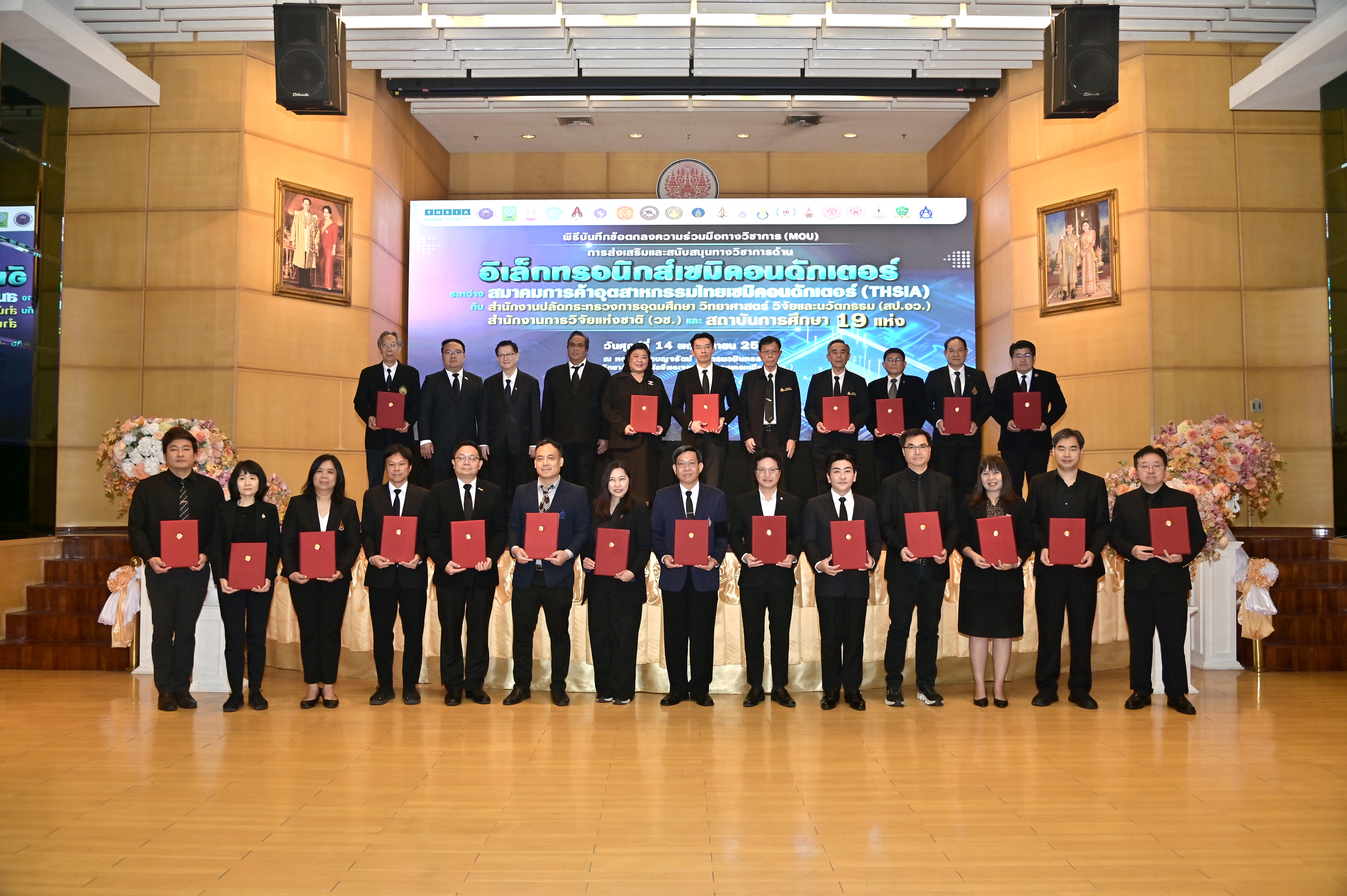 วันที่ 14 พฤศจิกายน 2568 รองศาสตราจารย์ ดร.ธนภัทร์ วานิชานนท์ คณบดีคณะวิศวกรรมศาสตร์ มหาวิทยาลัยมหิดล เป็นผู้แทนมหาวิทยาลัยมหิดล เข้าร่วมพิธีลงนามบันทึกข้อตกลงความร่วมมือทางวิชาการกับ สำนักงานปลัดกระทรวงการอุดมศึกษา วิทยาศาสตร์ วิจัยและนวัตกรรม (สป.อว.) สำนักงานการวิจัยแห่งชาติ (วช.) สมาคมการค้าอุตสาหกรรมไทยเซมิคอนดักเตอร์ และ 19 มหาวิทยาลัยเครือข่าย โดยมี ศาสตราจารย์ ดร.ศุภชัย ปทุมนากุล ปลัดกระทรวงการอุดมศึกษา วิทยาศาสตร์ วิจัยและนวัตกรรม (อว.) เป็นประธานในพิธี เพื่อเสริมสร้างความร่วมมือทางวิชาการและการวิจัย ให้มีความเข้มแข็ง สามารถตอบสนองต่อนโยบายของรัฐบาล ในการผลิตกำลังคนที่สอดคล้องกับความต้องการของภาคอุตสาหกรรมในด้านเซมิคอนดักเตอร์และแผ่นวงจรพิมพ์ ซึ่งเป็นอุตสาหกรรมที่เติบโตอย่างรวดเร็วในปัจจุบัน ณ หอประชุมเบญจรัตน์ อาคารนวมินทราราชินี มหาวิทยาลัยเทคโนโลยีพระจอมเกล้า พระนครเหนือ