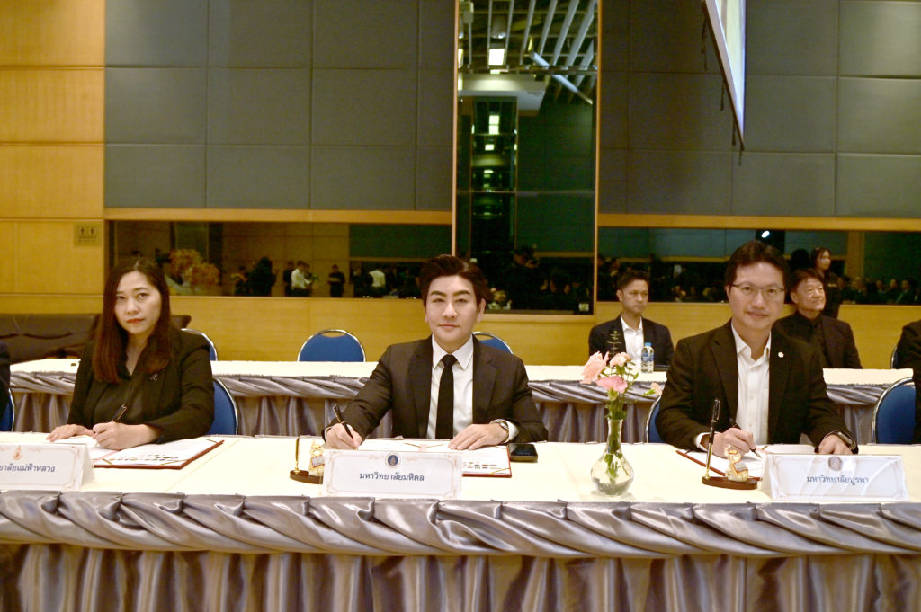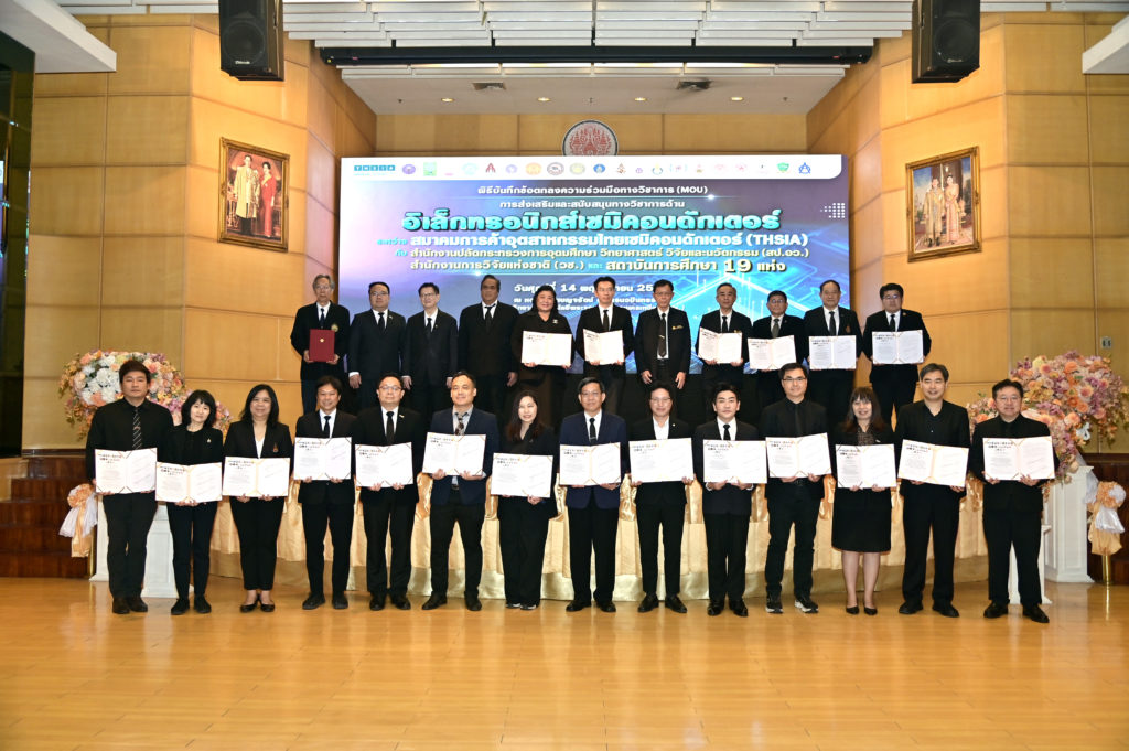 วันที่ 14 พฤศจิกายน 2568 รองศาสตราจารย์ ดร.ธนภัทร์ วานิชานนท์ คณบดีคณะวิศวกรรมศาสตร์ มหาวิทยาลัยมหิดล เป็นผู้แทนมหาวิทยาลัยมหิดล เข้าร่วมพิธีลงนามบันทึกข้อตกลงความร่วมมือทางวิชาการกับ สำนักงานปลัดกระทรวงการอุดมศึกษา วิทยาศาสตร์ วิจัยและนวัตกรรม (สป.อว.) สำนักงานการวิจัยแห่งชาติ (วช.) สมาคมการค้าอุตสาหกรรมไทยเซมิคอนดักเตอร์ และ 19 มหาวิทยาลัยเครือข่าย โดยมี ศาสตราจารย์ ดร.ศุภชัย ปทุมนากุล ปลัดกระทรวงการอุดมศึกษา วิทยาศาสตร์ วิจัยและนวัตกรรม (อว.) เป็นประธานในพิธี เพื่อเสริมสร้างความร่วมมือทางวิชาการและการวิจัย ให้มีความเข้มแข็ง สามารถตอบสนองต่อนโยบายของรัฐบาล ในการผลิตกำลังคนที่สอดคล้องกับความต้องการของภาคอุตสาหกรรมในด้านเซมิคอนดักเตอร์และแผ่นวงจรพิมพ์ ซึ่งเป็นอุตสาหกรรมที่เติบโตอย่างรวดเร็วในปัจจุบัน ณ หอประชุมเบญจรัตน์ อาคารนวมินทราราชินี มหาวิทยาลัยเทคโนโลยีพระจอมเกล้า พระนครเหนือ