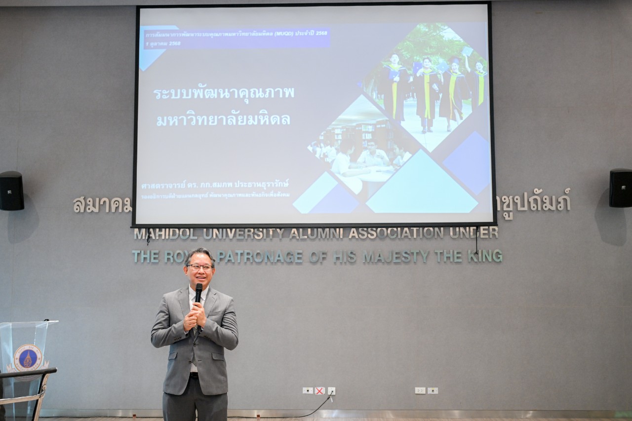 วันที่ 1 ตุลาคม 2568 ศาสตราจารย์ ดร. เภสัชกรสมภพ ประธานธุรารักษ์ รองอธิการบดีฝ่ายแผนกลยุทธ์ พัฒนาคุณภาพและพันธกิจเพื่อสังคม มหาวิทยาลัยมหิดล เป็นประธานเปิดโครงการสัมมนาพร้อมมอบนโยบาย ทิศทางการพัฒนาคุณภาพมหาวิทยาลัยมหิดลระยะต่อไป ในโครงการสัมมนาการพัฒนาระบบคุณภาพมหาวิทยาลัย (MUQD) ประจำปี 2568 โอกาสนี้ คุณศิริลักษณ์ เกี่ยวข้อง รองอธิการบดีฝ่ายโครงการจัดตั้งวิทยาเขตอำนาจเจริญ มหาวิทยาลัยมหิดล อาจารย์ ดร. เลิศยศ ตรีรัตนไพบูลย์ ผู้ช่วยอธิการบดีฝ่ายพัฒนาคุณภาพ มหาวิทยาลัยมหิดล และรองศาสตราจารย์ชวลิต วงษ์เอก AUN-QA Expert and Assessor ให้เกียรติเป็นวิทยากรบรรยายในโครงการ ณ ห้องประชุม พลตำรวจเอก นายแพทย์จงเจตน์ อาวเจนพงษ์ อาคารสิริวัฒนภักดี สมาคมศิษย์เก่ามหาวิทยาลัยมหิดล ในพระบรมราชูปถัมภ์