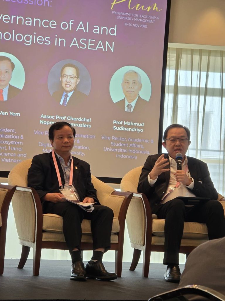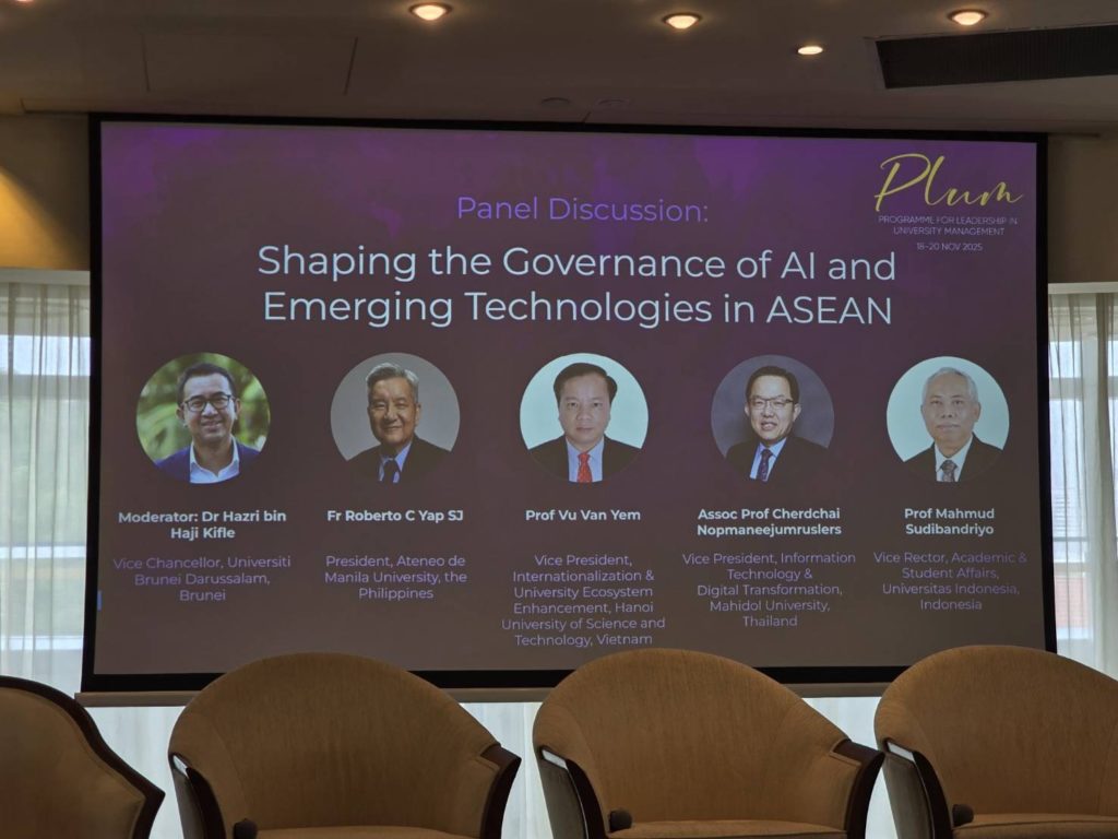 ในโอกาสนี้ รองศาสตราจารย์ นายแพทย์เชิดชัย นพมณีจำรัสเลิศ รองอธิการบดีฝ่ายสารสนเทศและดิจิทัลทรานส์ฟอร์เมชัน มหาวิทยาลัยมหิดล ร่วมการเสวนา “Universities as Regional Leaders: Shaping Policies and Governance of AI and Emerging Technologies in ASEAN” โดยมี Fr.Roberto C Yap SJ, President, Ateneo de Manila University, the Philippines Prof.Vu Van Yem, Vice President, Internationalization & University Ecosystem Enhancement, Hanoi University of Science and Technology, Vietnam Prof.Mahmud Sudibandriyo, Vice Rector, Academic & Student Affairs, Universitas Indonesia ร่วมการเสวนา ดำเนินรายการโดย Dr.Hazri bin Haji Kifle, Vice Chancellor, Universiti Brunei Darussalam เพื่อแลกเปลี่ยนมุมมองในฐานะที่มหาวิทยาลัยเป็นส่วนสำคัญ ที่มีบทบาทในการกำหนดกลยุทธ์ด้าน AI การพัฒนานโยบาย การสร้างความร่วมมือข้ามพรมแดน รวมถึงการส่งเสริมรูปแบบธรรมาภิบาลที่ครอบคลุมในระดับประเทศและภูมิภาค และสอดคล้องกับอัตลักษณ์ของอาเซียน
