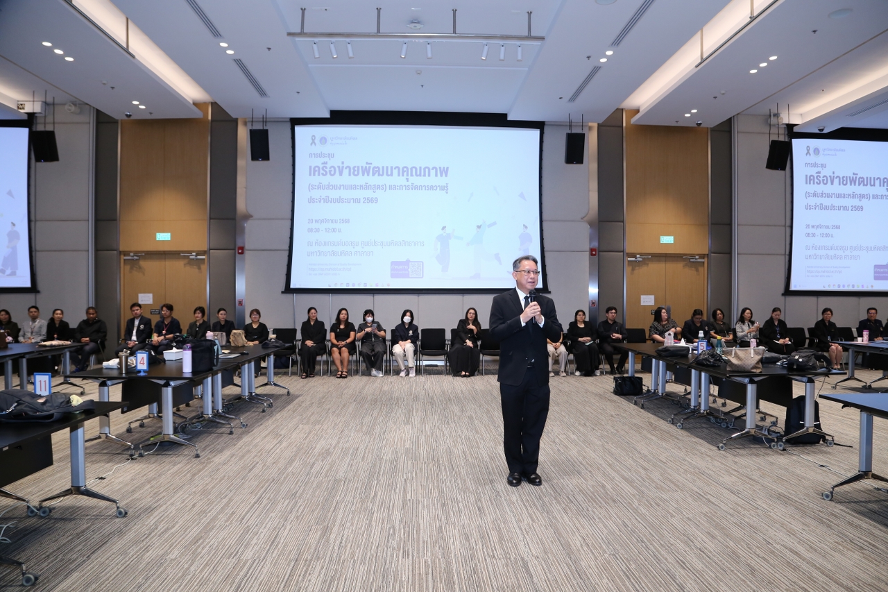 วันที่ 20 พฤศจิกายน 2568 ศาสตราจารย์ ดร. เภสัชกรสมภพ ประธานธุรารักษ์ รองอธิการบดีฝ่ายแผนกลยุทธ์ พัฒนาคุณภาพและพันธกิจเพื่อสังคม มหาวิทยาลัยมหิดล เป็นประธานเปิดการประชุมเครือข่ายพัฒนาคุณภาพ (ระดับส่วนงานและหลักสูตร) และการจัดการความรู้ ประจำปีงบประมาณ 2569 พร้อมถ่ายทอดนโยบายและแนวทางการพัฒนาคุณภาพของมหาวิทยาลัย สำหรับปีงบประมาณใหม่ ให้แก่ผู้บริหารและผู้ปฏิบัติงานด้านพัฒนาคุณภาพจากทุกส่วนงาน ทั้งในระดับส่วนงานและระดับหลักสูตร ณ ห้องแกรนด์บอลรูม ศูนย์ประชุมและอาคารจอดรถมหิดลสิทธาคาร มหาวิทยาลัยมหิดล ศาลายา