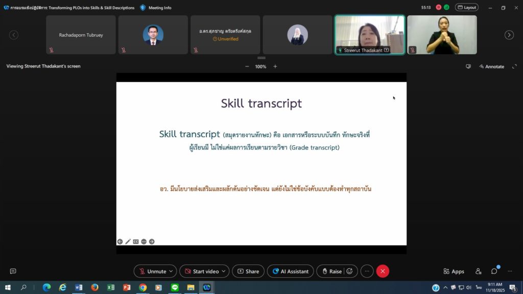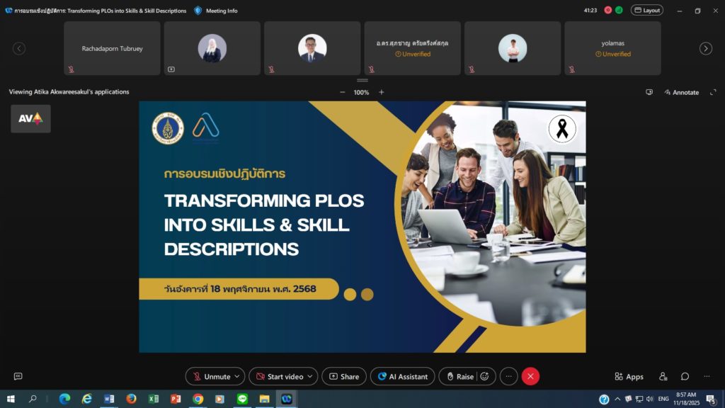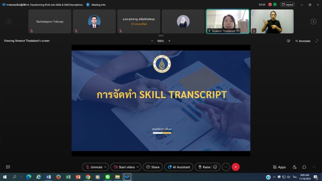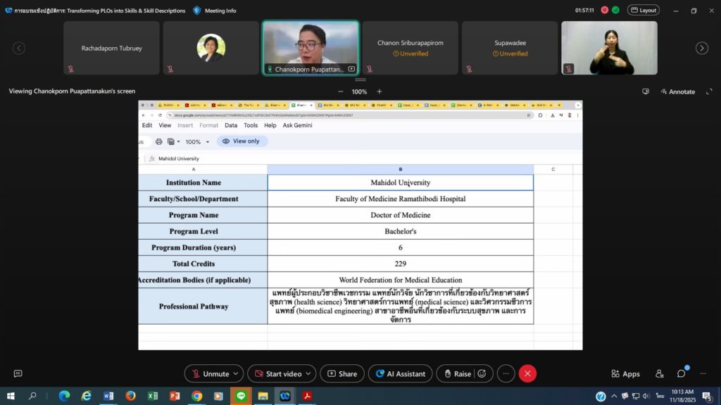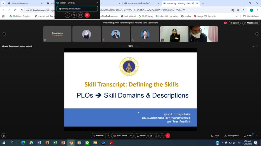 วันที่ 18 พฤศจิกายน 2568 ศาสตราจารย์ ดร. เภสัชกรเนติ สุขสมบูรณ์ รองอธิการบดีฝ่ายการศึกษา มหาวิทยาลัยมหิดล เป็นประธานกล่าวเปิดการอบรมเชิงปฏิบัติการ “Transforming PLOs into Skills & Skill Descriptions” โดย กองบริหารการศึกษา มหาวิทยาลัยมหิดล จัดขึ้นเพื่อเตรียมความพร้อมในการพัฒนา “เอกสารรับรองทักษะ” (Skill Transcript) ซึ่งจะใช้บันทึกและรับรองผลการพัฒนาทักษะและสมรรถนะของนักศึกษามหาวิทยาลัยมหิดลให้ตรงตามความต้องการที่แท้จริงของตลาดแรงงาน โดยมีประธานหลักสูตร และอาจารย์ผู้รับผิดชอบหลักสูตรระดับปริญญาตรีของมหาวิทยาลัยมหิดล เข้าร่วมการอบรมและกำหนดชุดทักษะและคำอธิบายระดับทักษะ (Skills & Skill Descriptions) ของแต่ละหลักสูตร ในรูปแบบออนไลน์ ผ่านระบบ Cisco Webex Meetings