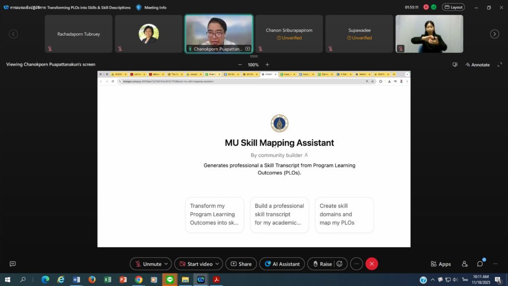 การอบรมครั้งนี้ได้รับเกียรติจากวิทยากรผู้เชี่ยวชาญ ประกอบด้วย ผู้ช่วยศาสตราจารย์ ดร.สตรีรัตน์ ธาดากานต์ ที่ปรึกษากองบริหารการศึกษา มหาวิทยาลัยมหิดล บรรยาย “หลักการและแนวคิดการจัดทำเอกสารรับรองทักษะ” (Skill Transcript) และ “หลักการได้มาของคะแนนเพื่อระบุ Performance Level ของ Skills” รองศาสตราจารย์ แพทย์หญิงสุภาวดี ประคุณหังสิต ที่ปรึกษาอธิการบดีด้านการศึกษา มหาวิทยาลัยมหิดล บรรยาย “หลักการแปลง PLOs สู่ Skill Domain และ Skill Descriptions” อาจารย์ ดร.ชนกพร พัวพัฒนกุล ผู้อำนวยการศูนย์ส่งเสริมการเรียนรู้แบบบูรณาการชีวิต มหาวิทยาลัยมหิดล บรรยาย “สาธิตการใช้ AI Standard Prompt ในการแปลง PLOs เป็น Skill Domain และ Skill Descriptions” และ “สาธิตการกรอกคะแนนเพื่อระบุ Performance Level ของ Skills” และนายชานน ศรีบูรพาภิรมย์ ผู้อำนวยการกองบริหารการศึกษา มหาวิทยาลัยมหิดล บรรยาย เรื่อง “แจ้งรายละเอียดขั้นตอนการดำเนินการสำหรับหลักสูตร” ทั้งนี้ การอบรมมีเป้าหมายเพื่อให้ประธานหลักสูตรและอาจารย์ผู้รับผิดชอบหลักสูตรระดับปริญญาตรีสามารถกำหนดชุดทักษะและคำอธิบายระดับทักษะได้อย่างชัดเจน รวมถึงช่วยสร้างฐานข้อมูลกลางสำหรับพัฒนาหลักสูตรในอนาคต และสะท้อนศักยภาพของนักศึกษาได้อย่างรอบด้าน