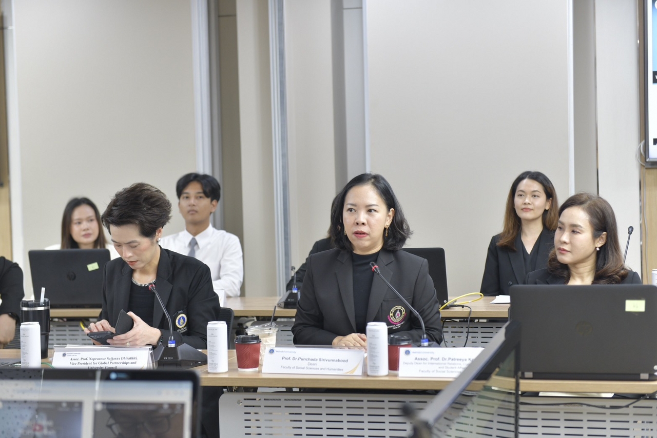 วันที่ 19 ธันวาคม 2568 รองศาสตราจารย์ ดร.นภเรณู สัจจรักษ์ ธีระฐิติ รองอธิการบดีฝ่ายวิเทศสัมพันธ์และสภามหาวิทยาลัย มหาวิทยาลัยมหิดล พร้อมด้วย ศาสตราจารย์ ดร.พรรณชฎา ศิริวรรณบุศย์ คณบดีคณะสังคมศาสตร์และมนุษยศาสตร์ และผู้ช่วยศาสตราจารย์ ดร.อภิวิชญ์ เลี้ยงอิสสระ คณบดีคณะศิลปศาสตร์ ให้การต้อนรับคณะผู้บริหารจาก Peking University สาธารณรัฐประชาชนจีน นำโดย Prof. FU Zhiming, Vice Dean, School of Foreign Language; Professor, Department of Arabic Language, Assoc. Prof. JIN Yong, Department of Southeast Asian Studies, School of Foreign Languages, Dr. ZHANG Zhe, Department of Southeast Asian Studies, School of Foreign Languages พร้อมคณะผู้แทนจาก Peking University ณ ห้องประชุม 530 สำนักงานอธิการบดี มหาวิทยาลัยมหิดล ศาลายา