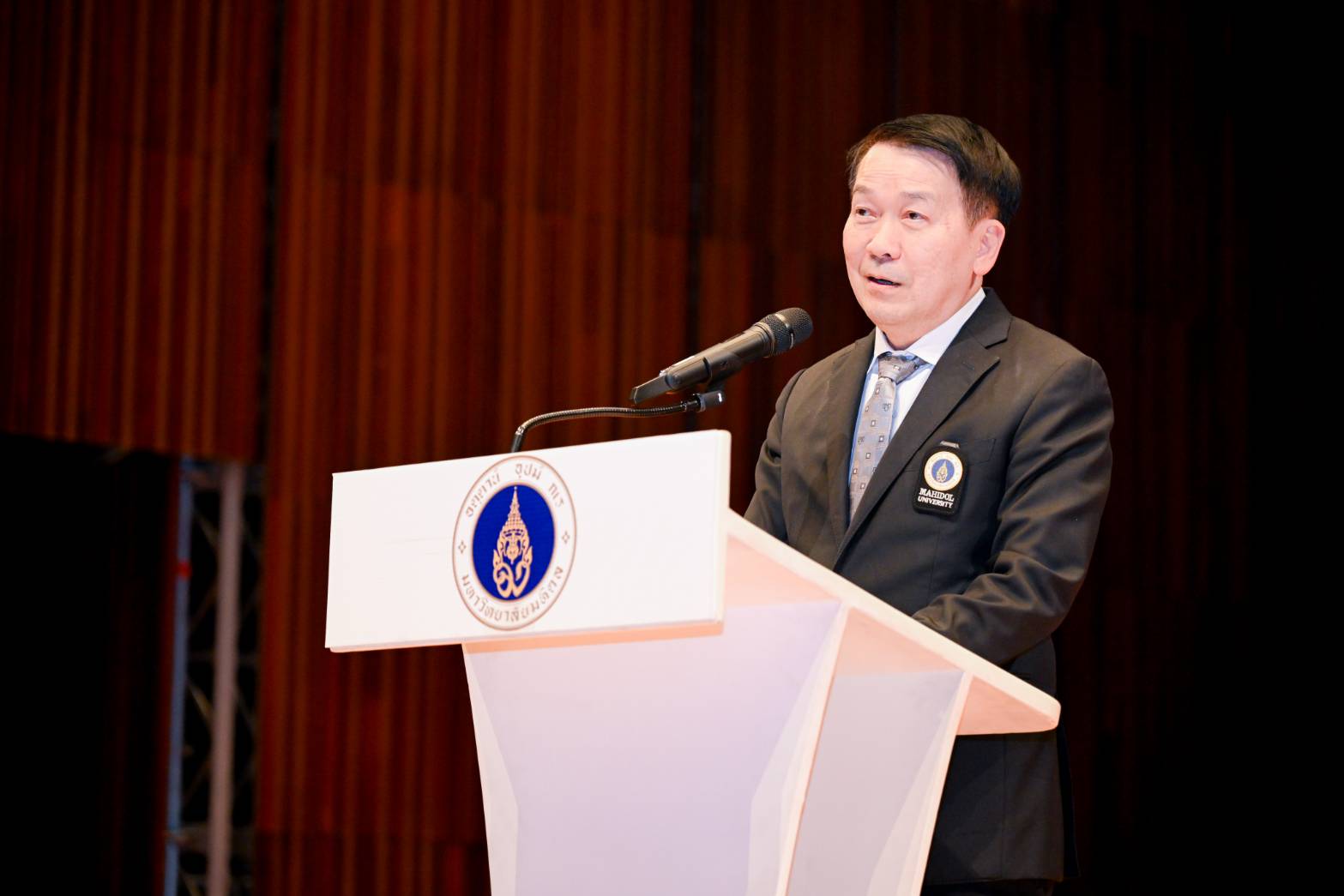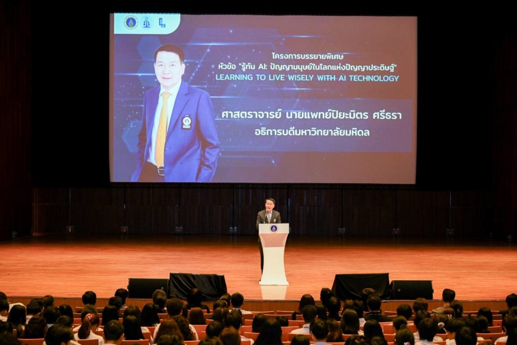 วันที่ 7 มกราคม 2569 ศาสตราจารย์ นายแพทย์ปิยะมิตร ศรีธรา อธิการบดีมหาวิทยาลัยมหิดล เป็นประธานกล่าวเปิด พร้อมให้เกียรติบรรยาย หัวข้อ “รู้ทัน AI: ปัญญามนุษย์ในโลกแห่งปัญญาประดิษฐ์” Learning to live wisely with AI technology โดยมี อาจารย์ ดร.ธิติคม พัวพันสวัสดิ์ ประธานสภาคณาจารย์ มหาวิทยาลัยมหิดล กล่าวรายงาน รองศาสตราจารย์ เรืออากาศโท ทันตแพทย์ชัชชัย คุณาวิศรุต รองอธิการบดีฝ่ายกิจการนักศึกษาและศิษย์เก่าสัมพันธ์ มหาวิทยาลัยมหิดล และอาจารย์ ดร.ชนกพร พัวพัฒนกุล ผู้อำนวยการศูนย์ส่งเสริมการเรียนรู้แบบบูรณาการชีวิต รองศาสตราจารย์ ดร.สุชัย นพรัตน์แจ่มจำรัส อาจารย์ประจำสถาบันนวัตกรรมการเรียนรู้ มหาวิทยาลัยมหิดล และคณะกรรมการบริหารรายวิชา มมศท 100 เข้าร่วมงาน ซึ่งมี นักศึกษาที่ลงทะเบียนรายวิชา มมศท 100 การศึกษาทั่วไปเพื่อการพัฒนามนุษย์ จำนวน 4,000 คน และอาจารย์ผู้สอน เข้าร่วมรับฟังการบรรยาย ณ มหิดลสิทธาคาร มหาวิทยาลัยมหิดล และถ่ายทอดสัญญาณผ่าน IPTV ห้อง 217 – 219 อาคารสิริวิทยา คณะศิลปศาสตร์ มหาวิทยาลัยมหิดล ศาลายา