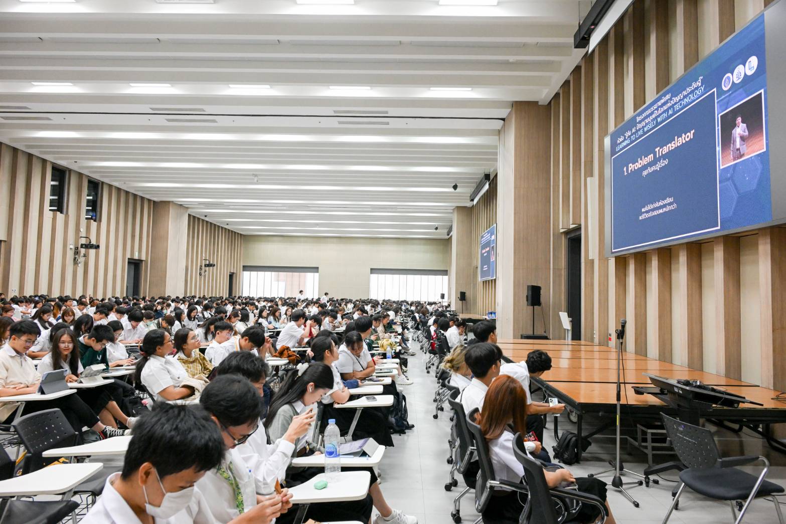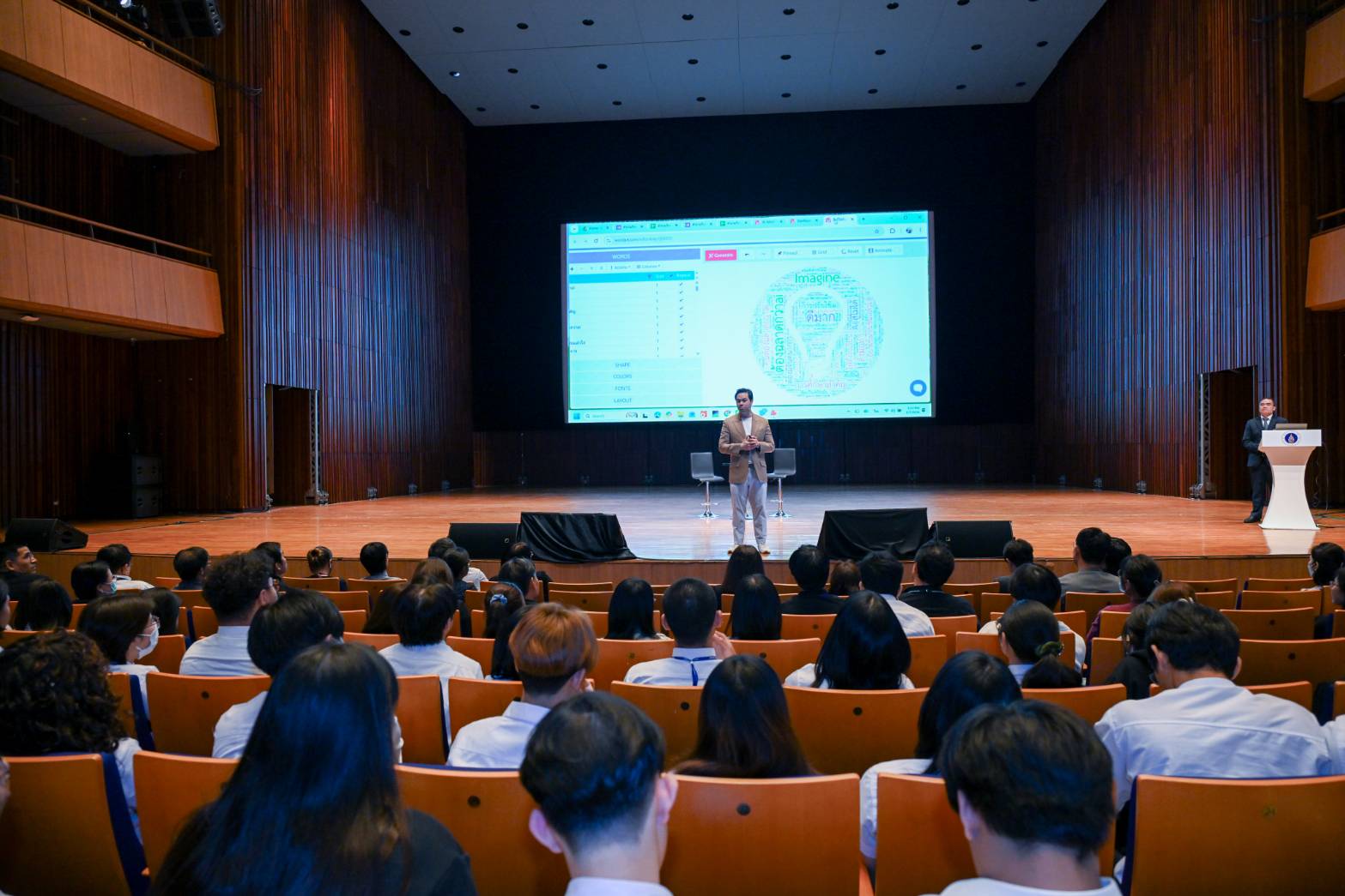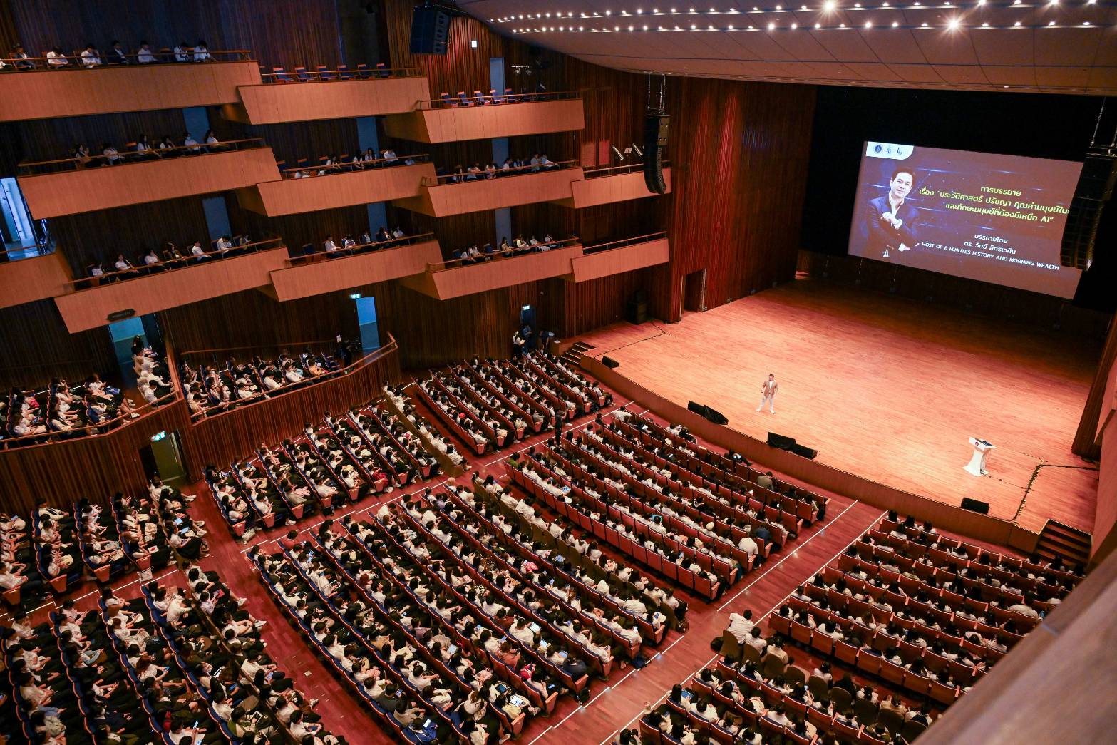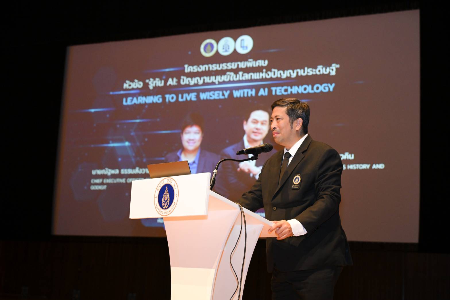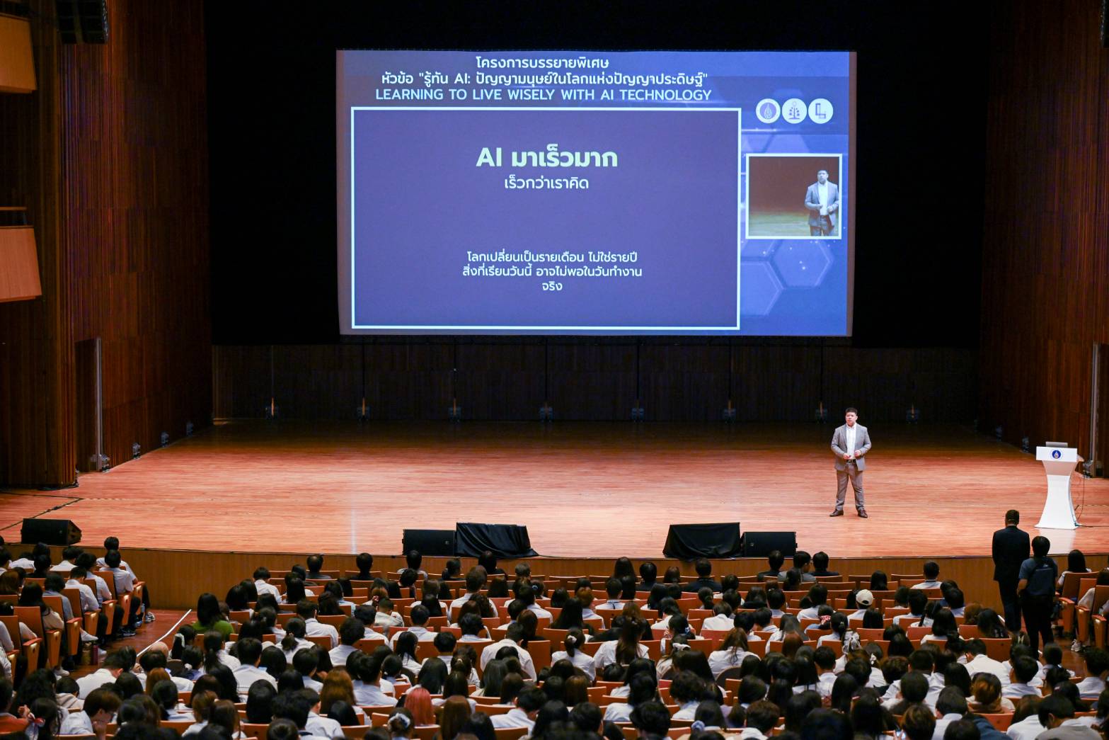 การบรรยายในครั้งนี้ ได้รับเกียรติจาก ดร.วิทย์ สิทธิเวคิน โฮสต์รายการ 8 Minute History และ Morning Wealth เป็นวิทยากรบรรยาย เรื่อง “ประวัติศาสตร์ ปรัชญา คุณค่ามนุษย์ในยุค AI และทักษะมนุษย์ ที่ต้องมีเหนือ AI” และนายณัฐพล ธรรมสังวาล Chief Executive Officer (CEO), GoDigit เป็นวิทยากรบรรยาย เรื่อง “AI Literacy การนำ AI ไปใช้ให้เกิดประโยชน์ในชีวิตจริงและ Tech Startup เพื่อสร้างความรู้ความเข้าใจที่สมดุลระหว่างเทคโนโลยีปัญญาประดิษฐ์ (AI) และคุณค่าของปัญญามนุษย์ ผ่านมุมมองเชิงปรัชญา คุณค่า ความเป็นมนุษย์ เทคโนโลยี การปฏิบัติจริง เพื่อต่อยอดในการช่วยเหลือผู้เรียนได้นำความเข้าใจเชิงคุณค่าไปสู่โลกจริง เช่น การเรียน การทำงาน และการใช้ชีวิต และการเตรียมพร้อมรับมือกับ AI มองเห็นคุณค่าของตนเองในฐานะมนุษย์ เข้าใจความแตกต่างระหว่างความฉลาดของ AI กับปัญญาของมนุษย์ และสามารถประยุกต์ใช้เทคโนโลยี AI ในการเรียนและการใช้ชีวิตได้อย่างมีวิจารณญาณและจริยธรรม