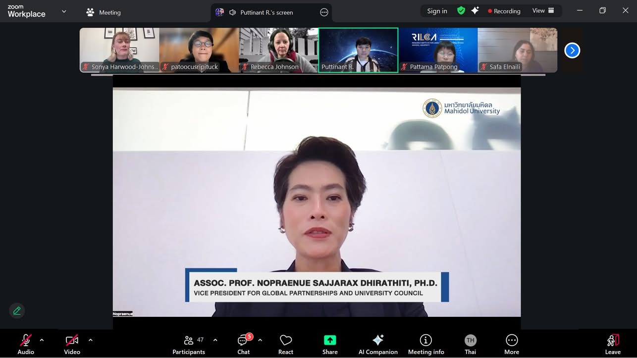 วันที่ 30 มกราคม 2569 รองศาสตราจารย์ ดร.นภเรณู สัจจรักษ์ ธีระฐิติ รองอธิการบดีฝ่ายวิเทศสัมพันธ์และสภามหาวิทยาลัย มหาวิทยาลัยมหิดล เป็นประธานกล่าวเปิดงาน เสวนาวิชาการออนไลน์ หัวข้อ “Behind the Scenes of Mortuary Exhibitions: Research-Based Curation, Language, and Lived Beliefs” โดยมี ผู้ช่วยศาสตราจารย์ ดร.ณรงเดช พันธะพุมมี รองผู้อำนวยการฝ่ายวิจัยและวิเทศสัมพันธ์ สถาบันวิจัยภาษาและวัฒนธรรมเอเชีย มหาวิทยาลัยมหิดล กล่าวต้อนรับ จัดโดย พิพิธภัณฑ์มานุษยวิทยาวัฒนธรรม ร่วมกับ พิพิธภัณฑ์บ้านกอร์กาส และเครือพิพิธภัณฑ์มหาวิทยาลัยอลาบามา สหรัฐอเมริกา ผ่านระบบออนไลน์