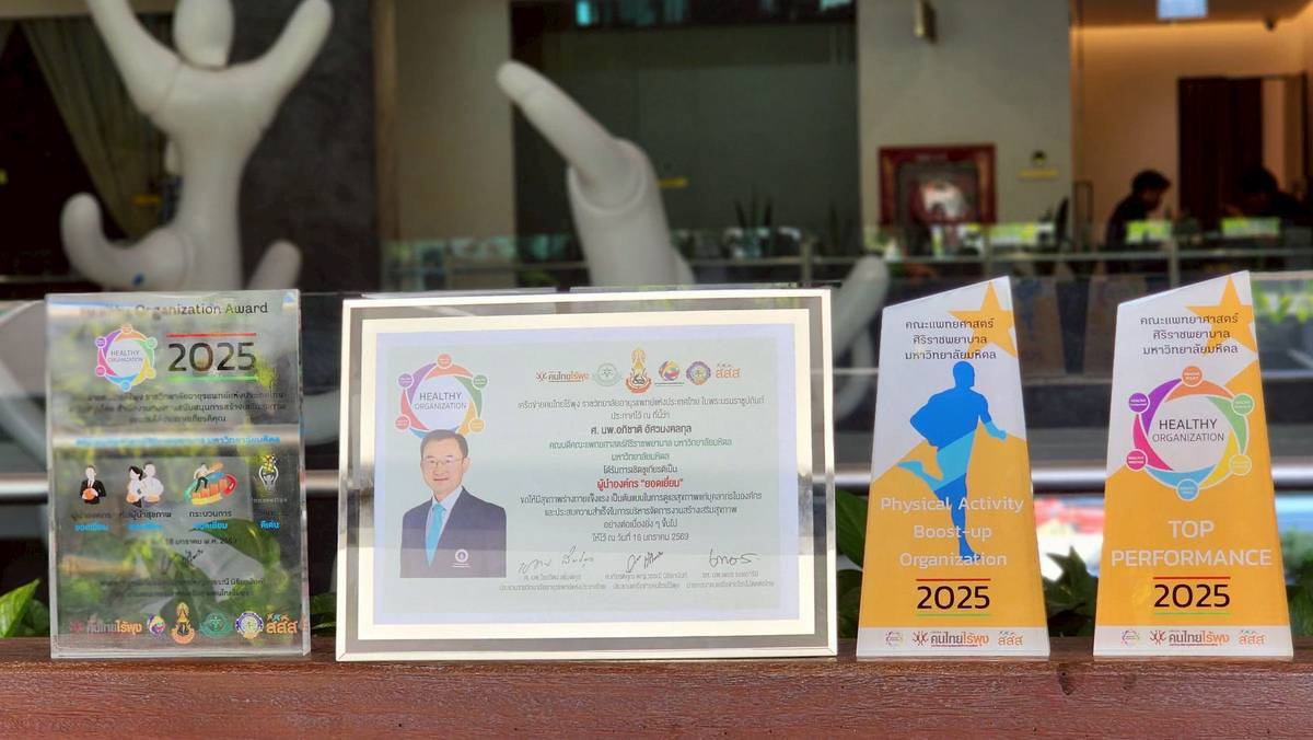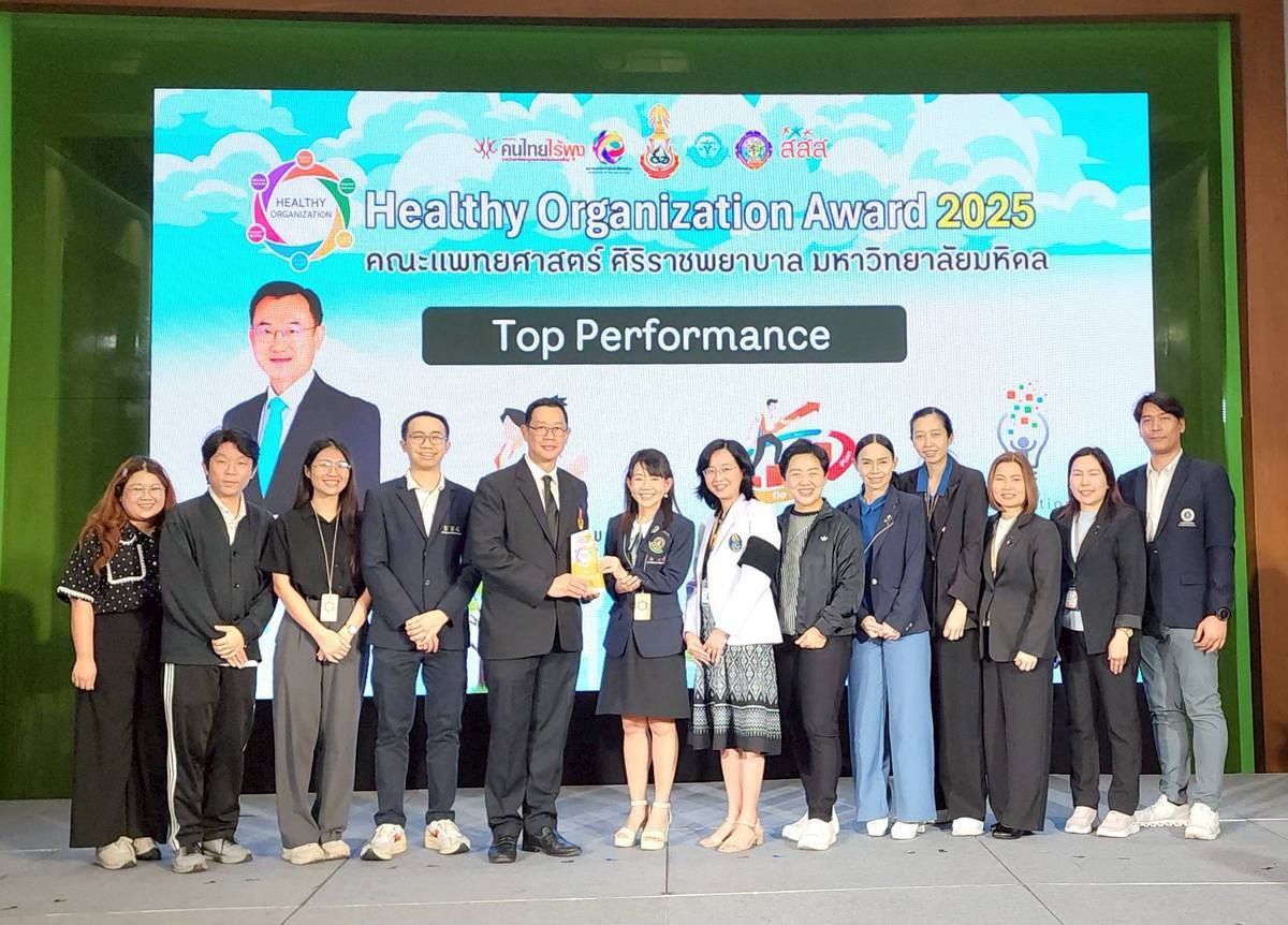 วันที่ 16 มกราคม 2569 มหาวิทยาลัยมหิดล รับรางวัล Healthy Organization Award ประจำปี 2568 โดยมี ศาสตราจารย์ นายแพทย์อภิชาติ อัศวมงคลกุล คณบดีคณะแพทยศาสตร์ศิริราชพยาบาล มหาวิทยาลัยมหิดล พร้อมด้วย ศาสตราจารย์คลินิก นายแพทย์อาทิตย์ อังกานนท์ คณบดีคณะแพทยศาสตร์โรงพยาบาลรามาธิบดี มหาวิทยาลัยมหิดล ได้รับรางวัลผู้นำองค์กร “ยอดเยี่ยม” โอกาสนี้ รองศาสตราจารย์ ดร.สราวุธ เทพานนท์ คณบดีคณะสาธารณสุขศาสตร์ มหาวิทยาลัยมหิดล ผู้ช่วยศาสตราจารย์ ดร.โชติรส พลับพลึง คณบดีคณะเทคนิคการแพทย์ มหาวิทยาลัยมหิดล ได้เข้าร่วมงานและรับรางวัล Healthy Organization Award ประจำปี 2568 จาก เครือข่ายคนไทยไร้พุง ราชวิทยาลัยอายุรแพทย์แห่งประเทศไทย โดยมี ผู้บริหารส่วนงาน คณาจารย์ เข้าร่วมรับรางวัลประเภทต่าง ๆ และร่วมแสดงความยินดี ประกอบด้วย รางวัลทีมผู้นำสุขภาพยอดเยี่ยม รางวัลกระบวนการดำเนินงาน ยอดเยี่ยม รางวัลนวัตกรรมการสร้างเสริมสุขภาพ ดีเด่น และรางวัลพิเศษ ได้แก่ Top Performance 2025, Physical Activity Boost-up 2025 รางวัลนวัตกรรมสร้างเสริมสุขภาพ “Virtual Cal Challenge Web Application” ระดับยอดเยี่ยม ณ ห้อง 201 อาคารศูนย์เรียนรู้สุขภาวะ สำนักงานกองทุนสนับสนุนการสร้างเสริมสุขภาพ กรุงเทพฯ