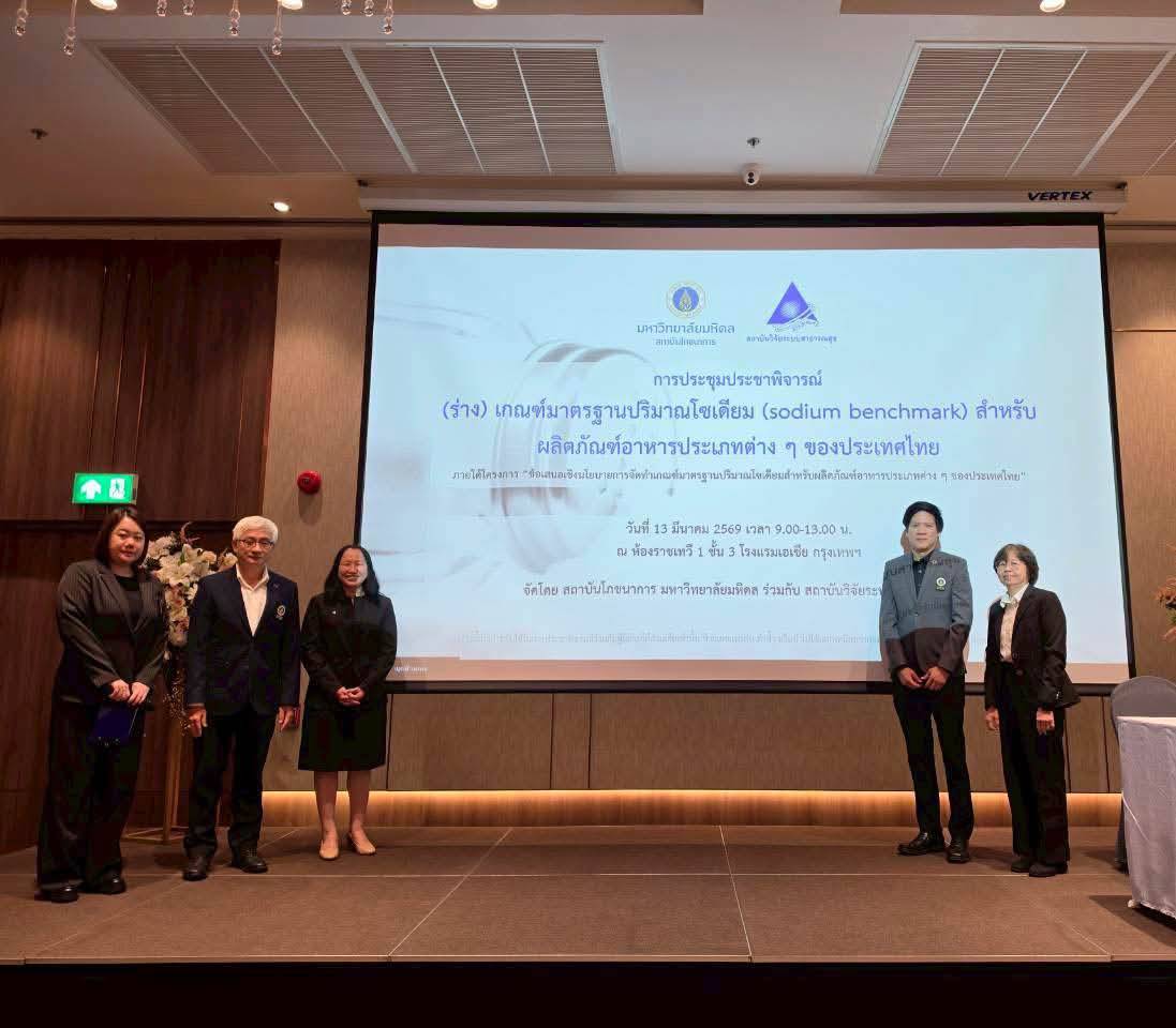 วันที่ 13 มีนาคม 2569 รองศาสตราจารย์ ดร.ชลัท ศานติวรางคณา ผู้อำนวยการสถาบันโภชนาการ มหาวิทยาลัยมหิดล เป็นประธานเปิดการประชุมประชาพิจารณ์ (ร่าง) เกณฑ์มาตรฐานปริมาณโซเดียม (Sodium Benchmark) สำหรับผลิตภัณฑ์อาหารประเภทต่าง ๆ ของประเทศไทย ณ ห้องราชเทวี ชั้น 3 โรงแรมเอเชีย กรุงเทพฯ